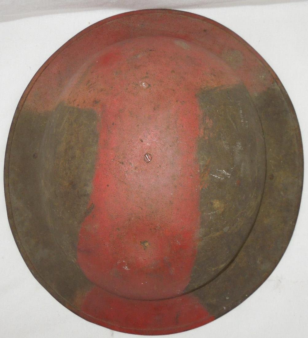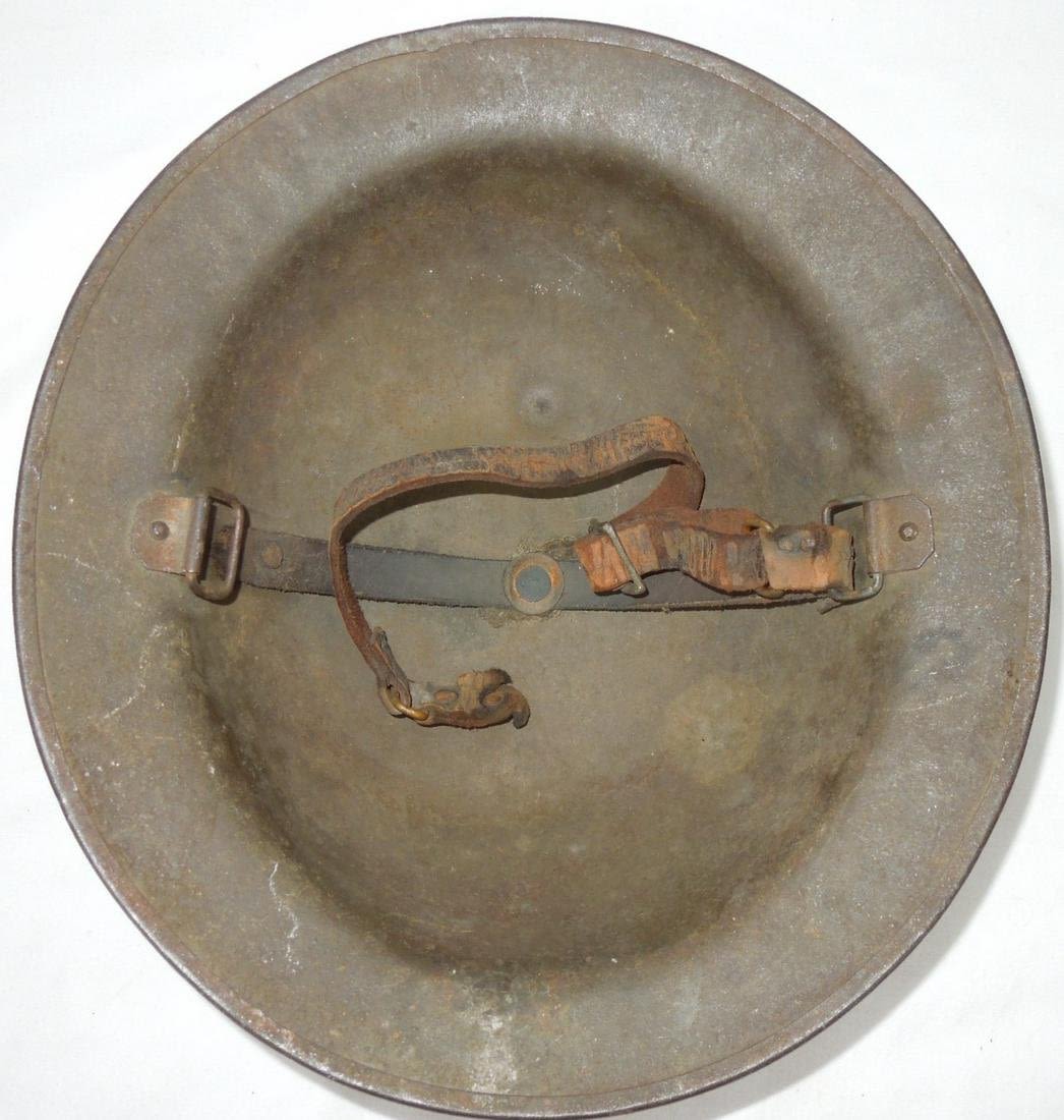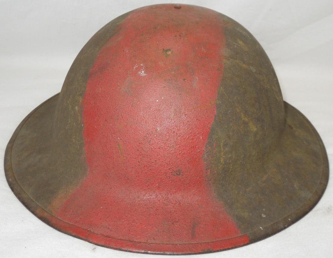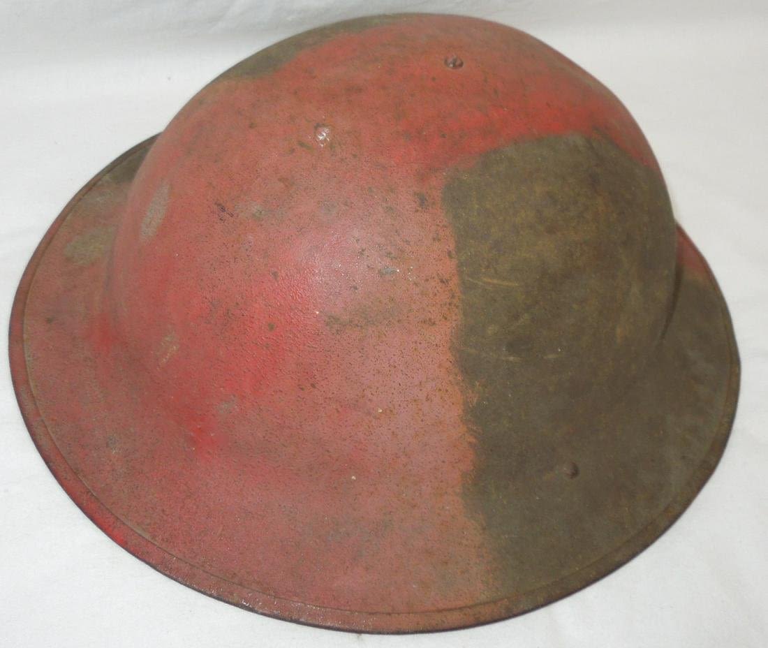 Original WWI orange type camo helmet. No liner and chinstrap is loosely attached with detachment on one side.