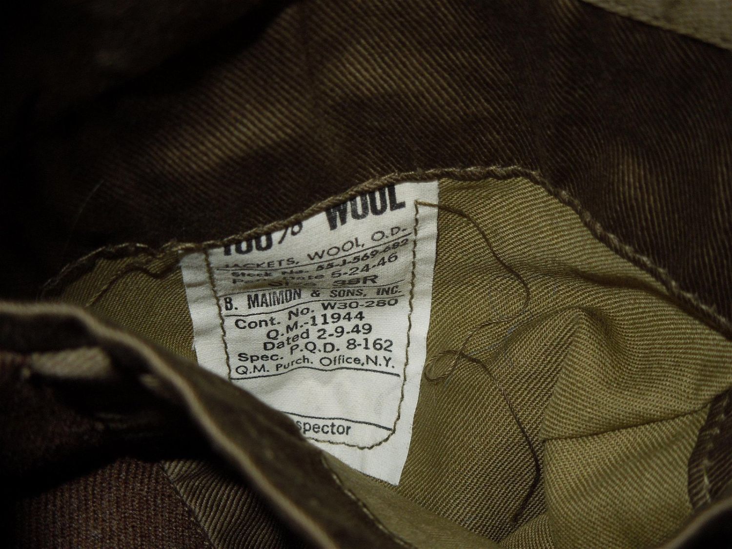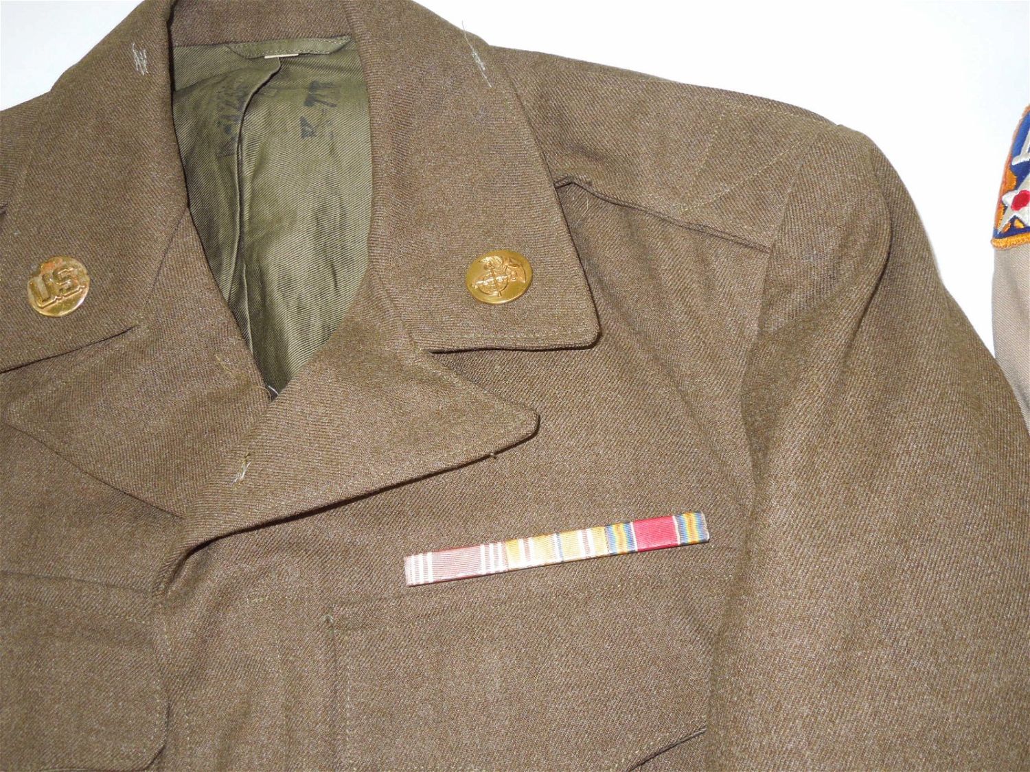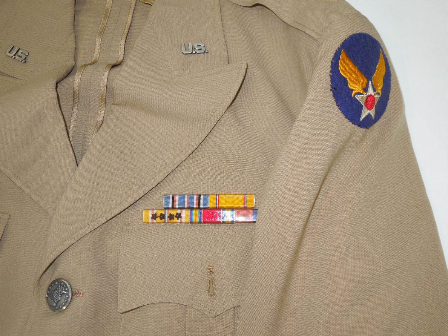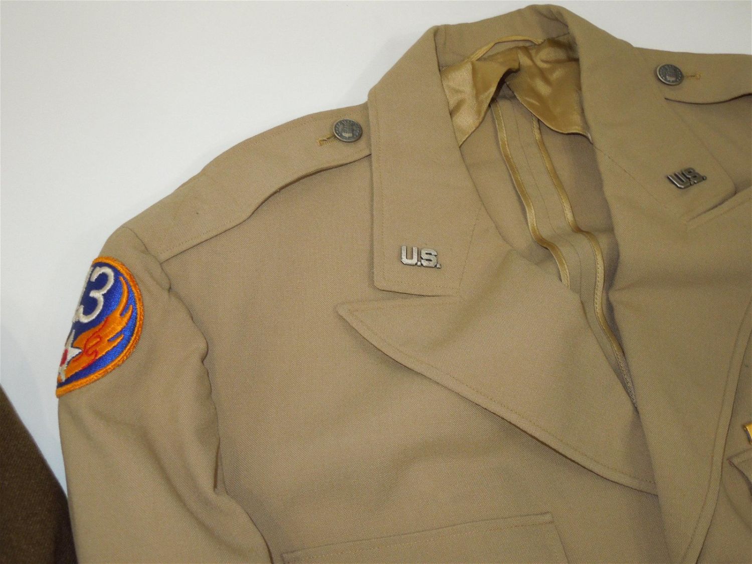 Two uniforms- 1949 dated Quartermaster Ike jacket with plastic covered ribbon bar, and a 13th AAF / Air Force transitional silver tans jacket with Wolf Brown plastic covered ribbons and patches. Missing the pocket buttons. Neither are named. Both jackets are in fair condition with the Ike having collar repairs and the khaki one being soiled from age.