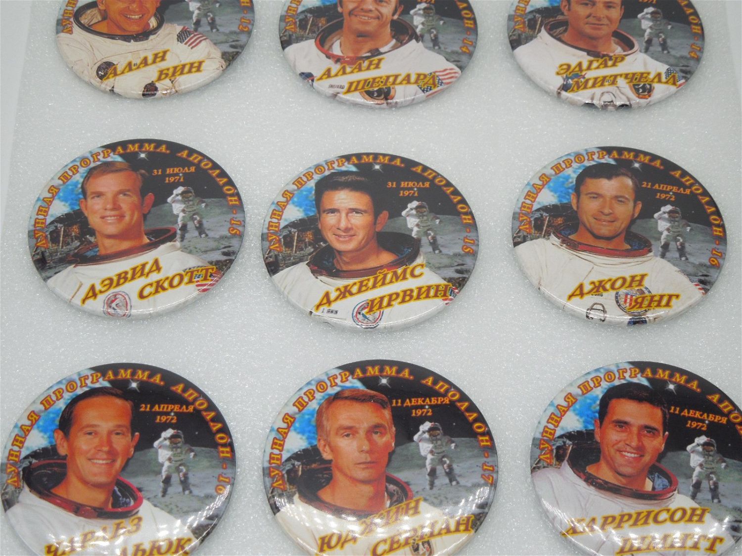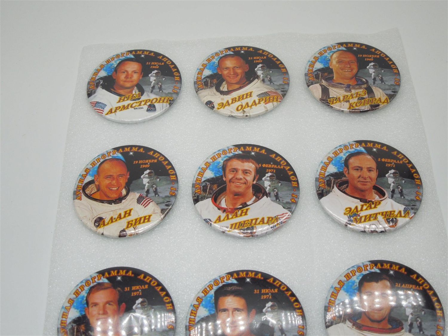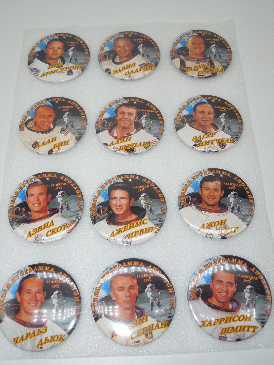 Lot of 12 original buttons depicting US NASA astronauts, with Russian writing on them. Good condition.