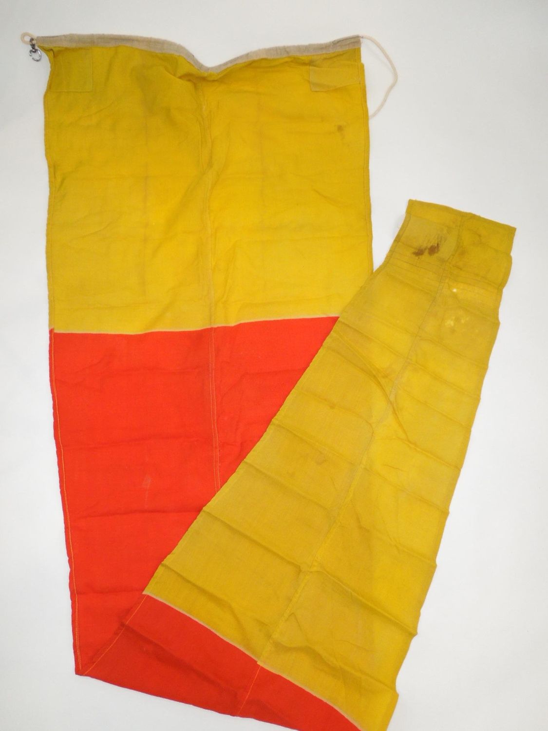 You will receive the Zero (0) Pennant Flag. From the International Code of Signals, these nautical pennants are made from fabric with stitched seams, canvas heading, and rope. This was used to represent the numerical character for use in a message between ships. Approximate size for the Zero (0) Pennant is 30 x 103 inches. The condition of the Zero Pennant is in used salty condition with some sort of black mark and small hole on the end.