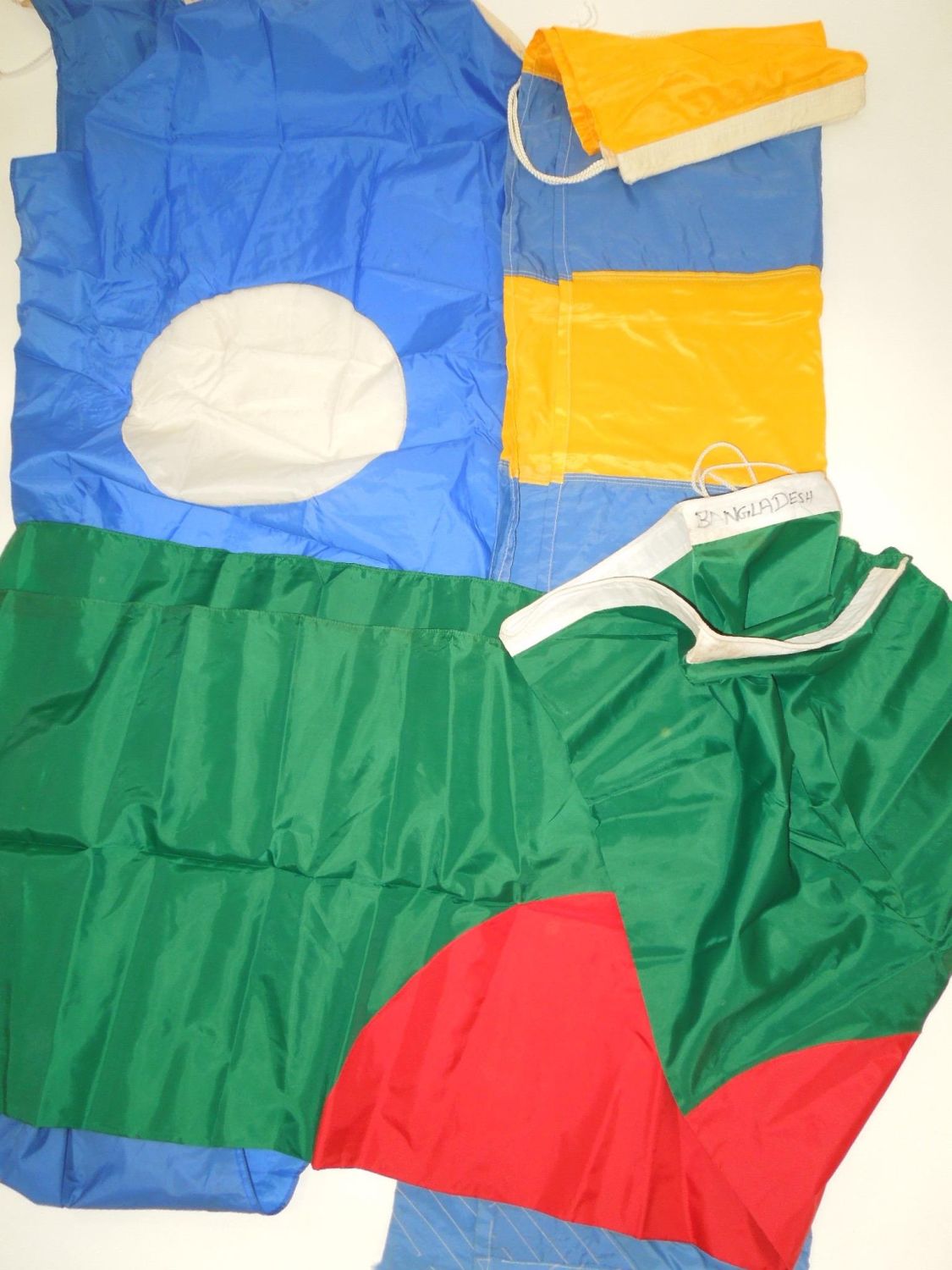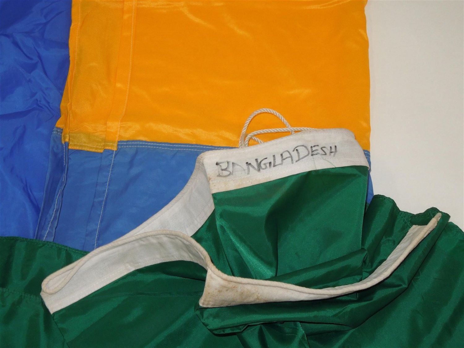 Ship Boat Bangladesh and International Code Maritime Number and Alphabet Signal Flags. You will receive the following flags. Bangladesh flag, Golf (G) (I require a pilot) rectangular alphabet signal flag and pennant two (2) number signal flag. The Bangladesh flag is made of a nylon type material with a canvas header and rope. The approximate size is 44 x 70 inches. The Golf (G) alphabet flag is made of a heavy nylon type material with a canvas header and rope. The approximate size is 55 x 65 inches. The pennant number signal flag is made of nylon and the approximate size is 33 x 100 inches. Nice usable condition for this lot.