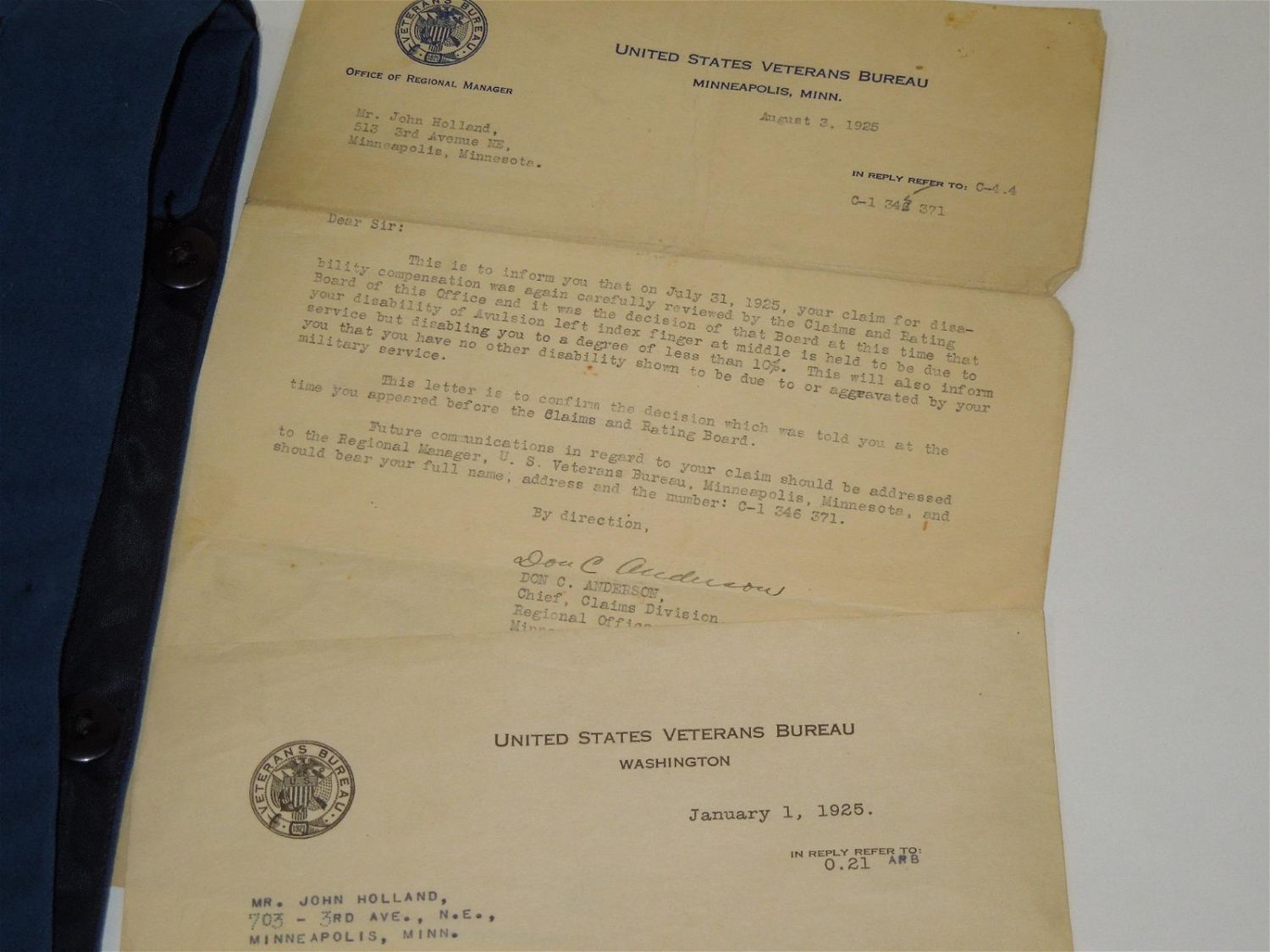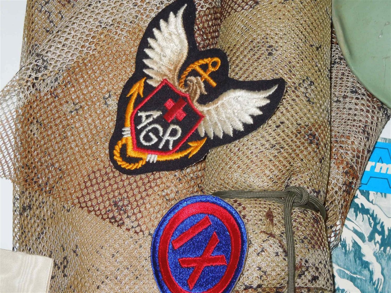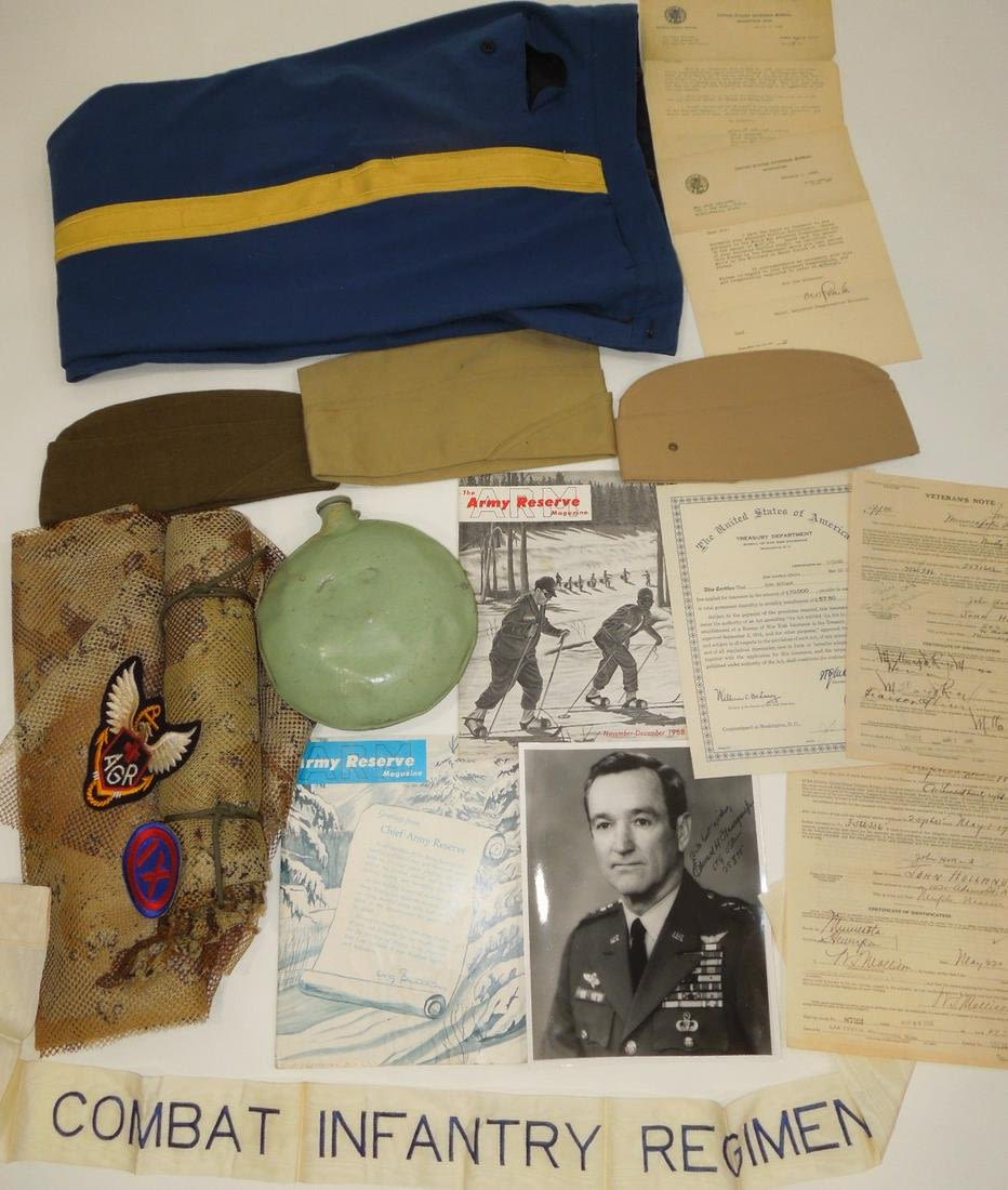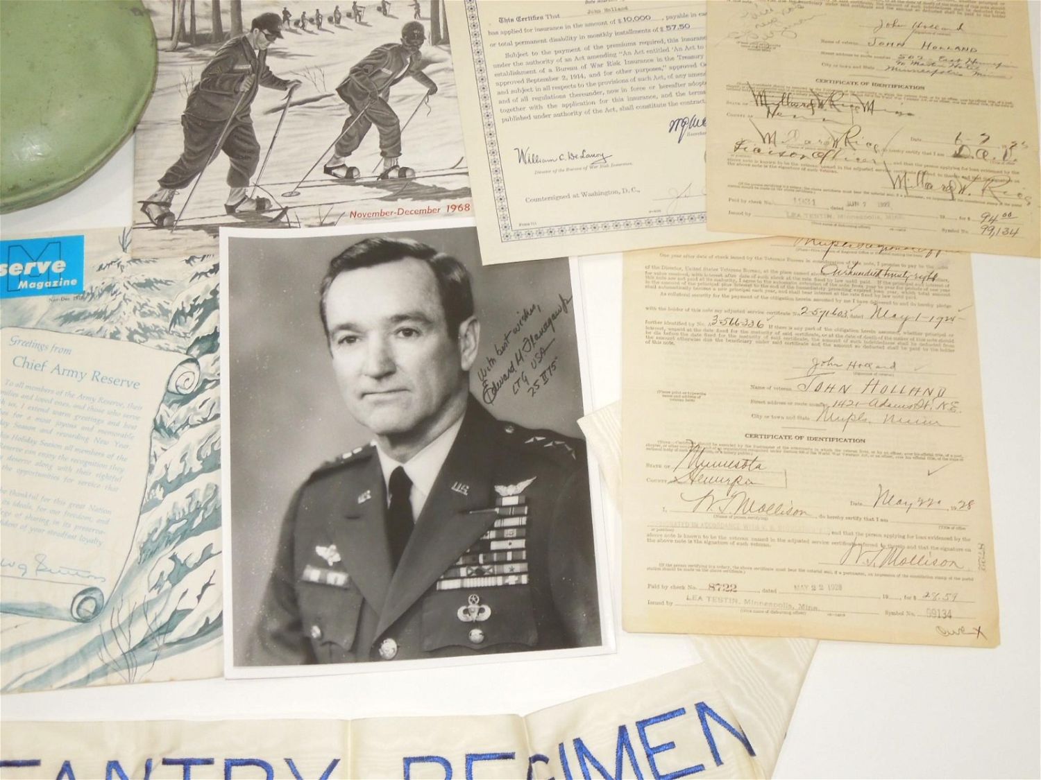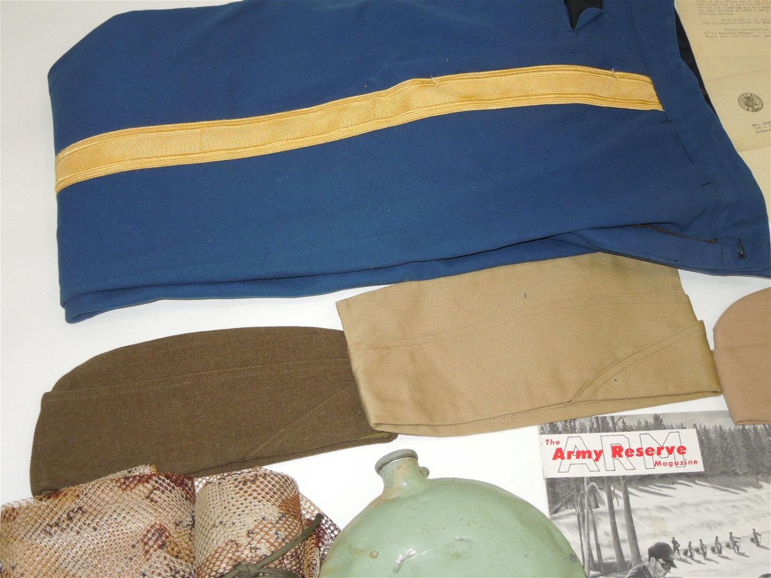 Misc. unrelated group of militaria. Officer dress blue pants named to a USMA Grad who was a Major in the 60’s, overseas caps (USMC and Army), patches, WWI veteran’s bonus paperwork, 1960’s Reservist magazines, copy of a signed photo of Gen. John Flanagan, and more as shown.