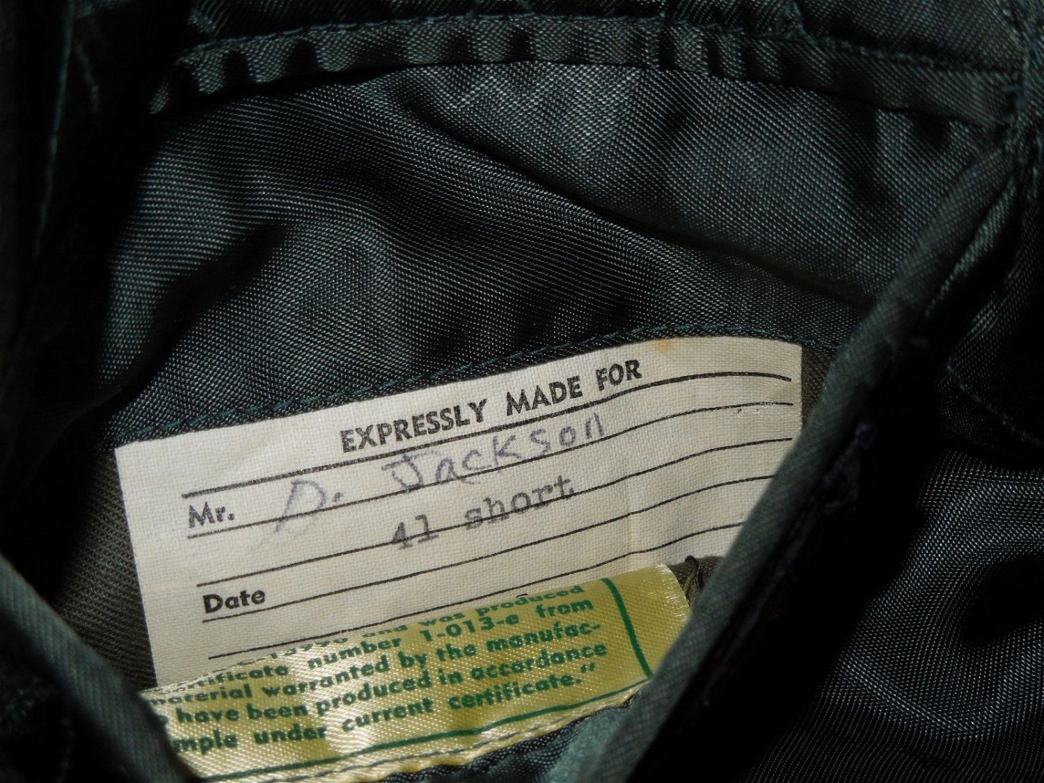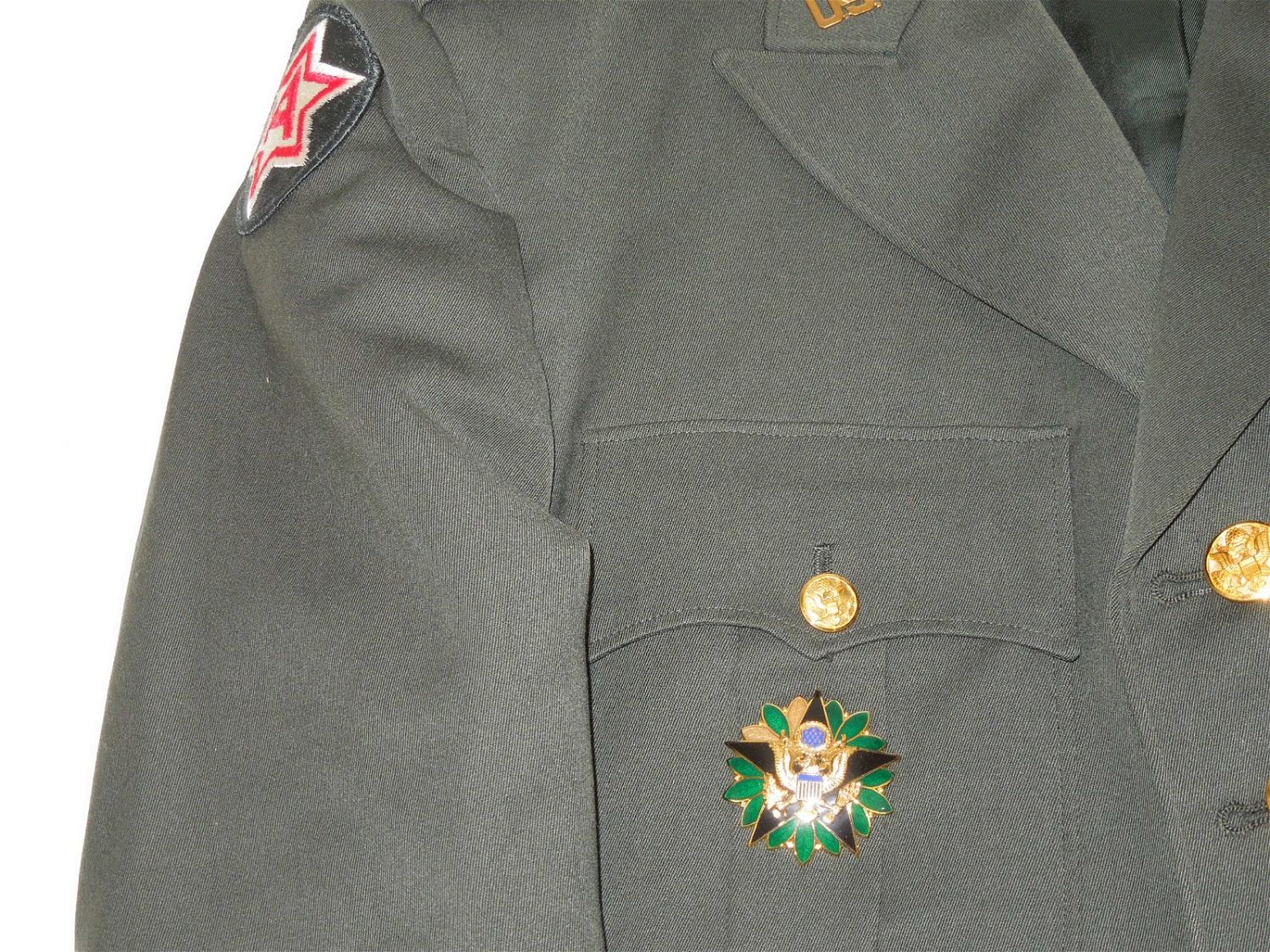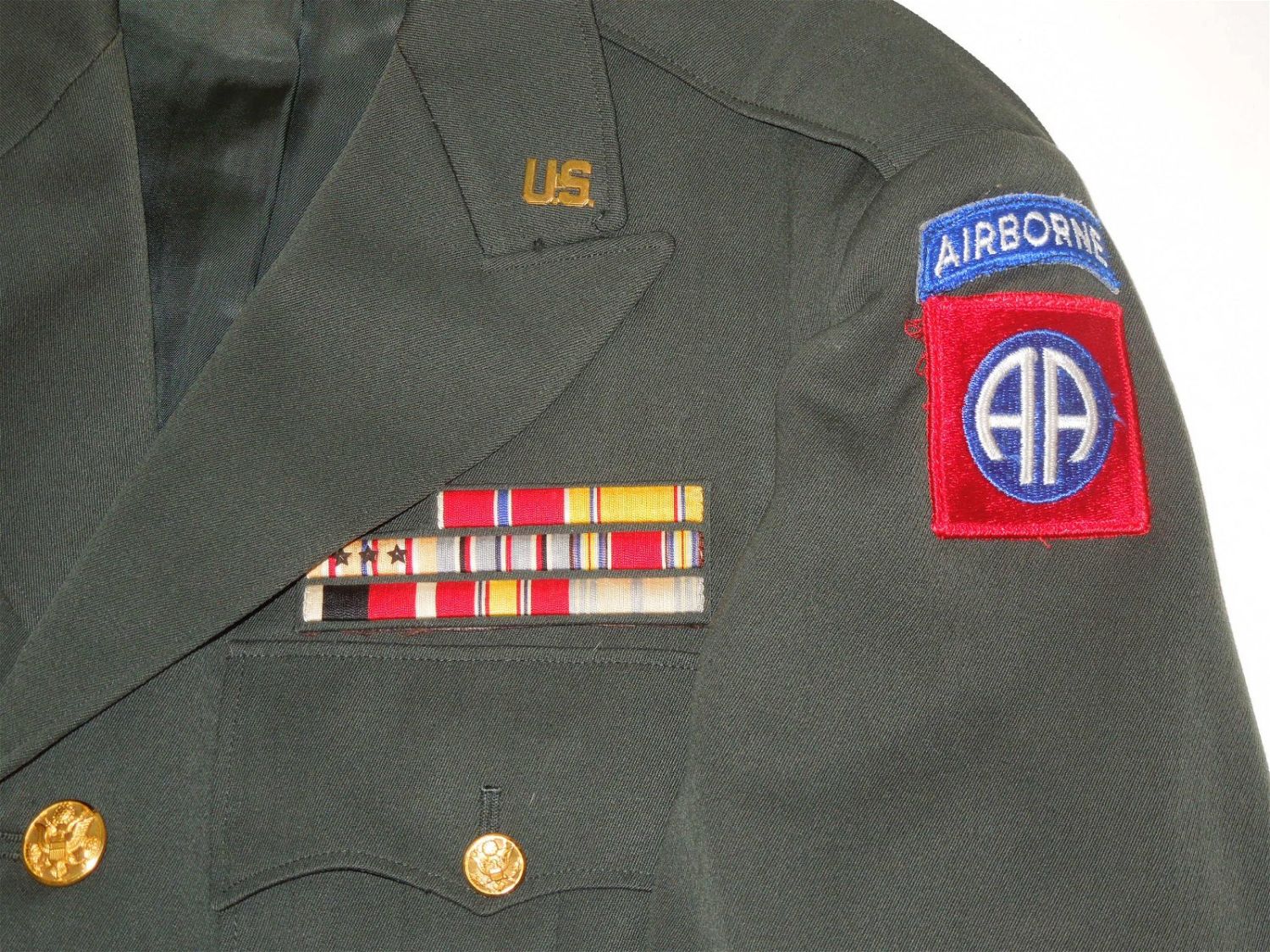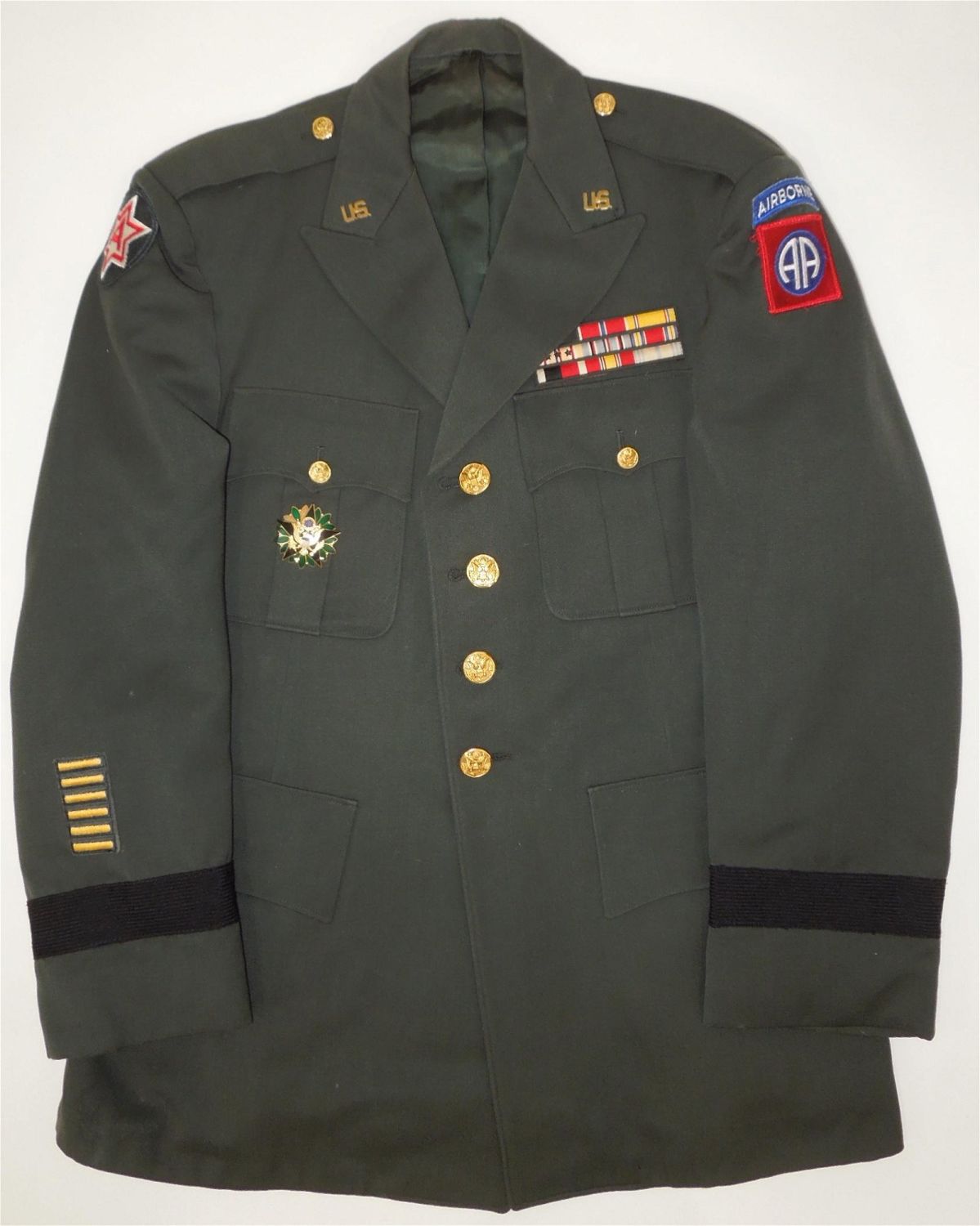 1960s era US Army General Officer dress green jacket named to D. Jackson in a size 41S. It has a cut edge 82nd Airborne tab and merrowed edge patch, Sixth Army combat patch, and pin on custom embroidered one piece ribbon bar with Bronze Star and Pacific Theater service in WWII. The pocket has a General Staff badge on it (some enamel missing at the top left). Overall good condition piece except part of patch removed at one corner.