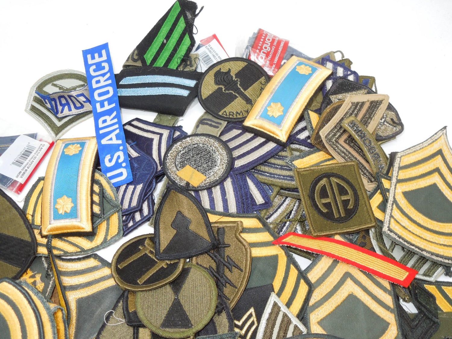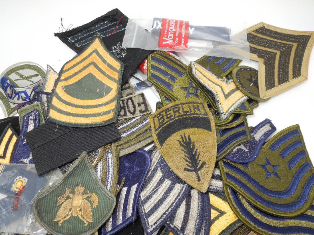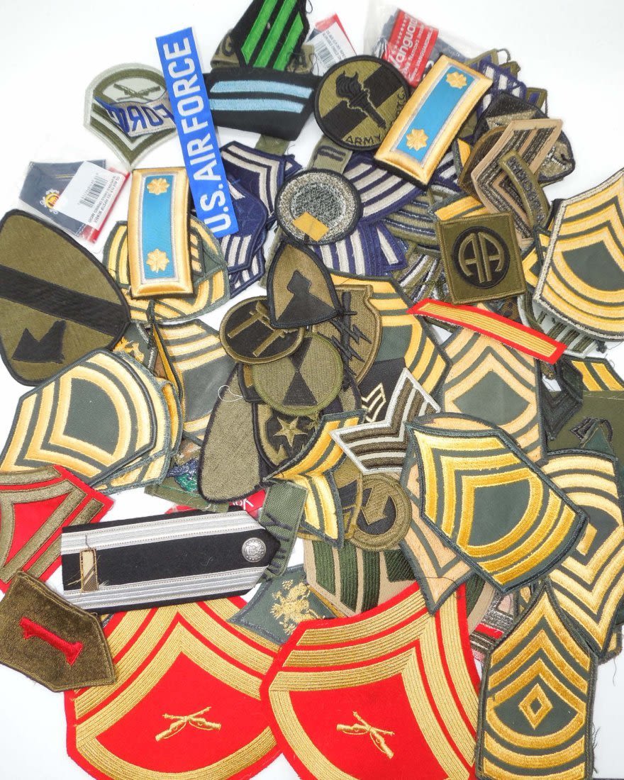 Approximately 1.5 lbs of 1960s to modern US Military rank stripes, tapes, and patches from various branches. Condition ranges from used to new.