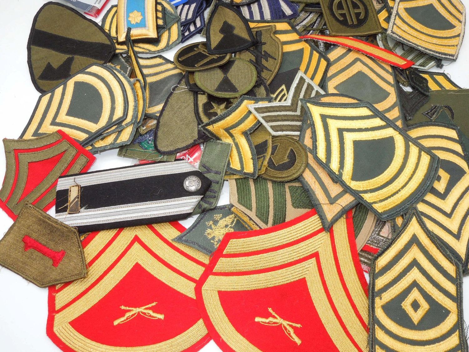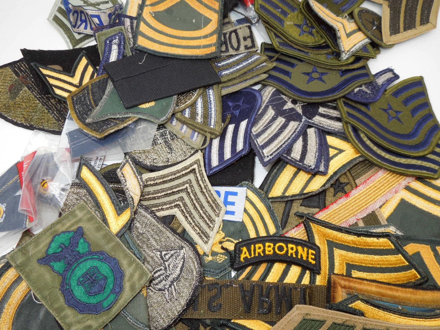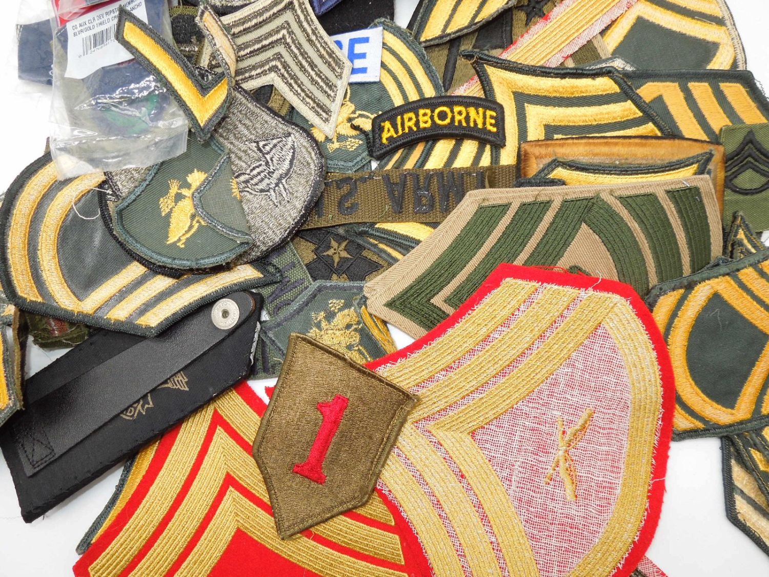 Approximately 1.5 lbs of 1960s to modern US Military rank stripes, tapes, and patches from various branches. Condition ranges from used to new.