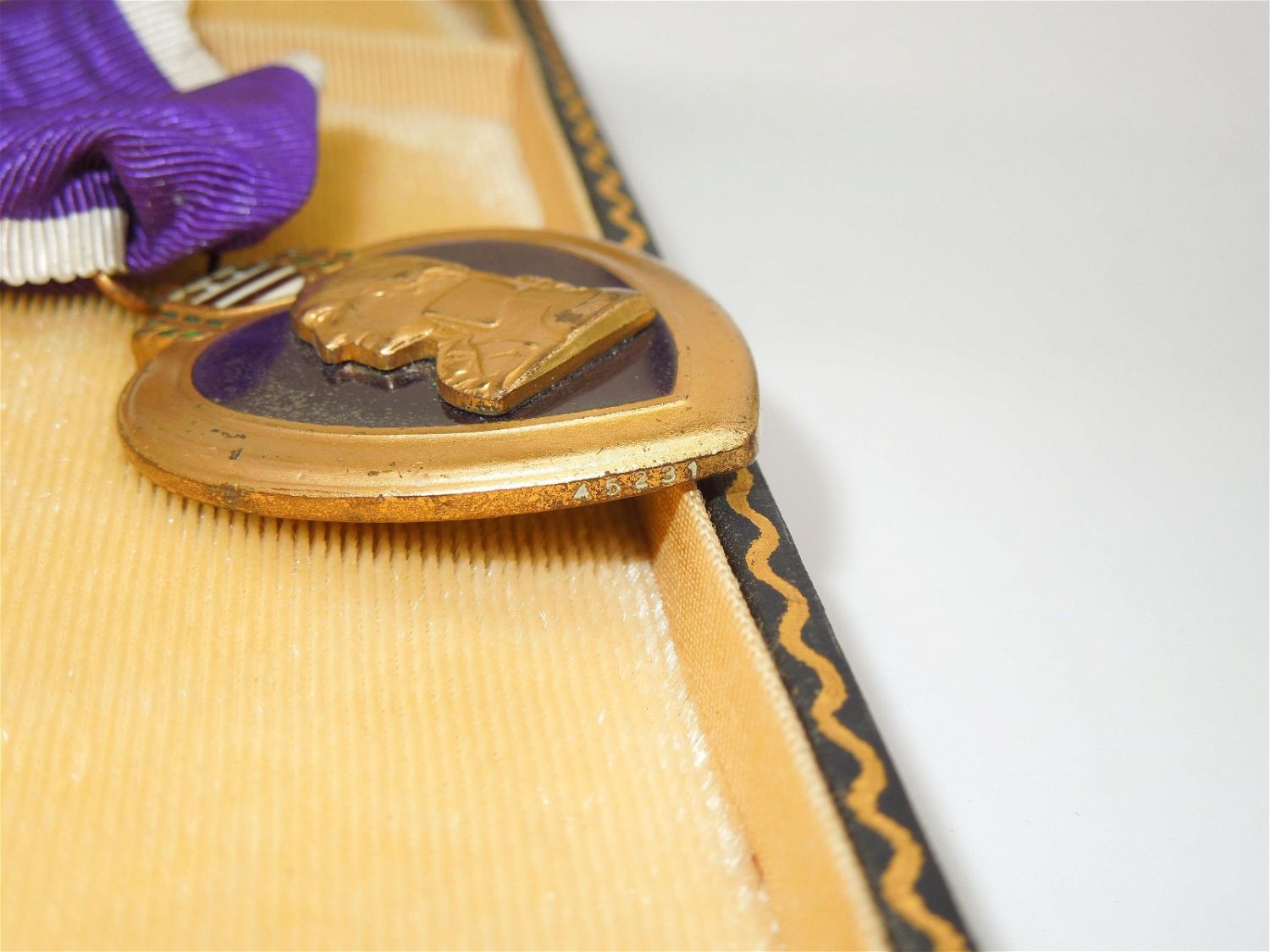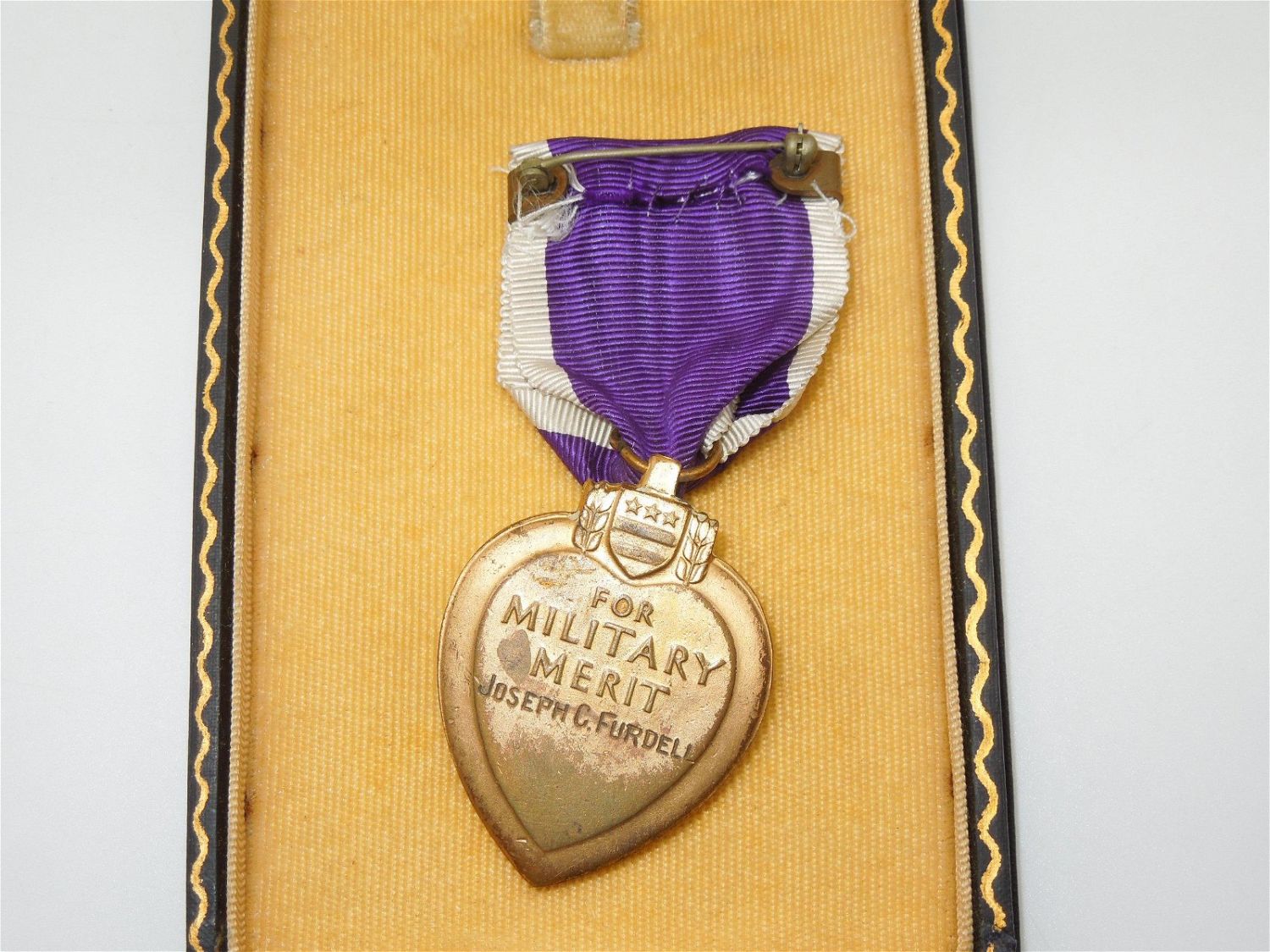 Original 1930s government hand engraved numbered and engraved Purple Heart to Pvt. Joseph C. Furdell of Kenmore, NY who served in Co. C., 312th Infantry, 78th Division in France in WWI. The medal numbered 45231, is a split brooch, and the ribbon may be a later re-ribbon given the color.