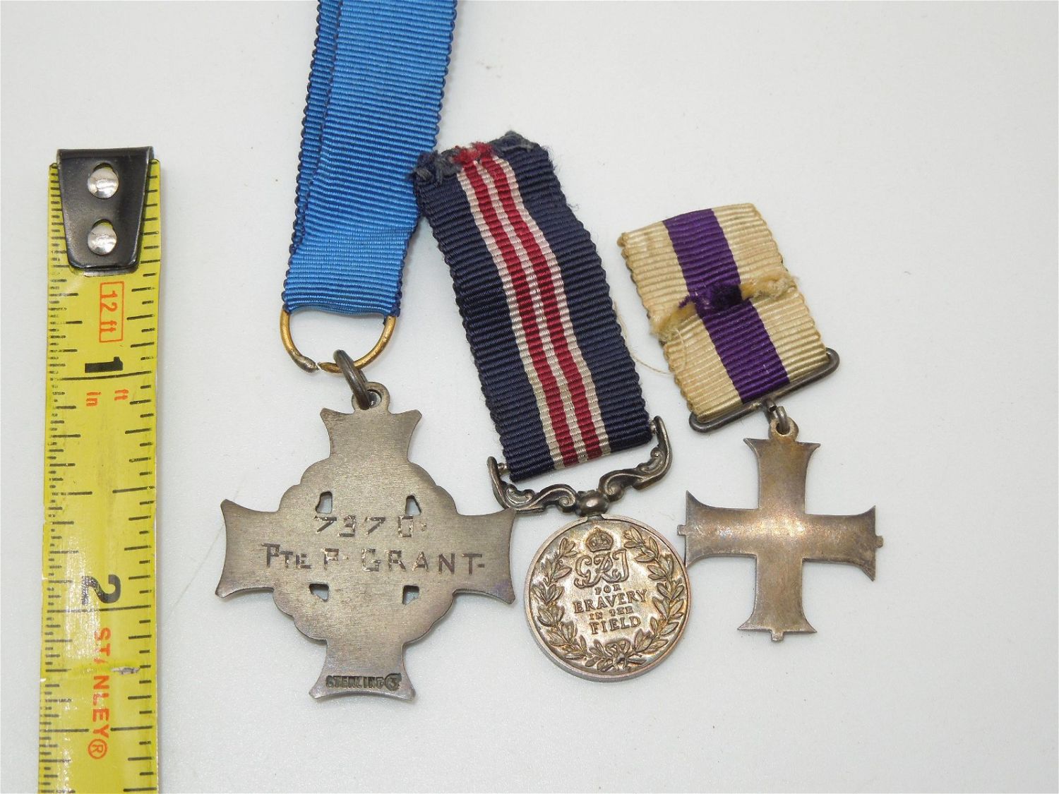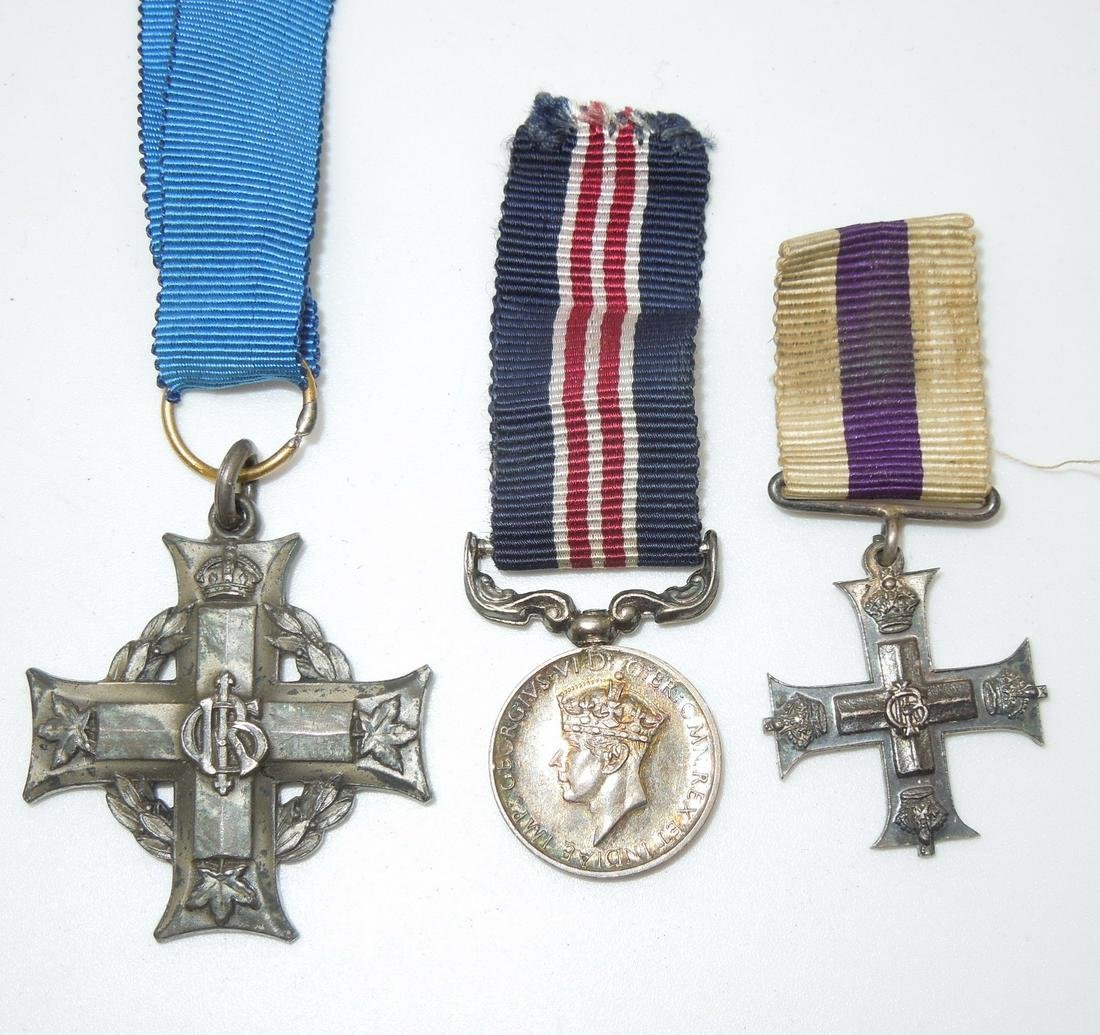 Lot of three medals. The Memorial Cross is sterling and unresearched. Also included is a miniature period Military Medal and a Mlitary Cross. Good condition.