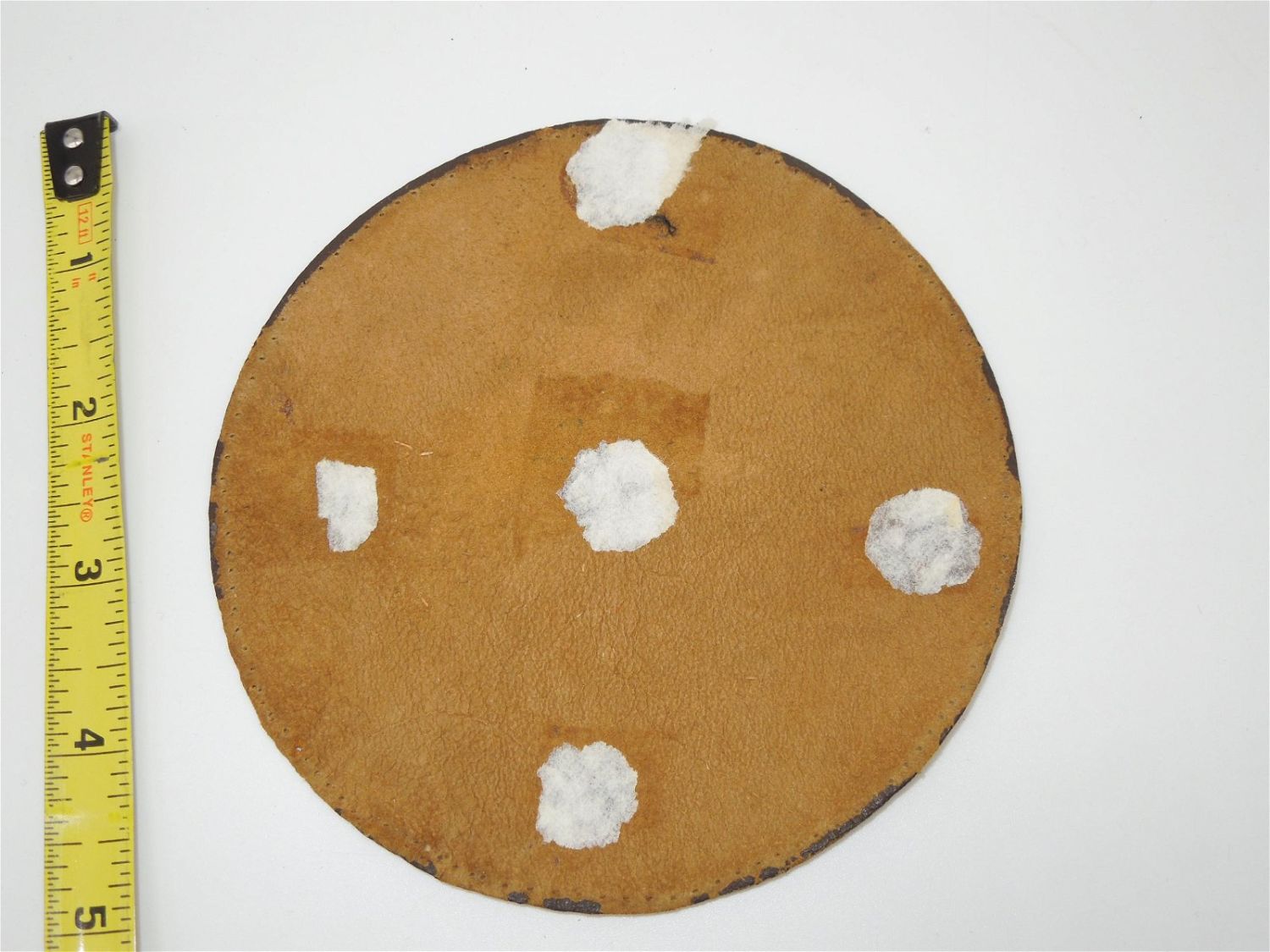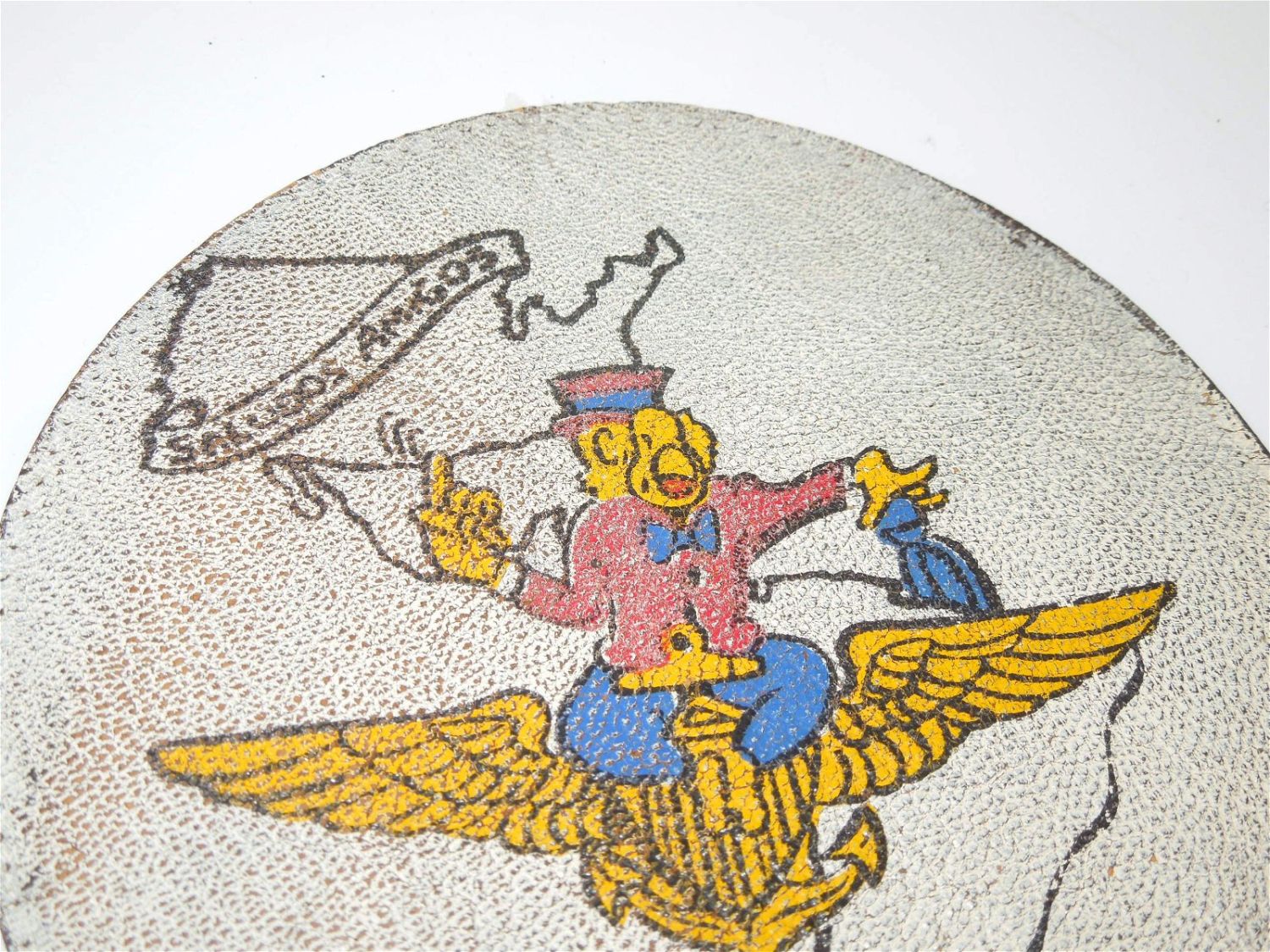 Original WWII hand painted on leather patch depicting Jose Carioca of the Disney production Saludos Amigos dropping a bomb while riding atop a set of Naval Aviator Wings. Unknown what specific unit this is. The patch was previously sewn as evidenced by stitch marks on the edges, and has some paper and glue residue on the back.