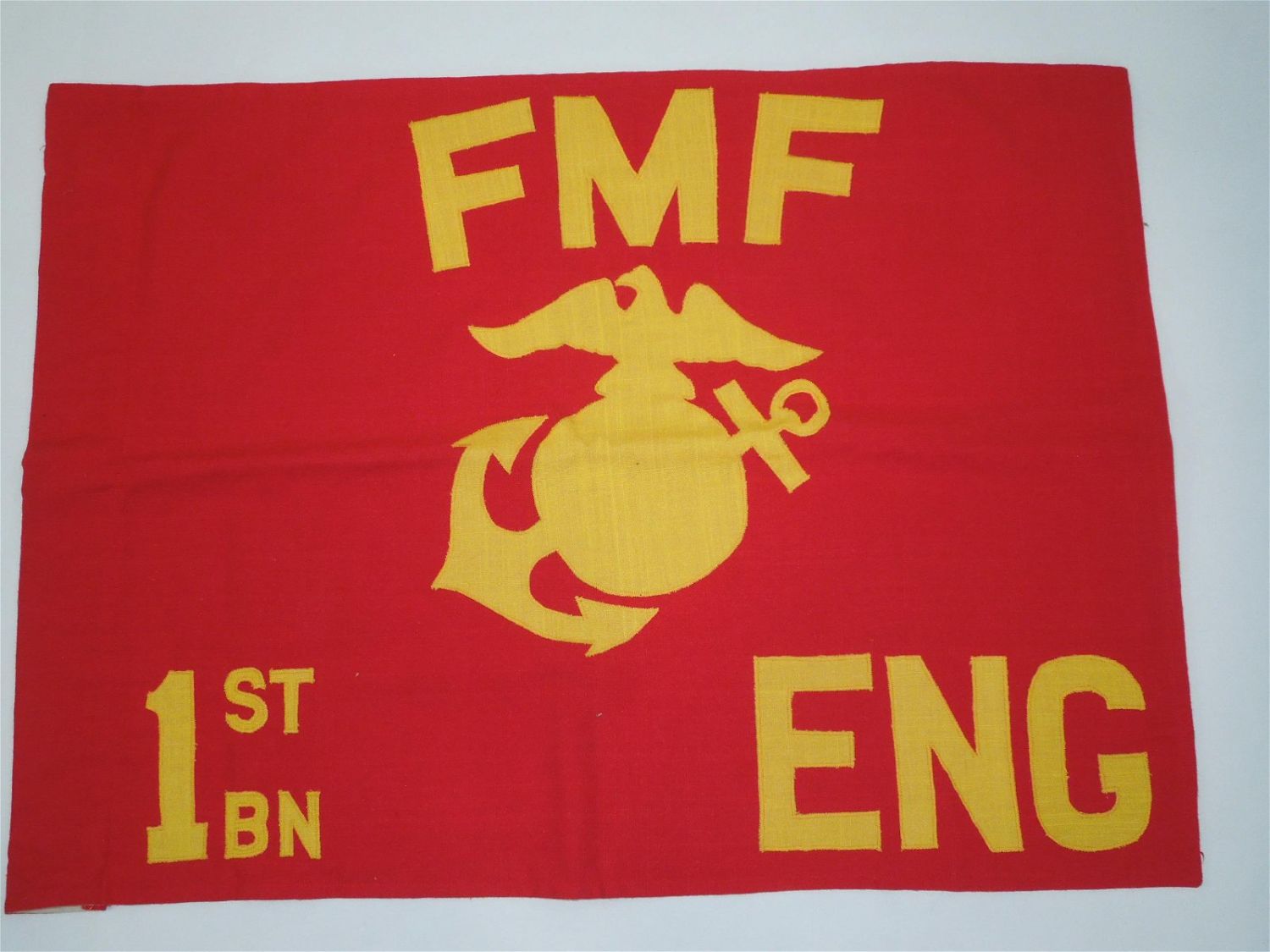 1950s USMC Marine Corps Fleet Marine Force FMF 1st Engineer Battalion Guidon. Embroidered lettering on heavy cotton fabric. Size is 21 x 28 inches. The condition is excellent.