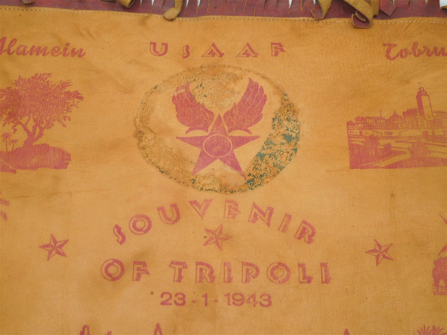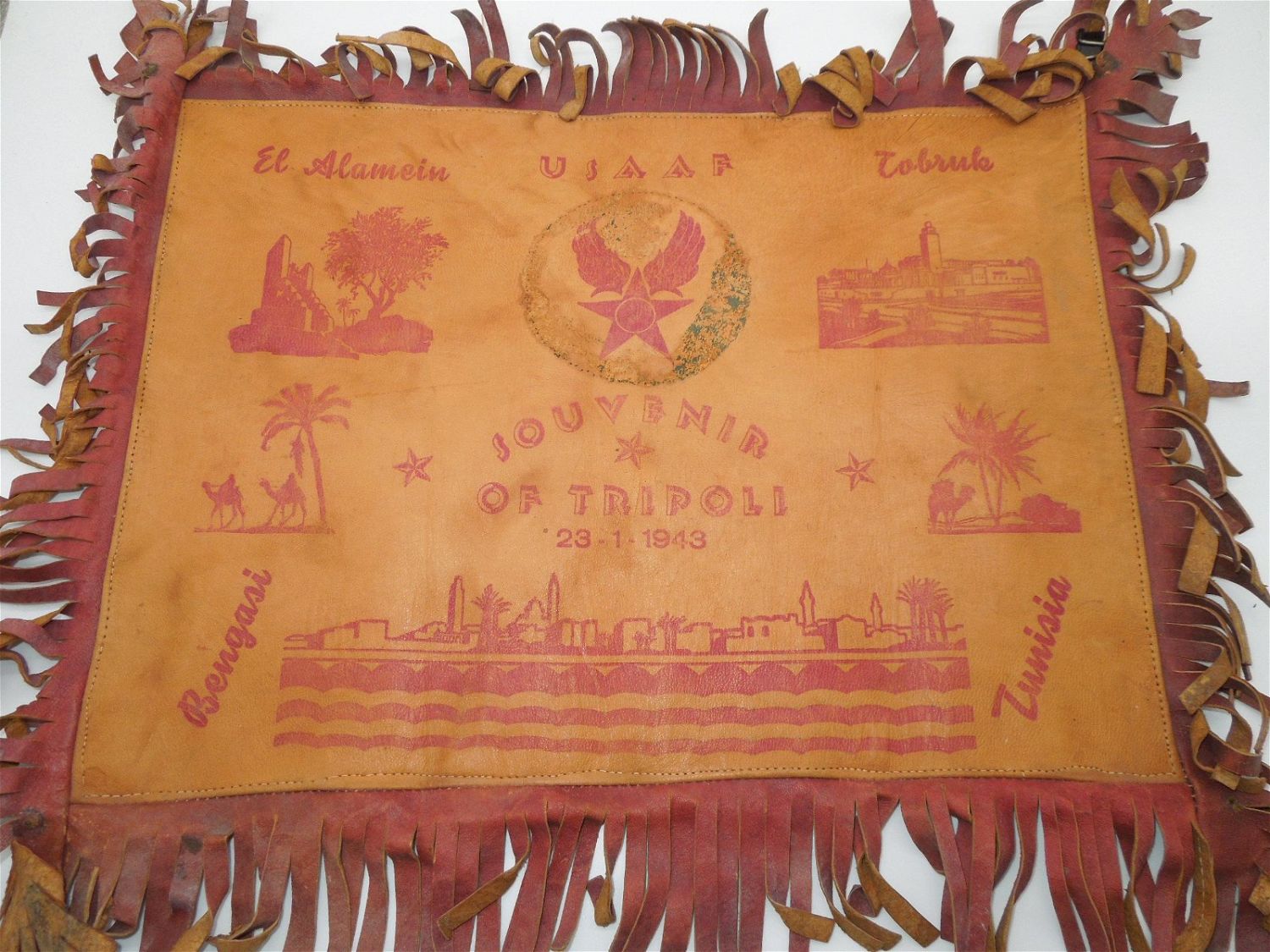 WWII USAAF Army Air Force Souvenir of Tripoli Banner Pillow Cover. Dated 23-1-1943. this souvenir commemorates when Montgomery ordered a huge victory parade in Tripoli on 23 January 1943. Campaigns of Bengasi, Tunisia, Tobrule and El Alamein are also bordered around the edges. Muslin fabric on the reverse. Approximate Size: 16 x 19 inches. Nice condition for its age.