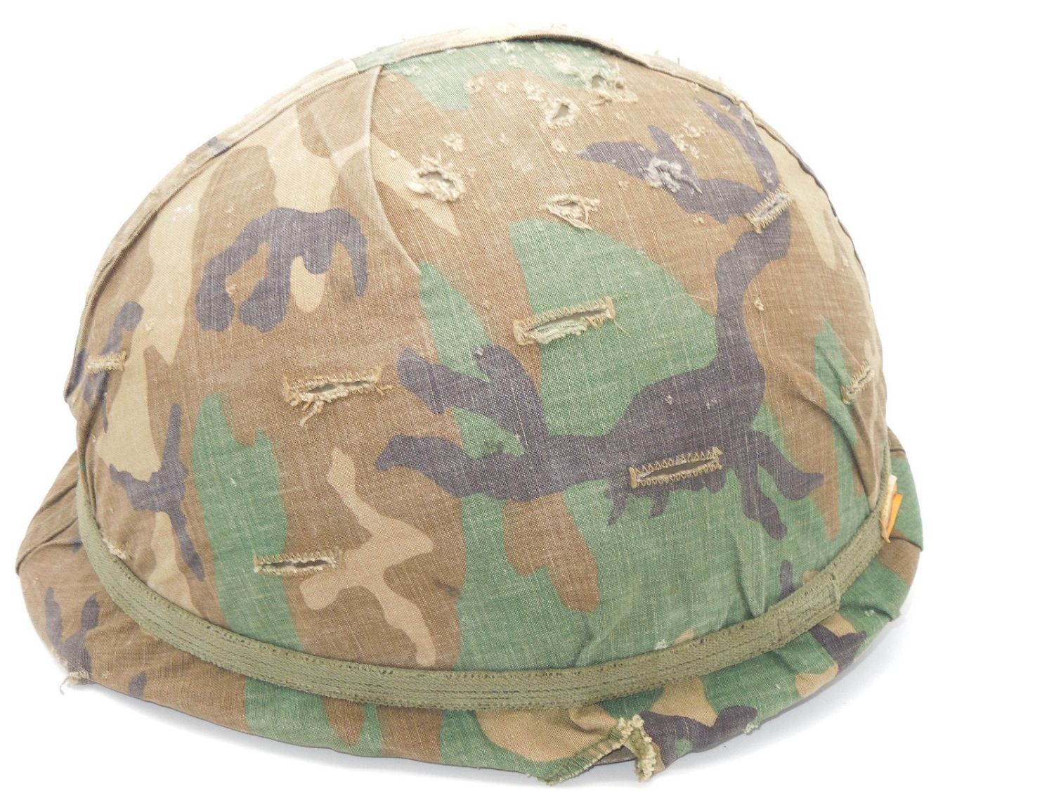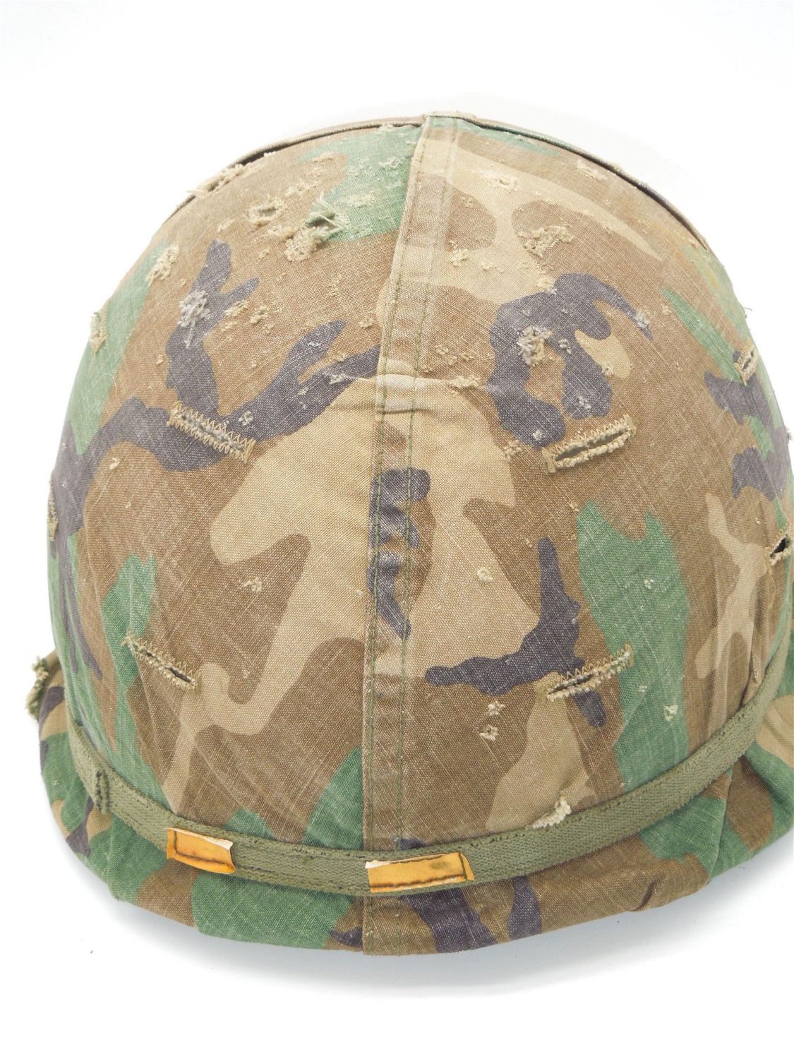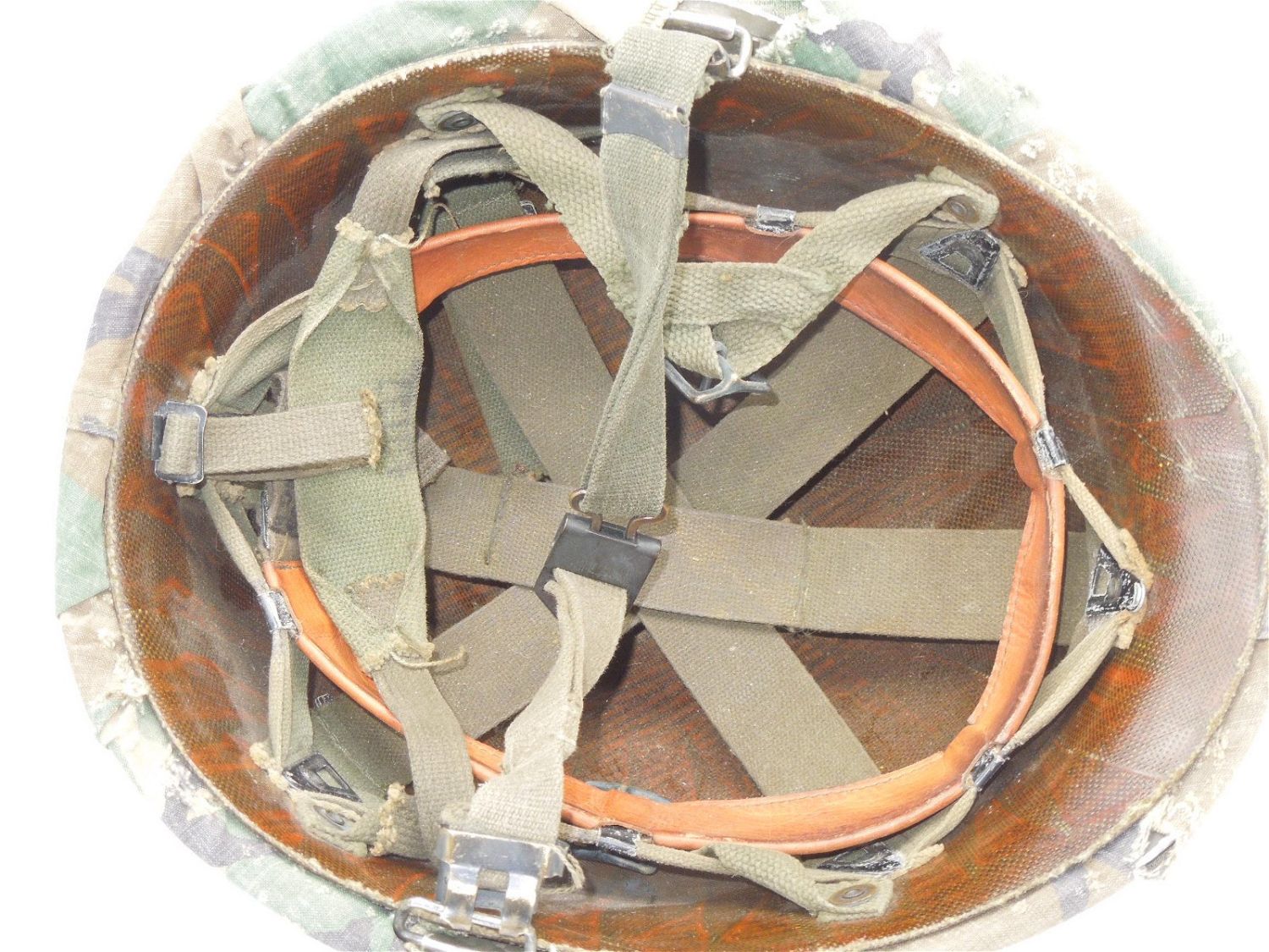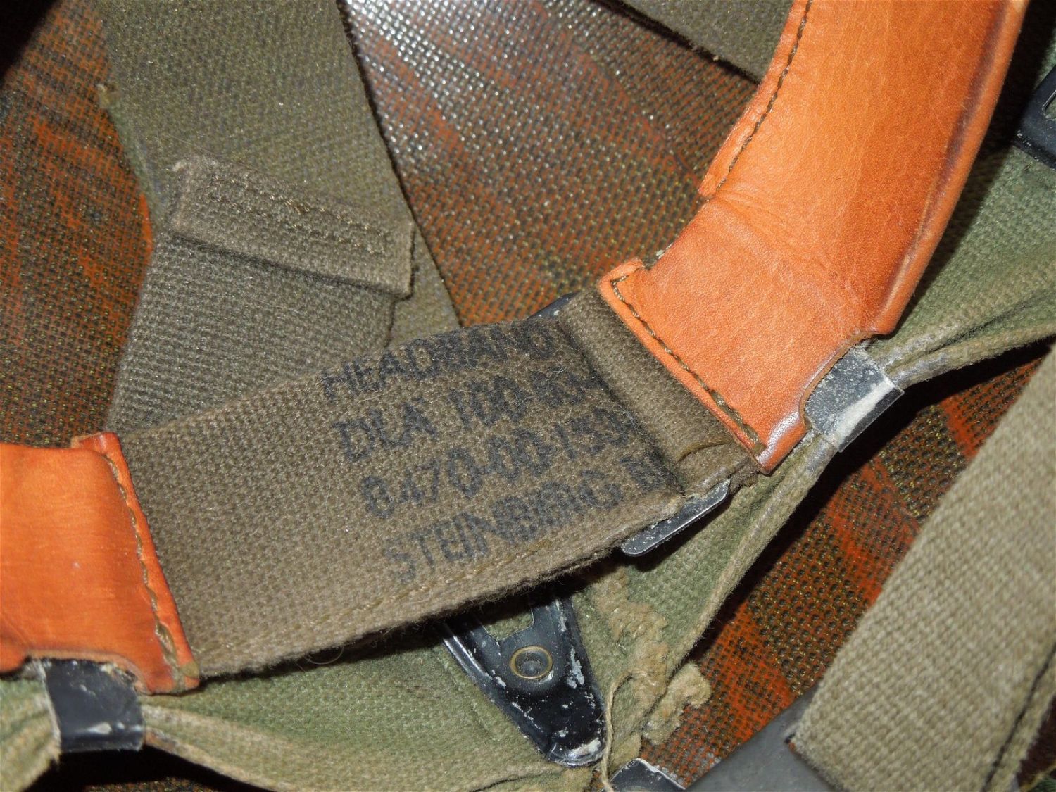 1980s early camouflage pattern helmet cover, and elastic band with cat eyes. The interior has a 1970s – 80s era liner with A straps for Airborne jump use. Good overall condition.