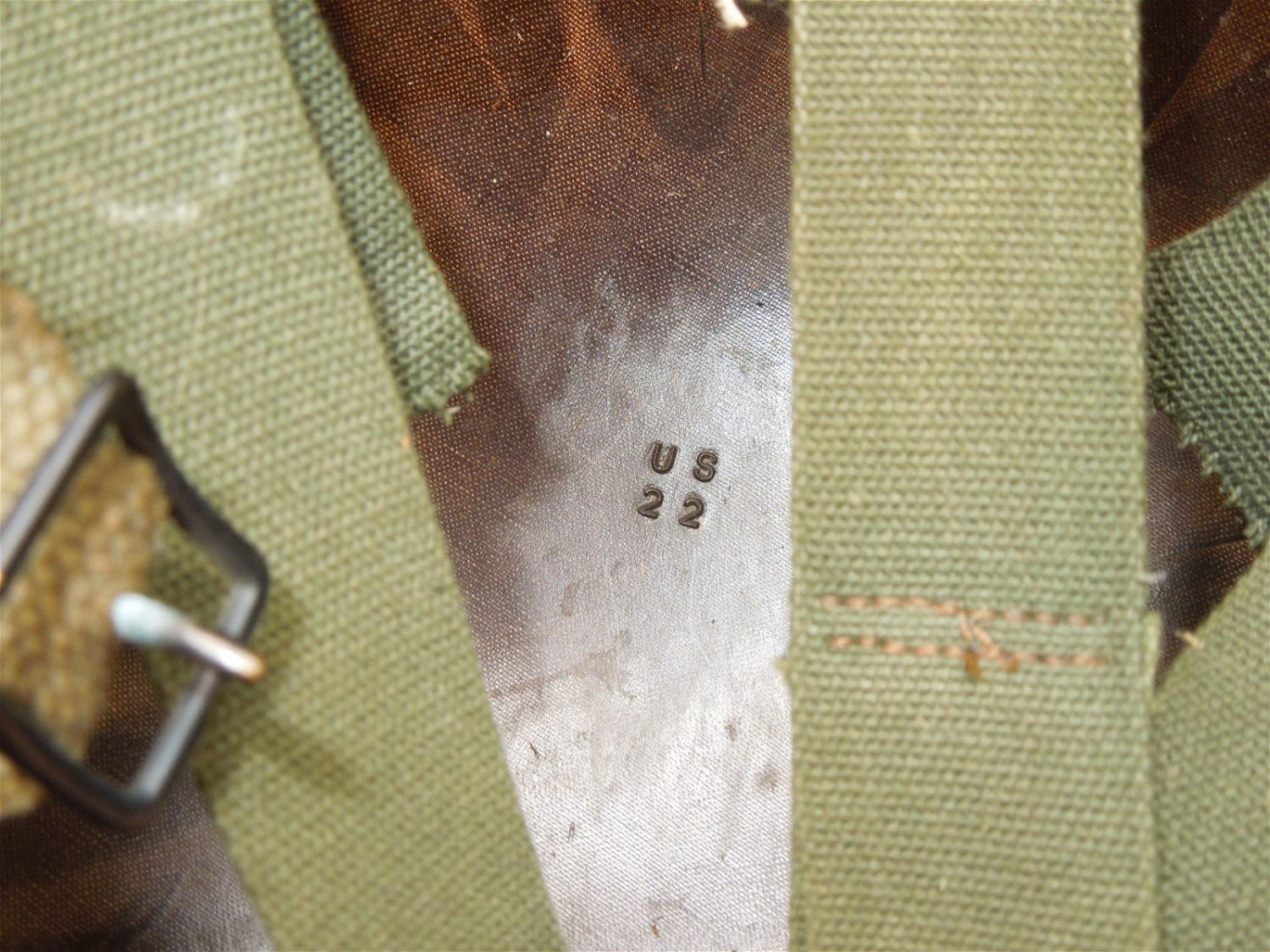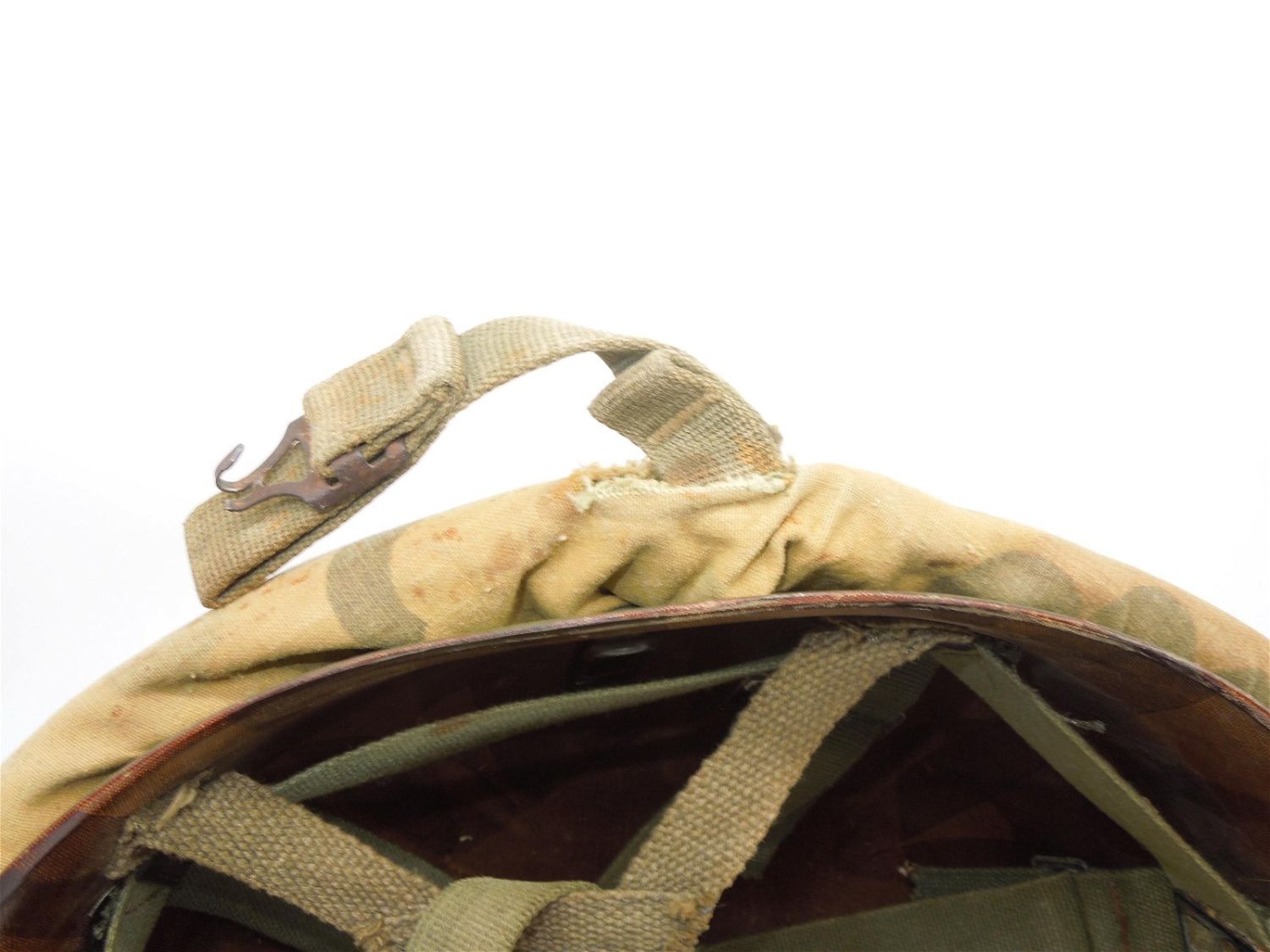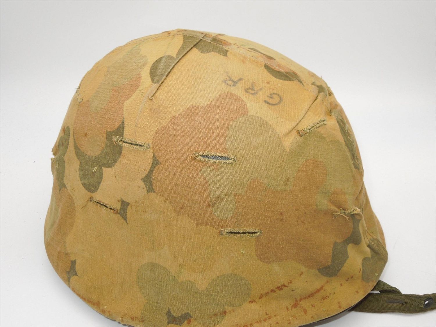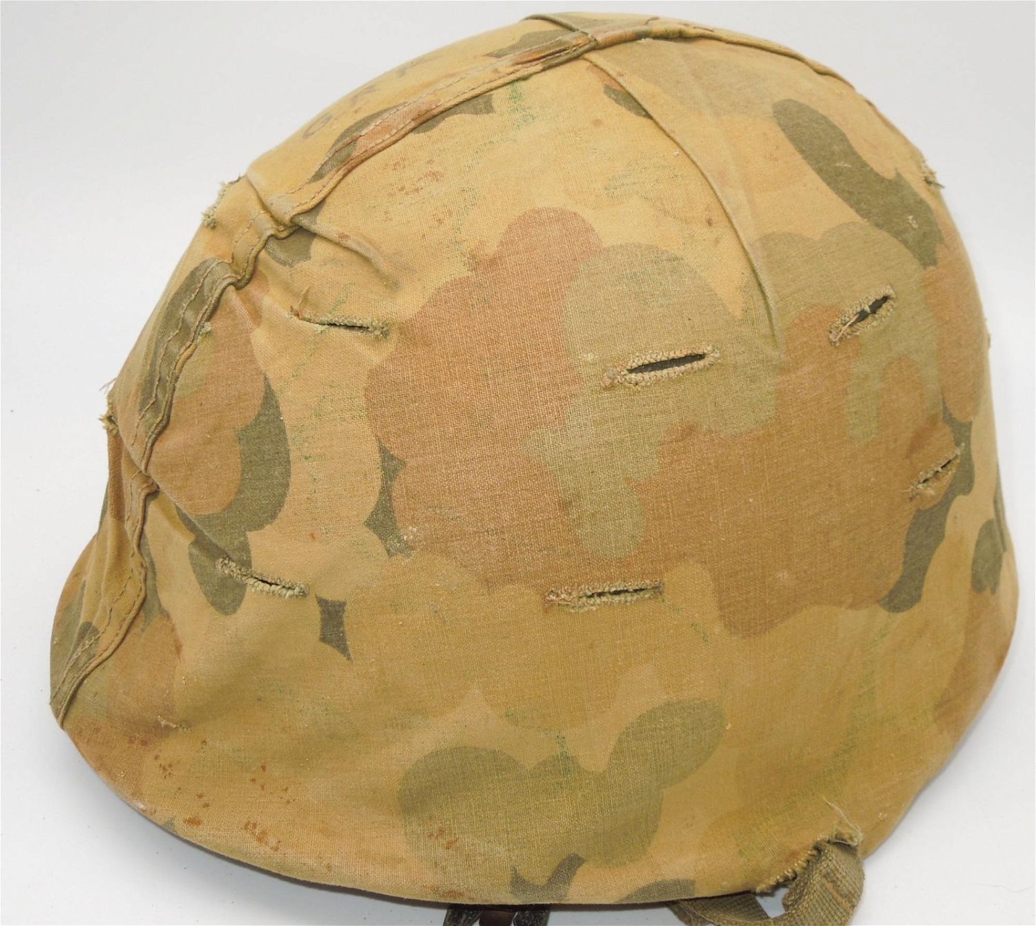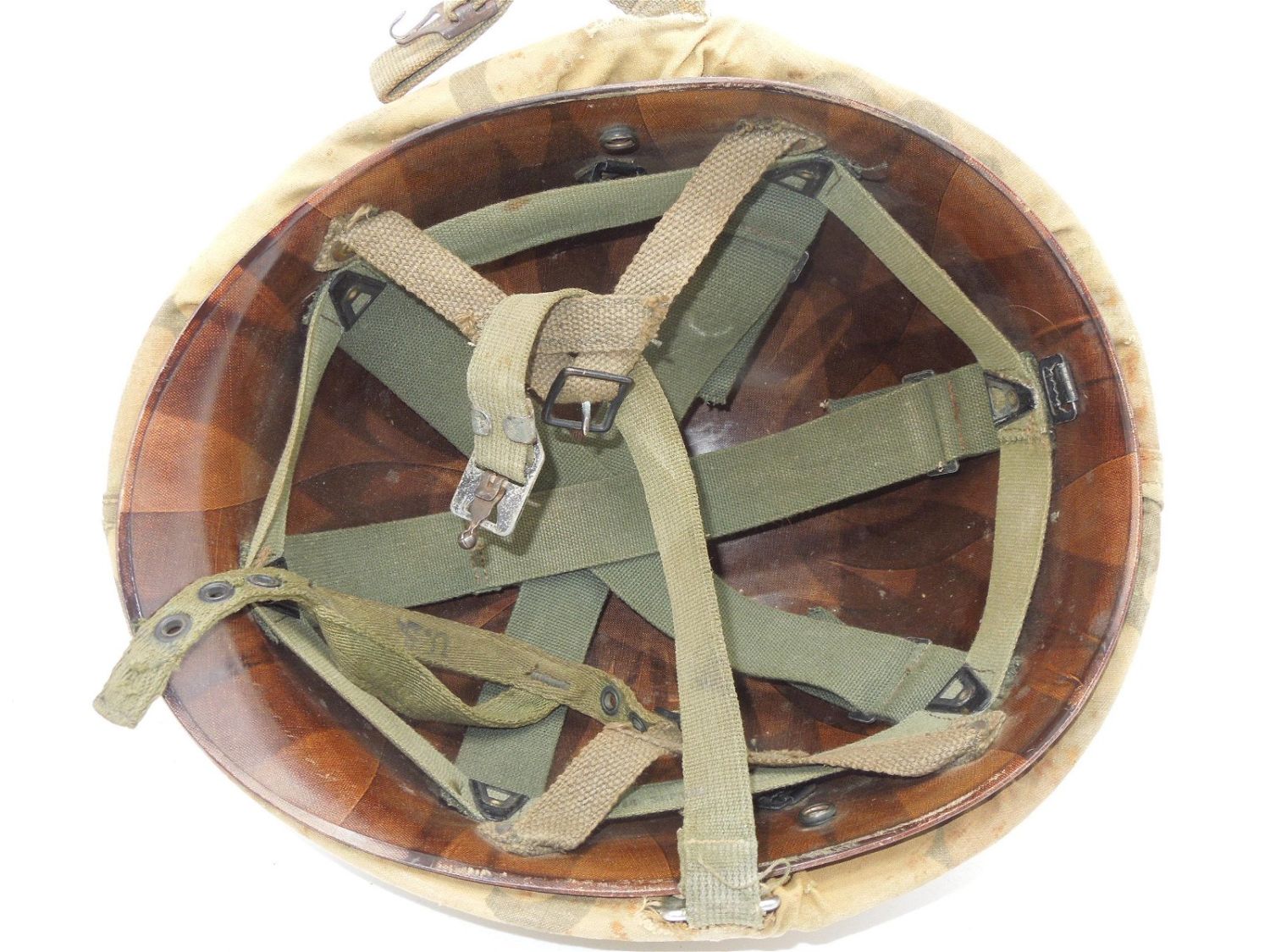 Vietnam era reversible camouflage pattern helmet cover, Vietnam era era liner with A straps for Airborne jump use. The helmet shell itself is a WWII produced front seam swivel bale type. Good overall condition.