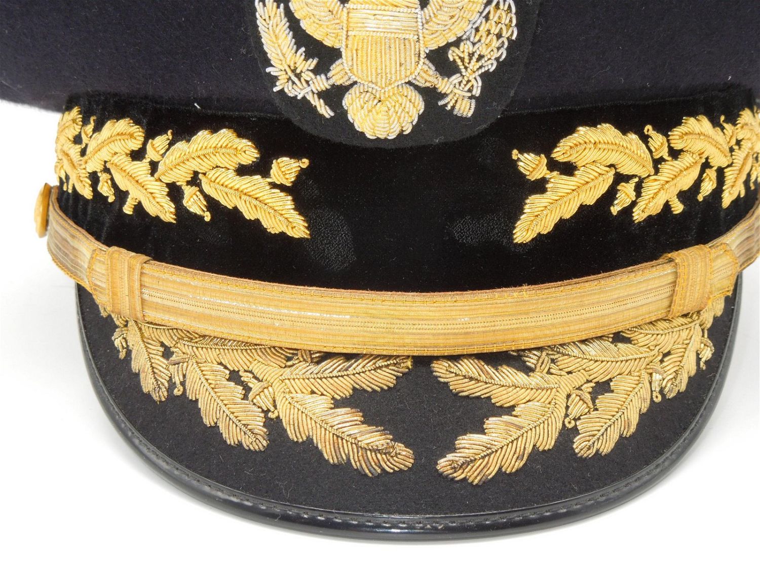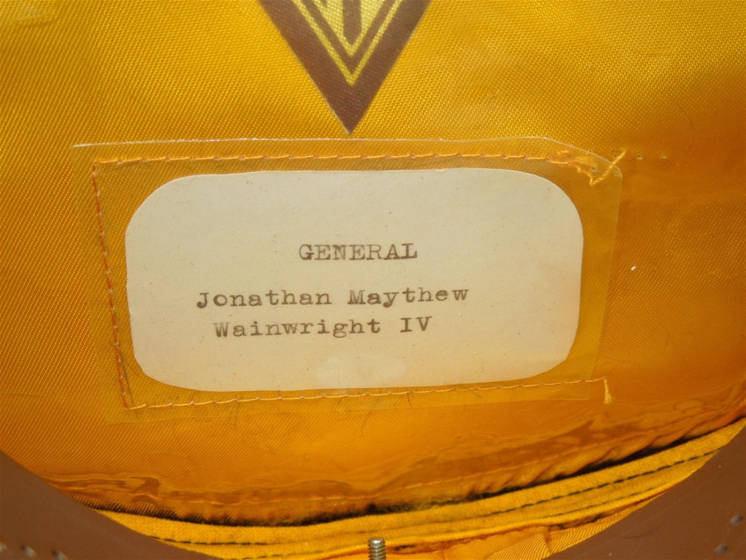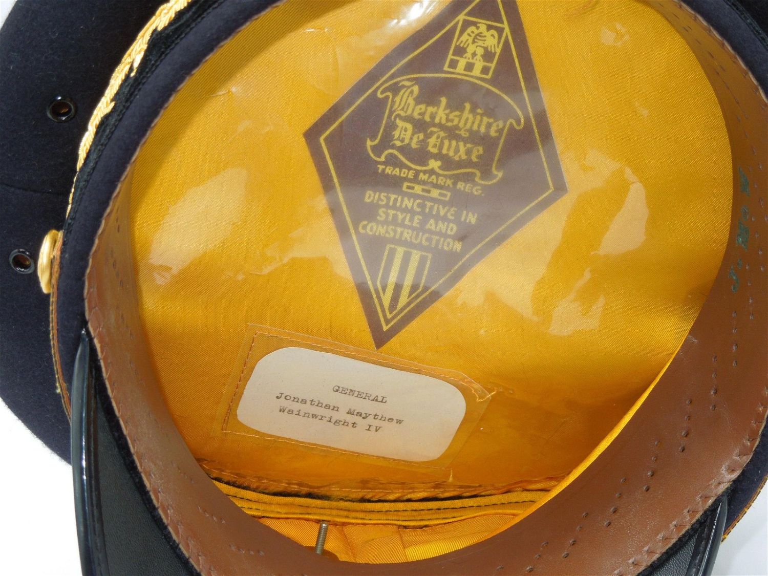 This is a 1950s era Berkshire Deluxe dress blue US Army cap bearing a bullion cap eagle, and bullion oak leaves throughout. The interior has the letters J.M.W. stamped on the sweatband, and the printed card has the General Jonathan Maythew (typo) Wainwright IV on it. The cap size is a 7 1/8. The consignor notes no history with it other than it appears to be unworn. This was possibly a cap for post WWII events just prior to his death in 1953 or could just be a display piece. Regardless, it is a nice setup with a seldom seen bullion cap eagle. There is some stain residue on the front oak leaves just below the eagle. General Jonathan Mayhew Wainwright IV was a career American army officer and the Commander of Allied forces in the Philippines at the time Japan surrendered to the United States, during World War II. Wainwright was a longtime Japanese Prisoner of War and later recipient of the Medal of Honor for his courageous leadership during the fall of the Philippines.