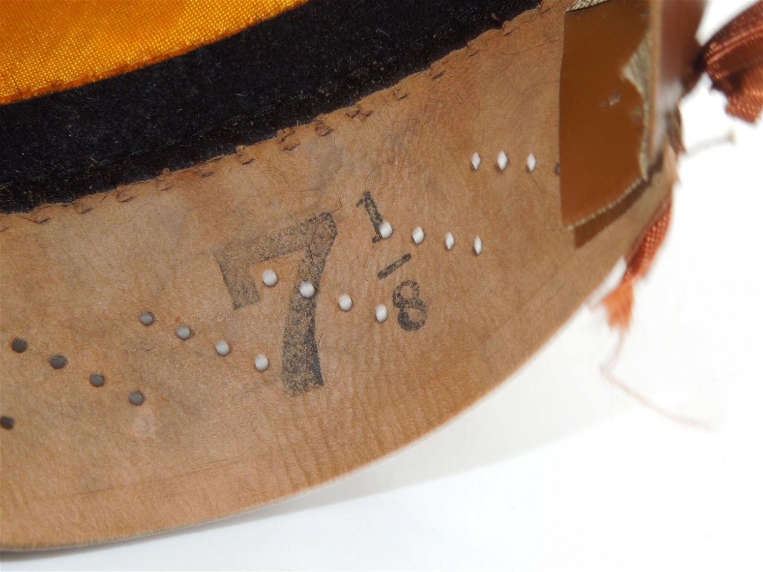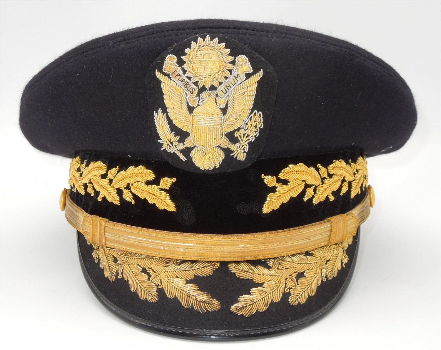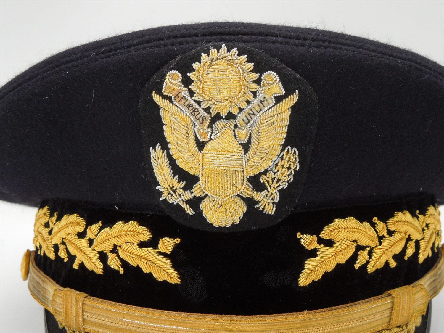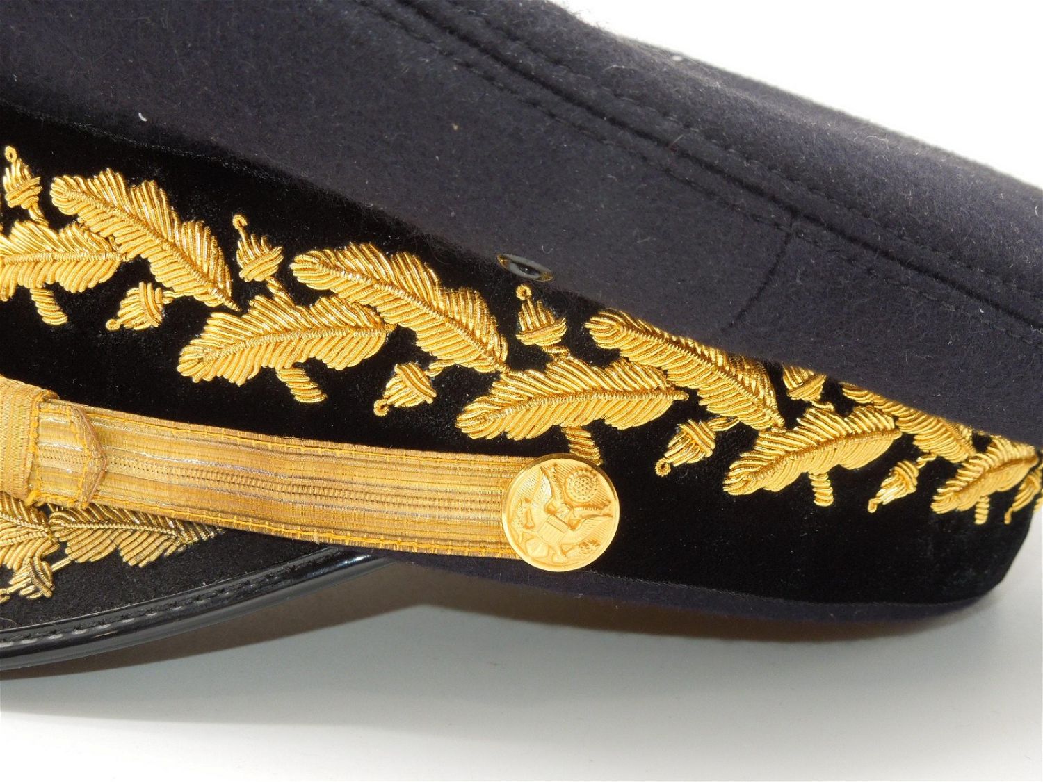 This is a 1950s era Berkshire Deluxe dress blue US Army cap bearing a bullion cap eagle, and bullion oak leaves throughout. The interior has the letters J.M.W. stamped on the sweatband, and the printed card has the General Jonathan Maythew (typo) Wainwright IV on it. The cap size is a 7 1/8. The consignor notes no history with it other than it appears to be unworn. This was possibly a cap for post WWII events just prior to his death in 1953 or could just be a display piece. Regardless, it is a nice setup with a seldom seen bullion cap eagle. There is some stain residue on the front oak leaves just below the eagle. General Jonathan Mayhew Wainwright IV was a career American army officer and the Commander of Allied forces in the Philippines at the time Japan surrendered to the United States, during World War II. Wainwright was a longtime Japanese Prisoner of War and later recipient of the Medal of Honor for his courageous leadership during the fall of the Philippines.