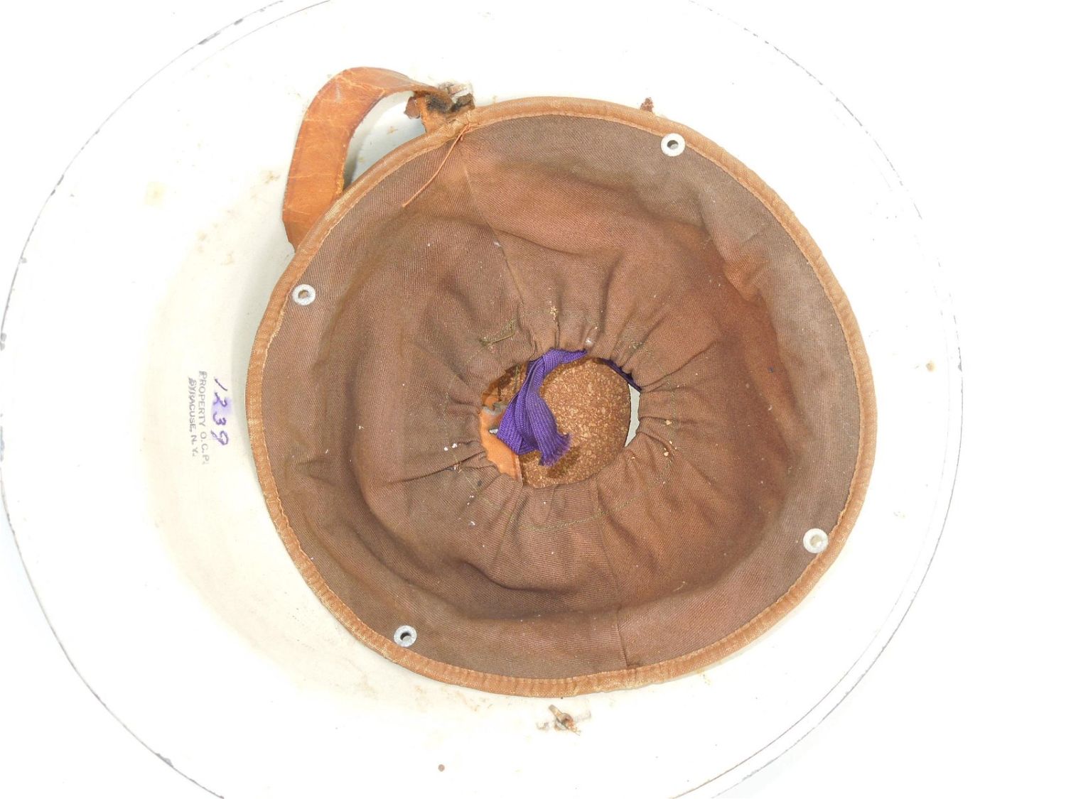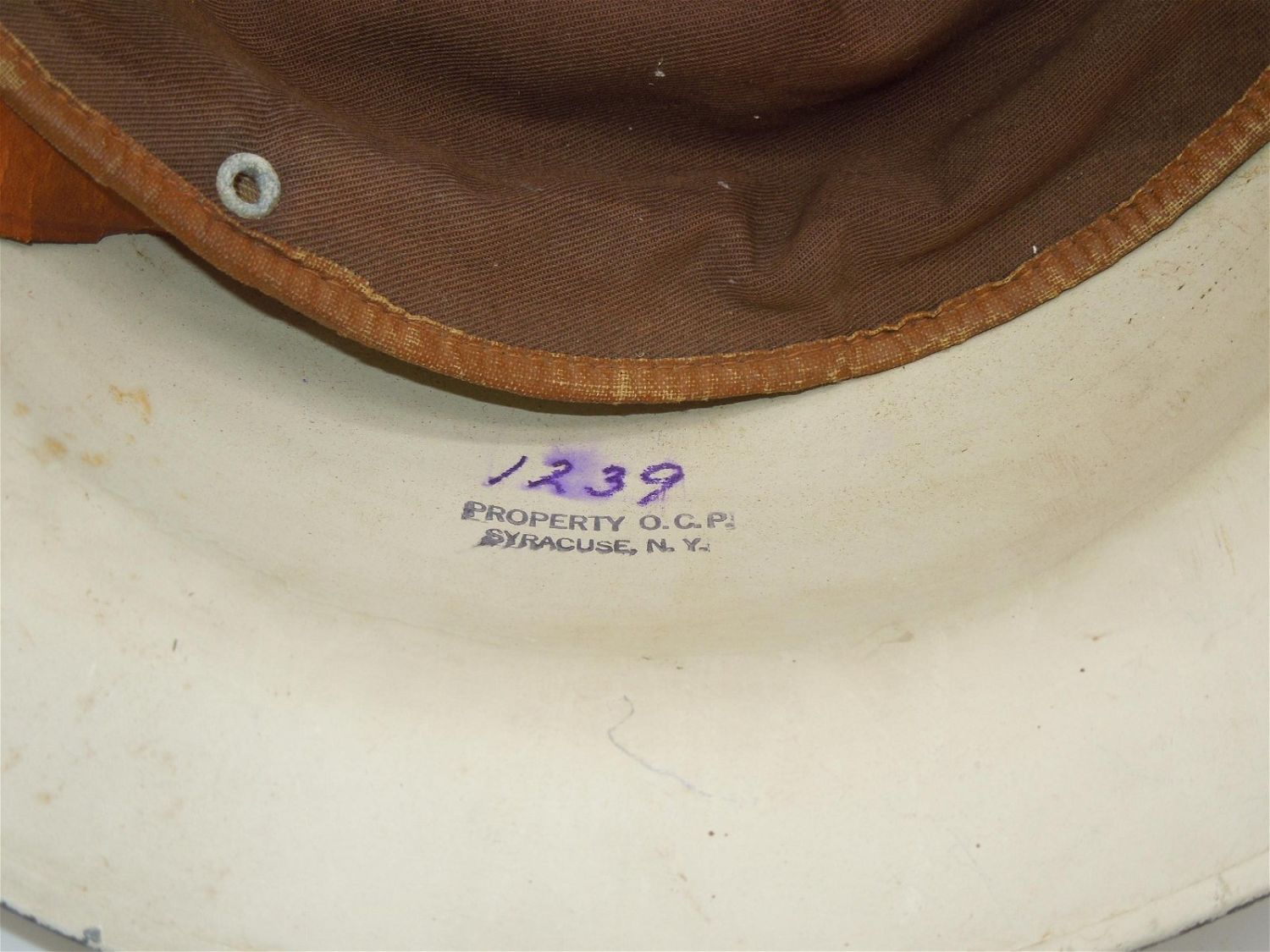 WWII Civil Defense CD Air Raid Warden Painted Helmet Home Front. Liner is attached by a leather strap. Marked on the inside: 1239 Property of O.C.P. Syracuse, New York. Good condition for its age.
