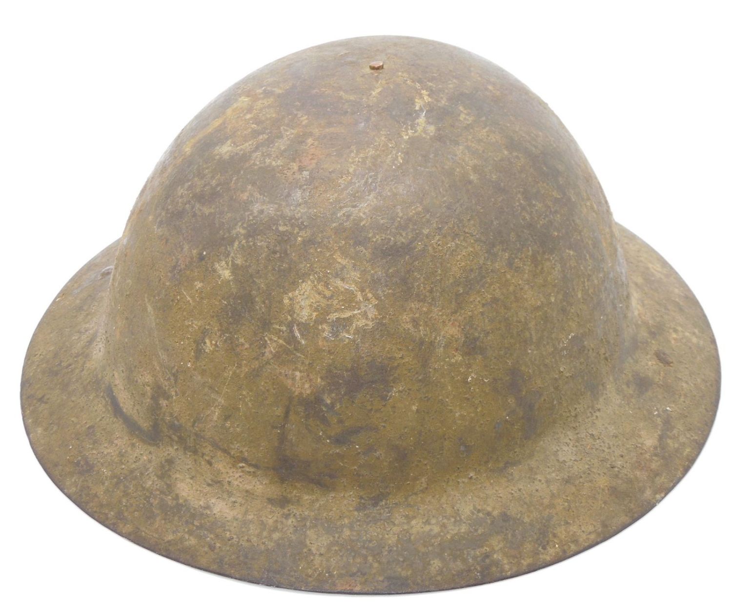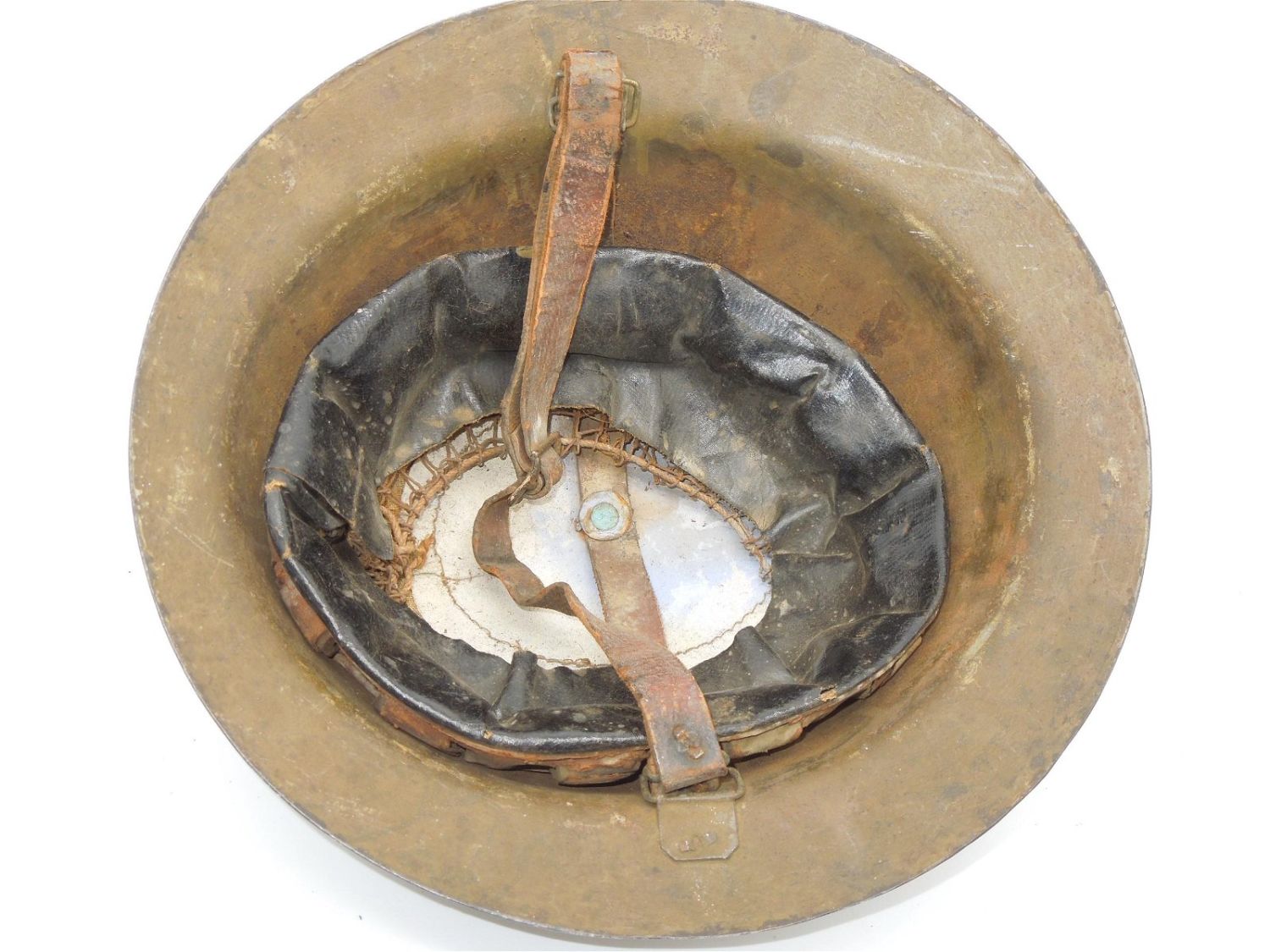 Original WWI era US Army Doughboy helmet shell and liner. The liner is fragile and is partially detached from the interior.