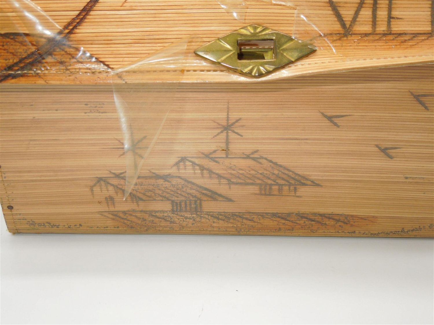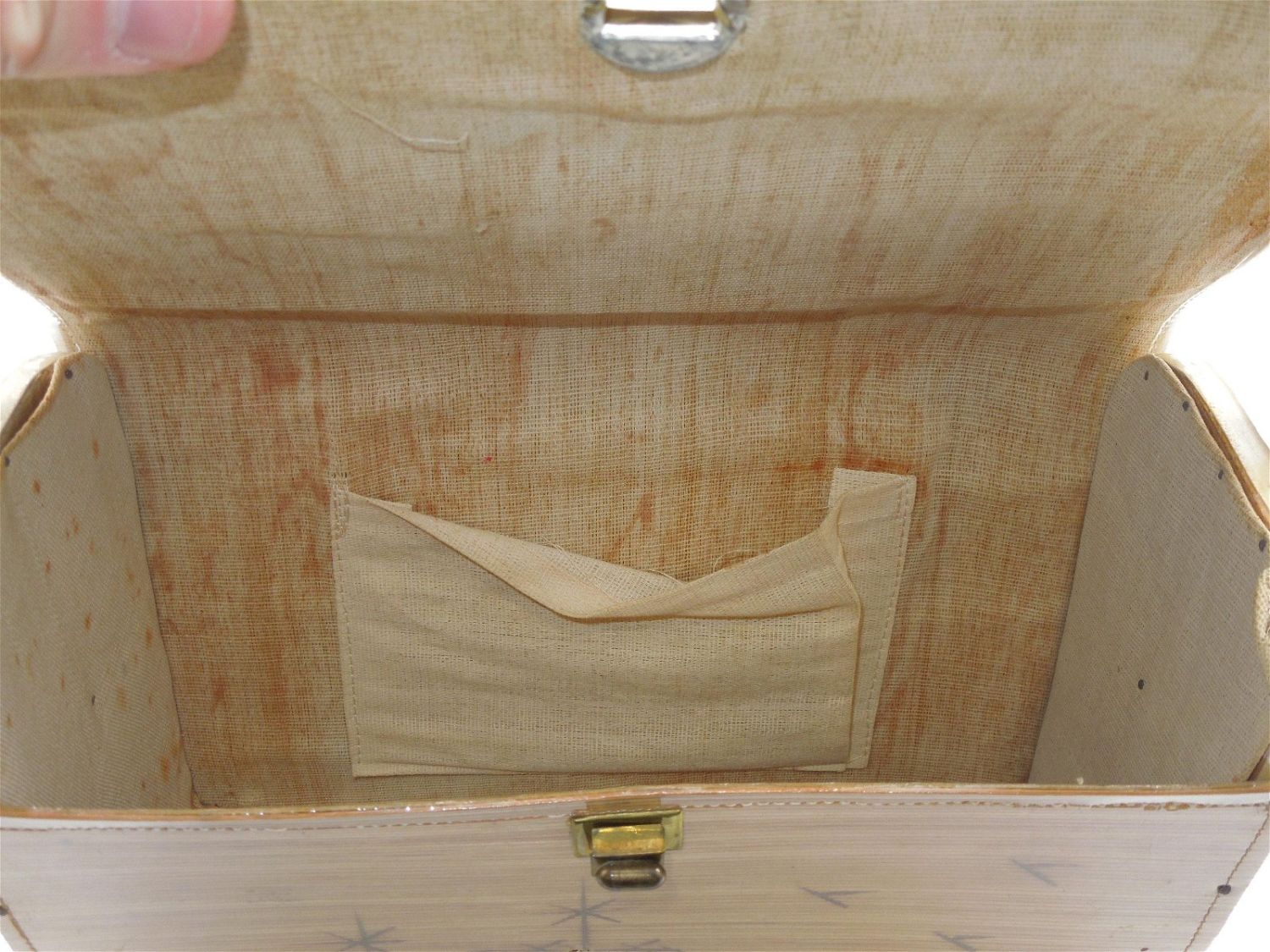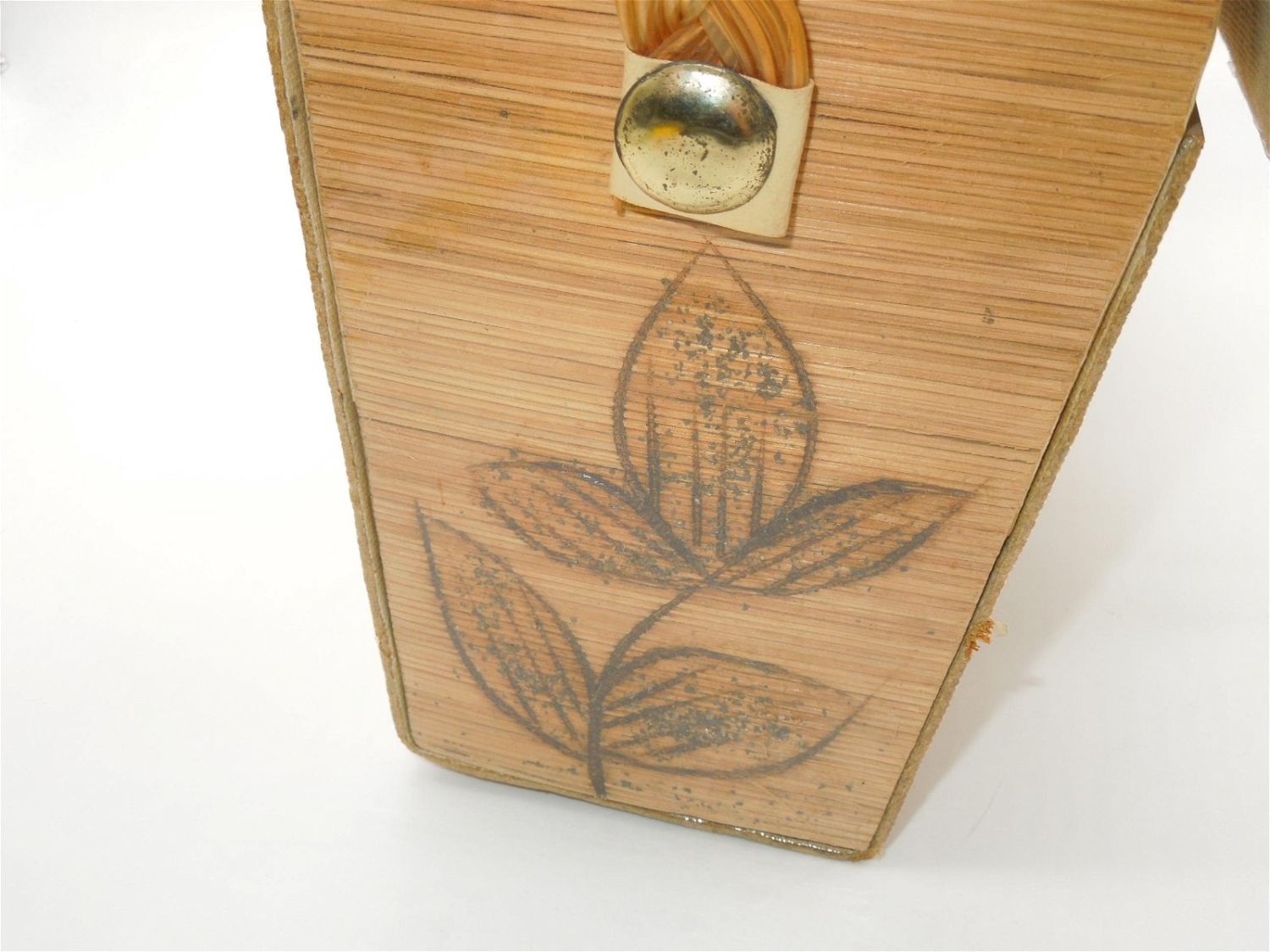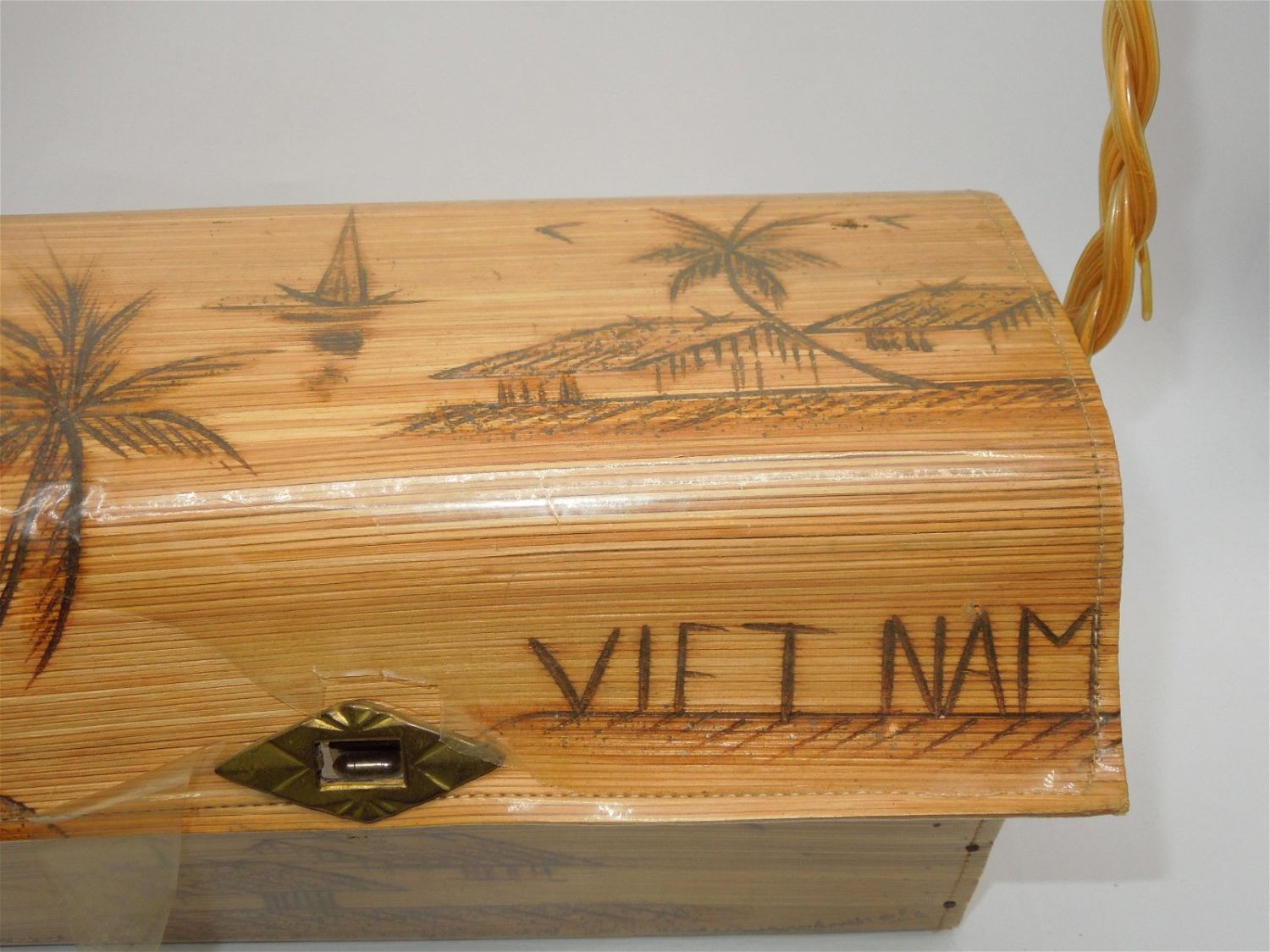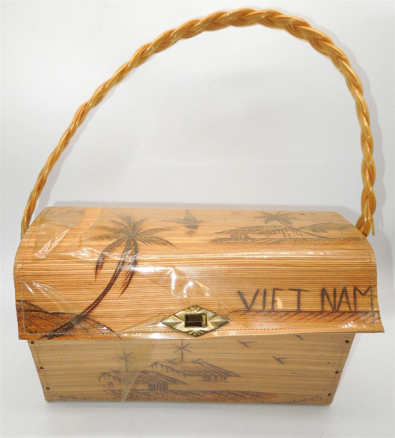 Vietnam War Era Made Souvenir Wicker Rattan Cane Hand Bag. The material used appears to be wicker / Rattan. The condition is very good with the exception of the plastic coating is coming off on the top. Thanks Approximate Size is 4.5 x 6.5 x 11.