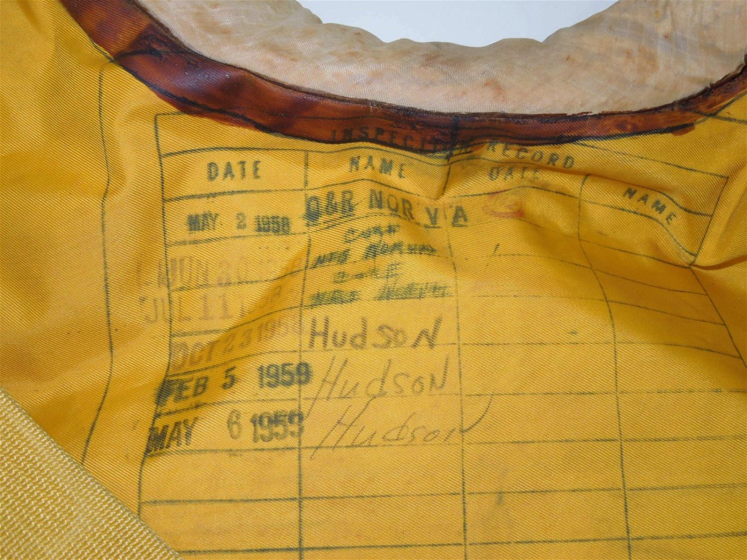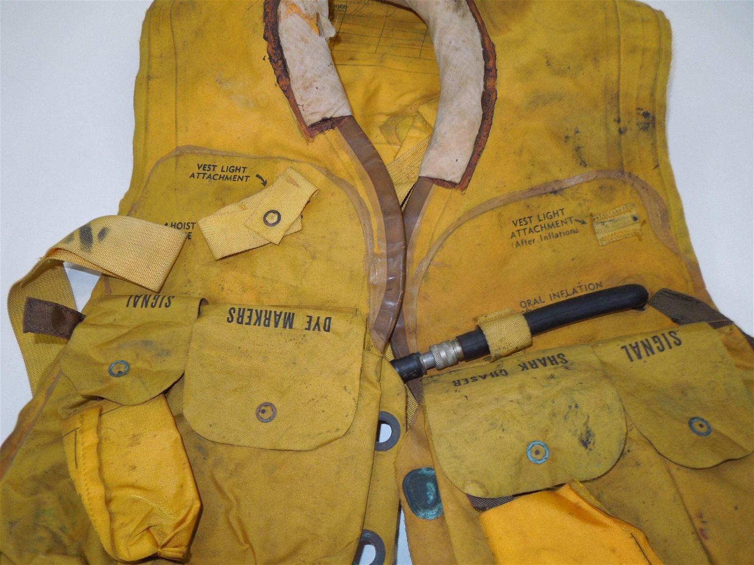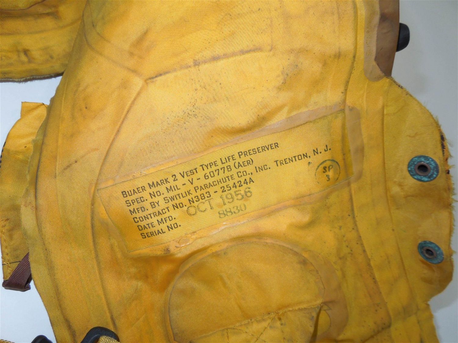 1956 USN Navy Bauer MK2 Yellow Pilot Life Preserver Vest Mae West. Bauer Mark 2 Vest Type Life Perserver. Manufactured by Switlik Parachute Co. October 1956. Various names printed on the vest. Good used condition for its time period. Show wear from use and age.