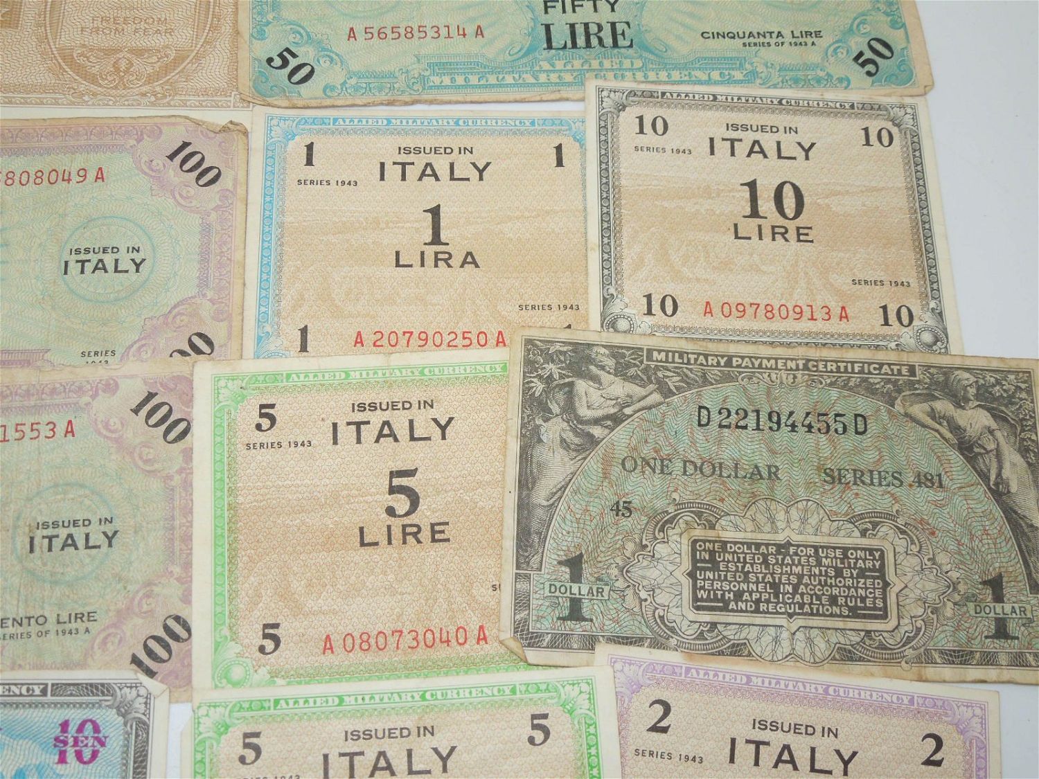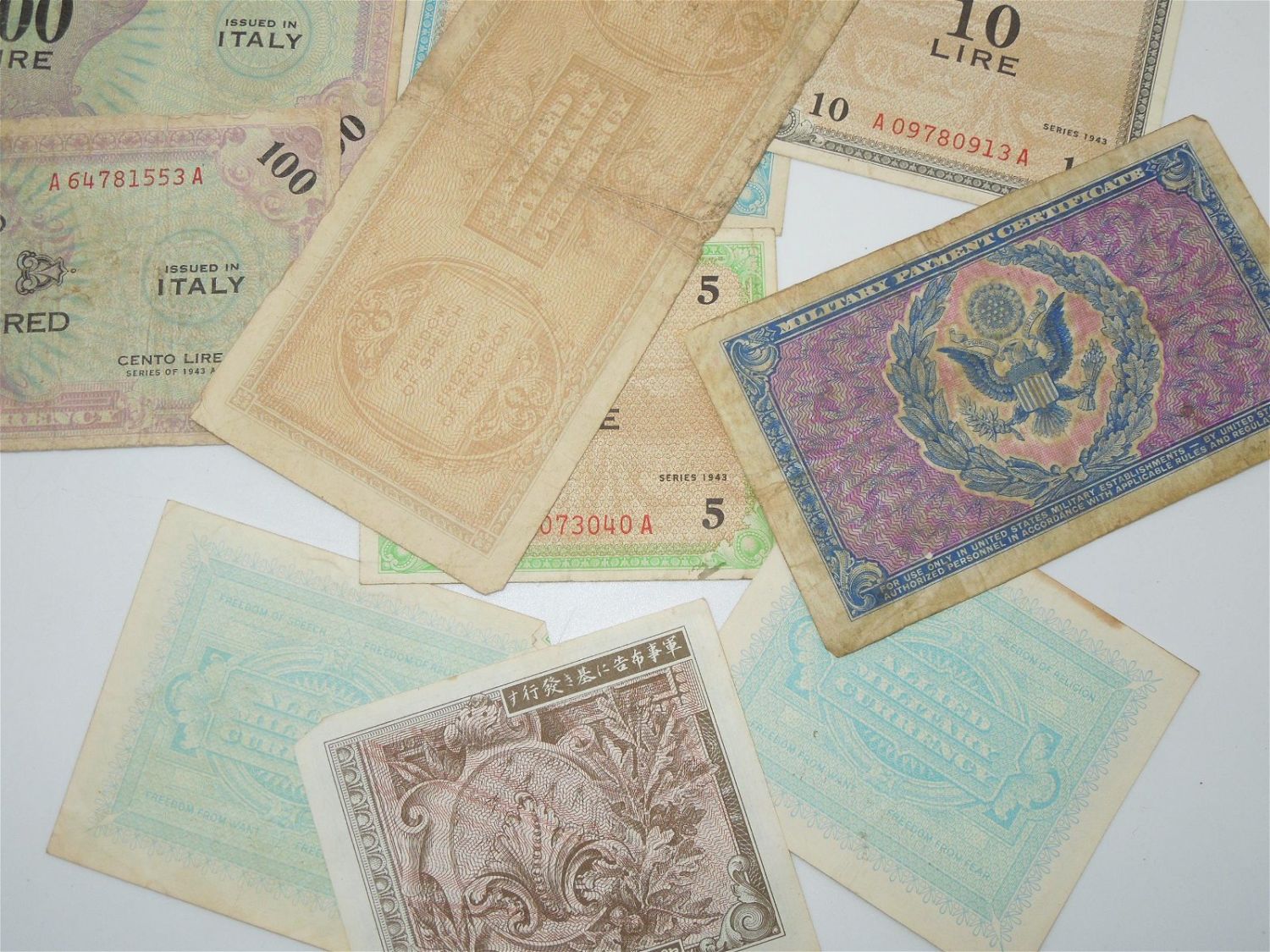 WWII Military Allied Banknote Currency Payment Certificate Money Lot Italy Japan. Lot of original period WWII era money as shown. All pieces show use and age consistent with old money,