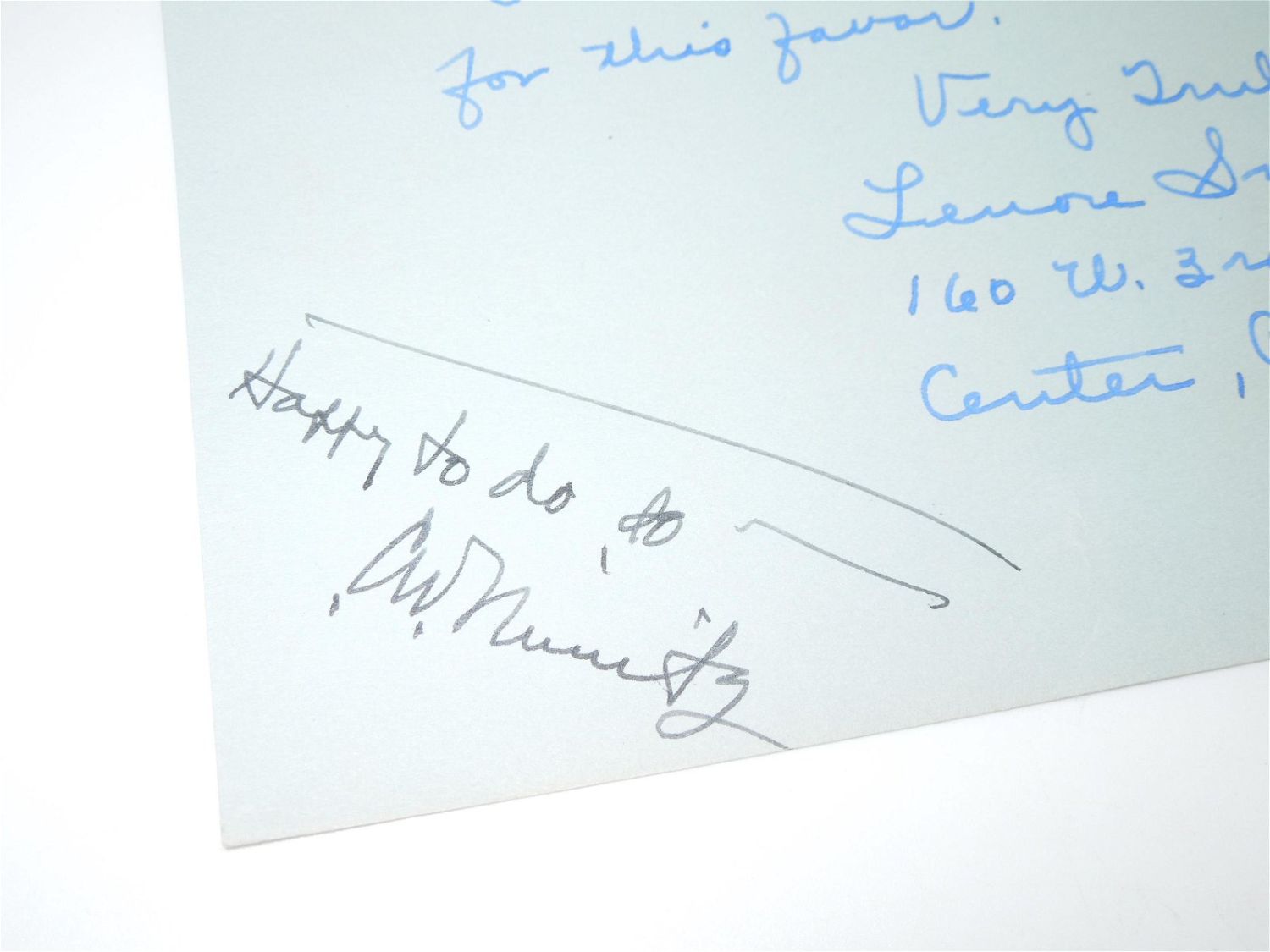 Navy Admiral Chester W. Nimitz 1951 Signed on Letter. 1951 Letter written to Admiral Nimitz who signed this letter in the bottom left corner. Chester William Nimitz (February 24, 1885 – February 20, 1966) was a Fleet Admiral in the United States Navy. He was Commander in Chief of the US Pacific Fleet and Commander in Chief of the Pacific Ocean Areas commanding Allied air, land, and sea forces during WWII. Approximate size is 7 x 5.5 inches. Nice signature.