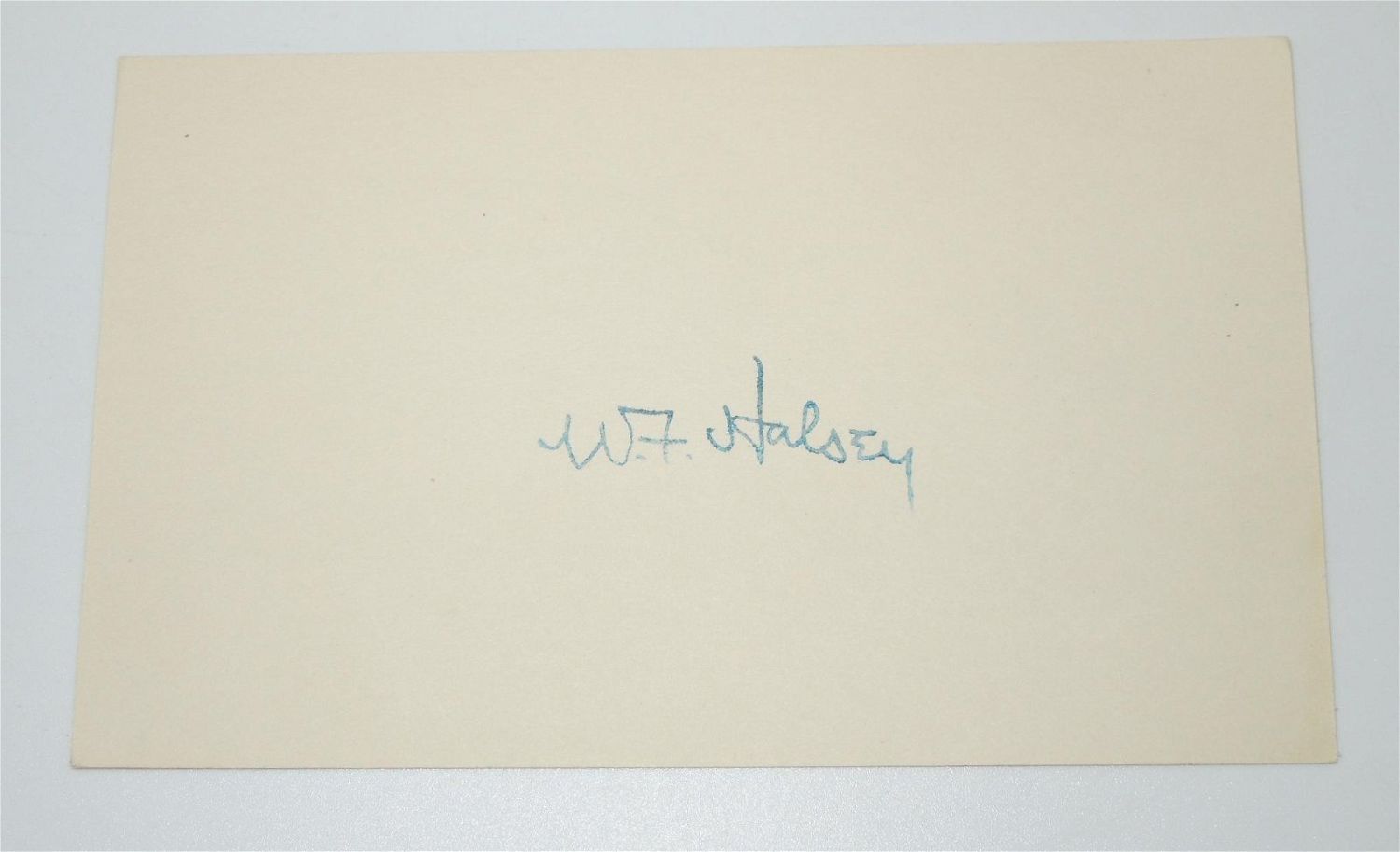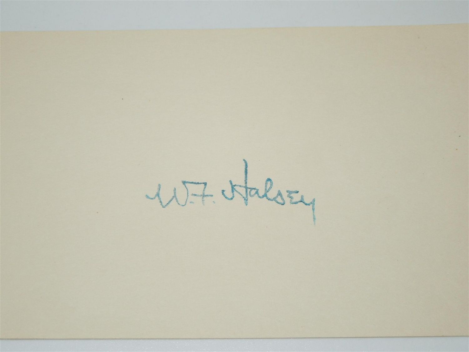 Navy Admiral William F. Halsey Signed Card. William Frederick "Bull" Halsey Jr. (October 30, 1882 – August 16, 1959) was an American navy Admiral during WWII. He is one of four officers to have attained the rank of five-star Fleet Admiral of the United States Navy. Halsey was made commander of the South Pacific Area, and led the Allied forces over the course of the Battle for Guadalcanal (1942–1943) and the fighting up the Solomon chain (1942–1945). In 1943 he was made commander of the Third Fleet, the post he held through the rest of the war. Approximate size is 3 x 5 inches. Nice overall condition.