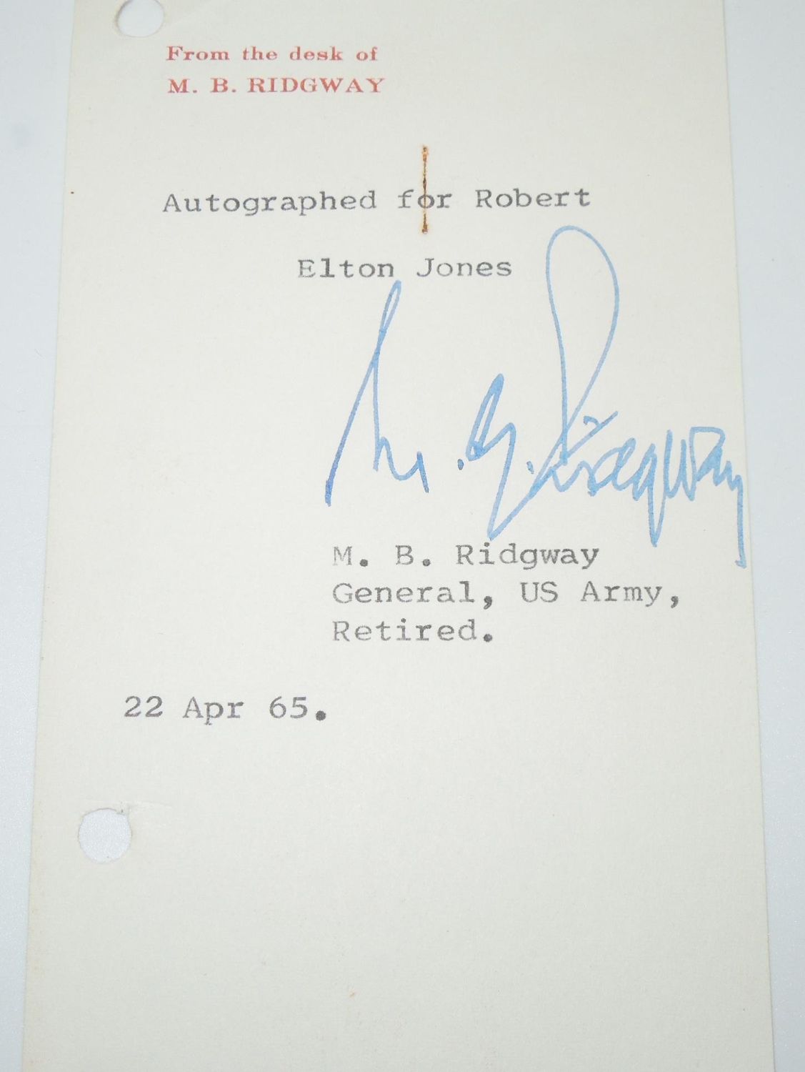 Army General Matthew B. Ridgway 1965 Signed Stationary Paper. Matthew Bunker Ridgway (March 3, 1895 – July 26, 1993) was a senior officer in the US Army who served as Supreme Allied Commander Europe (1952–1953) and the 19th Chief of Staff of the US Army (1953–1955). He was the first Commanding General of the 82nd Airborne Division leading it in action in Sicily, Italy and Normandy, before taking command of the newly formed XVIII Airborne Corps in August 1944. He held the latter post until the end of the war in mid-1945, commanding the corps in the Battle of the Bulge, Operation Varsity and the Western Allied invasion of Germany. Approximate size is 3.5 x 5.5 inches. Good condition for its age.