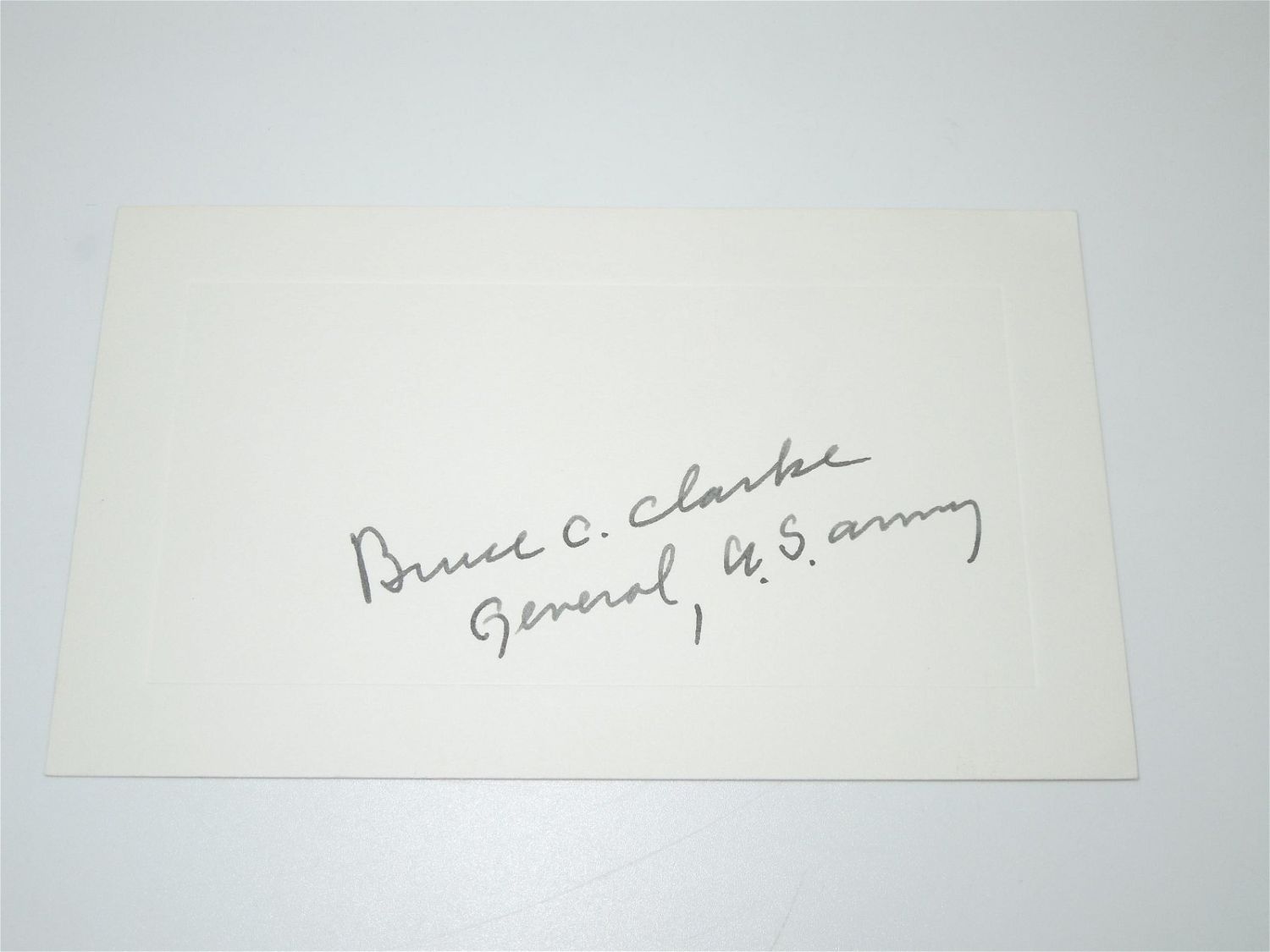 Army General Bruce C. Clarke Signed Card. Bruce Cooper Clarke (April 29, 1901 – March 17, 1988) was a US General. He was a career officer who served in WWI, WWII and Korea. He was the commander of Continental Army Command from 1958 to 1960, Commander, U.S. Army Europe from 1960 to 1962, and commanded the US Army, Pacific from December 1954 to April 1956. Approximate size is 3.5 x 5.75 inches. Nice condition.