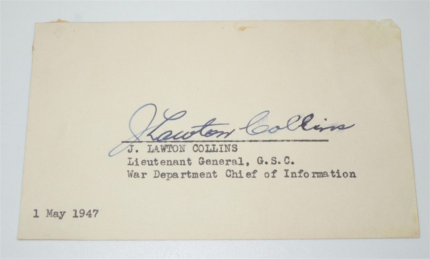 Army General J. Lawton Collins 1947 Signed Card. General Joseph Lawton Collins (May 1, 1896 – September 12, 1987) was a senior US Army officer. During WWII, he served in both the Pacific and ETO, one of a few senior American commanders to do so. He was Chief of Staff of the US Army during the Korean War. This card was signed in 1947 when Collins was War Department Chief of Information. Approximate size is 3 x 5 inches. Signature is slightly smeared from handling. Also, glue residue on the reverse.