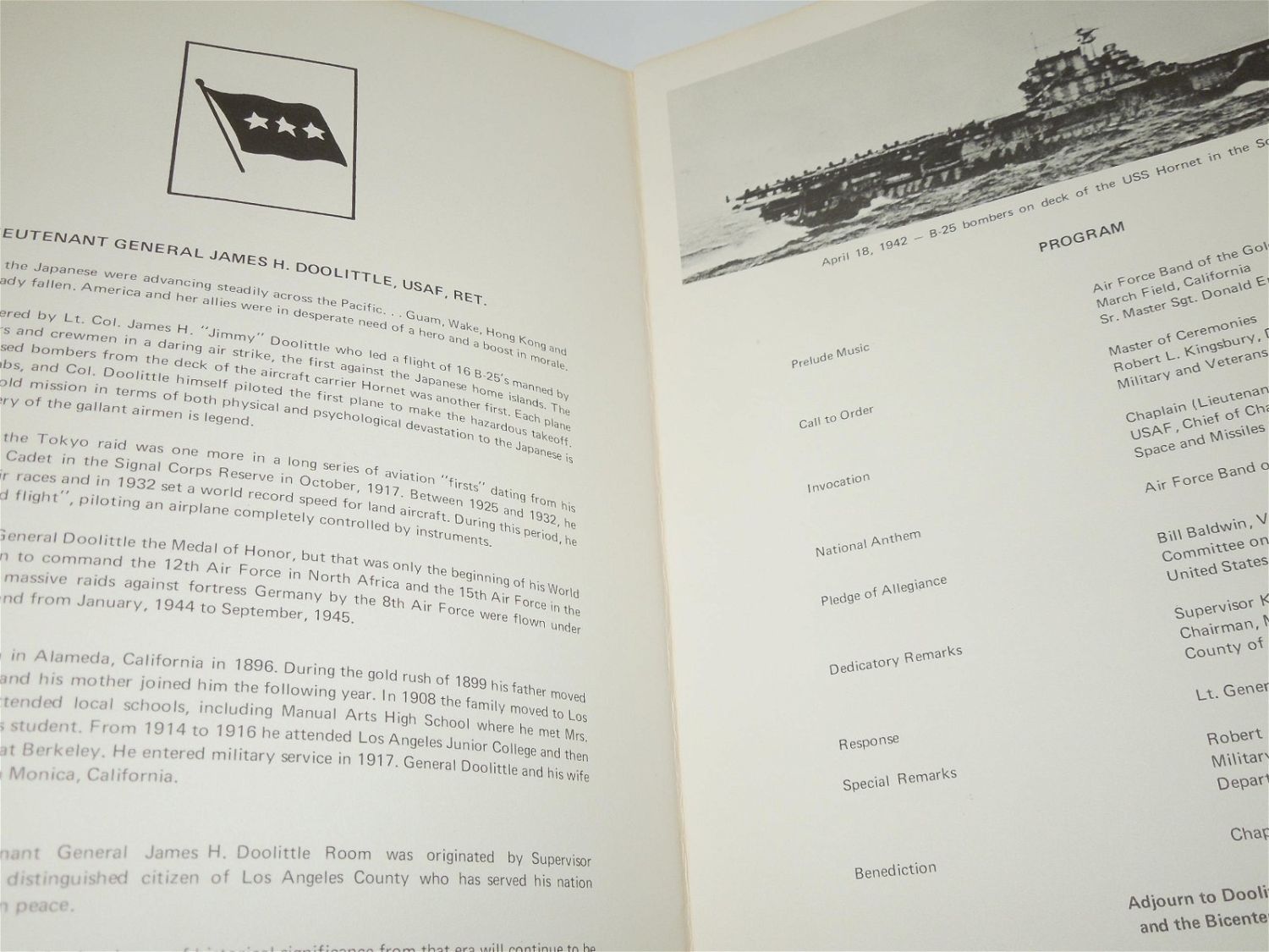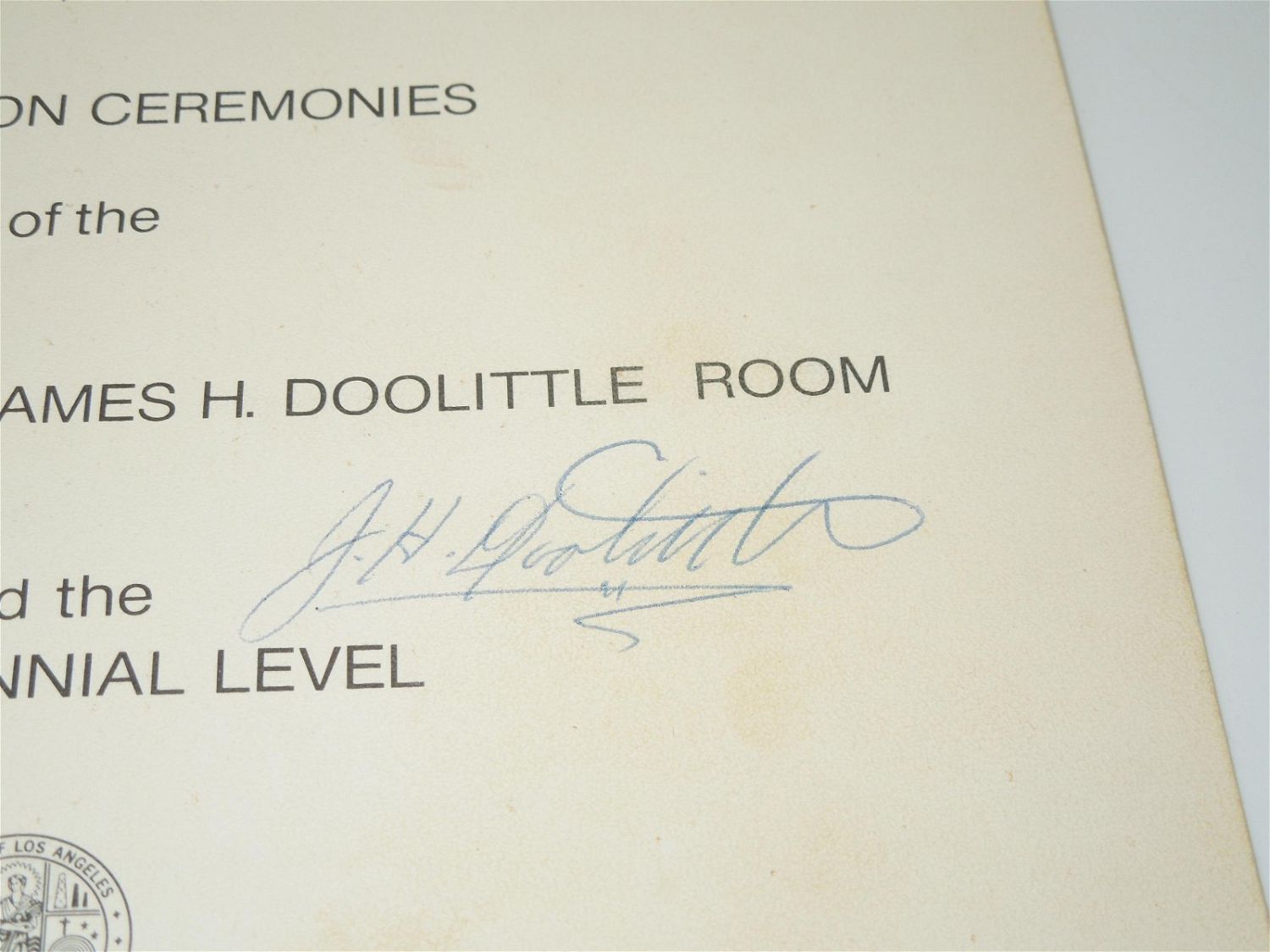 Army & Air Force General James H. Doolittle 1976 Signed Dedication Booklet. Signed on the front cover of the Dedication Ceremonies of the Lieutenant General James H. Doolittle Room and the Bicentennial Level by General Doolittle. James Harold Doolittle (December 14, 1896 – September 27, 1993) was an American military general and aviation pioneer who received the Medal of Honor for his daring raid on Japan during WWII. He also made early coast-to-coast flights, record-breaking speed flights, won many flying races, and helped develop and flight-test Instrument flying. Approximate size is 8.5 x 11 inches. Marks on the front cover most likely from age and handling.
