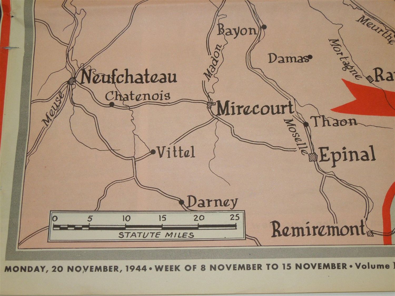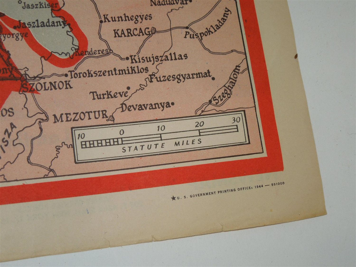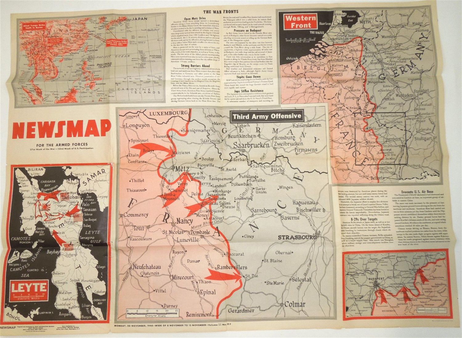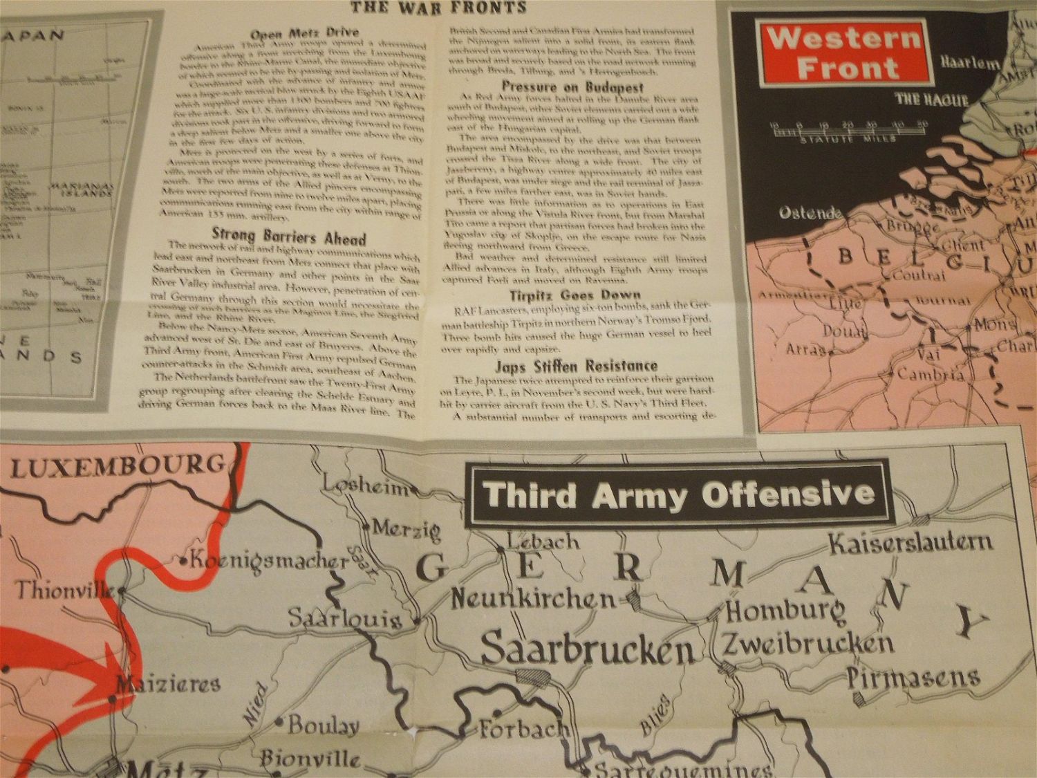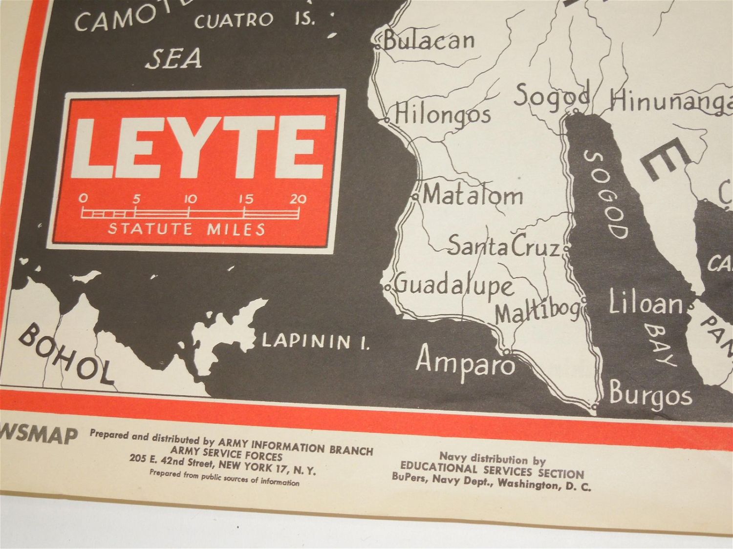 WWII ESB Engineer Service Battalion Newsmap Poster. The front text describes action on various war fronts: Open Metz drive, Strong barriers ahead, Pressure on Budapest, Tirpitz goes down, Japs stiffen resistance, B-29s over targets, Evacuate U.S. air base. The Maps are Western front, Budapest to Miskolc front, Third Army offensive, Leyte, Allied troops strike south in Burma. The back describes amphibian armies’ combat strategies and victories. Includes 3 photographs plus images of the Amphibious shoulder patch and pocket patch. Volume III, No. 318. Prepared and distributed by Army Information Branch. Army Service Forces. Approximate size is 34.5 x 47 inches. Condition is used with some rough edges and a couple small tears along the creases. Still good condition for its age.