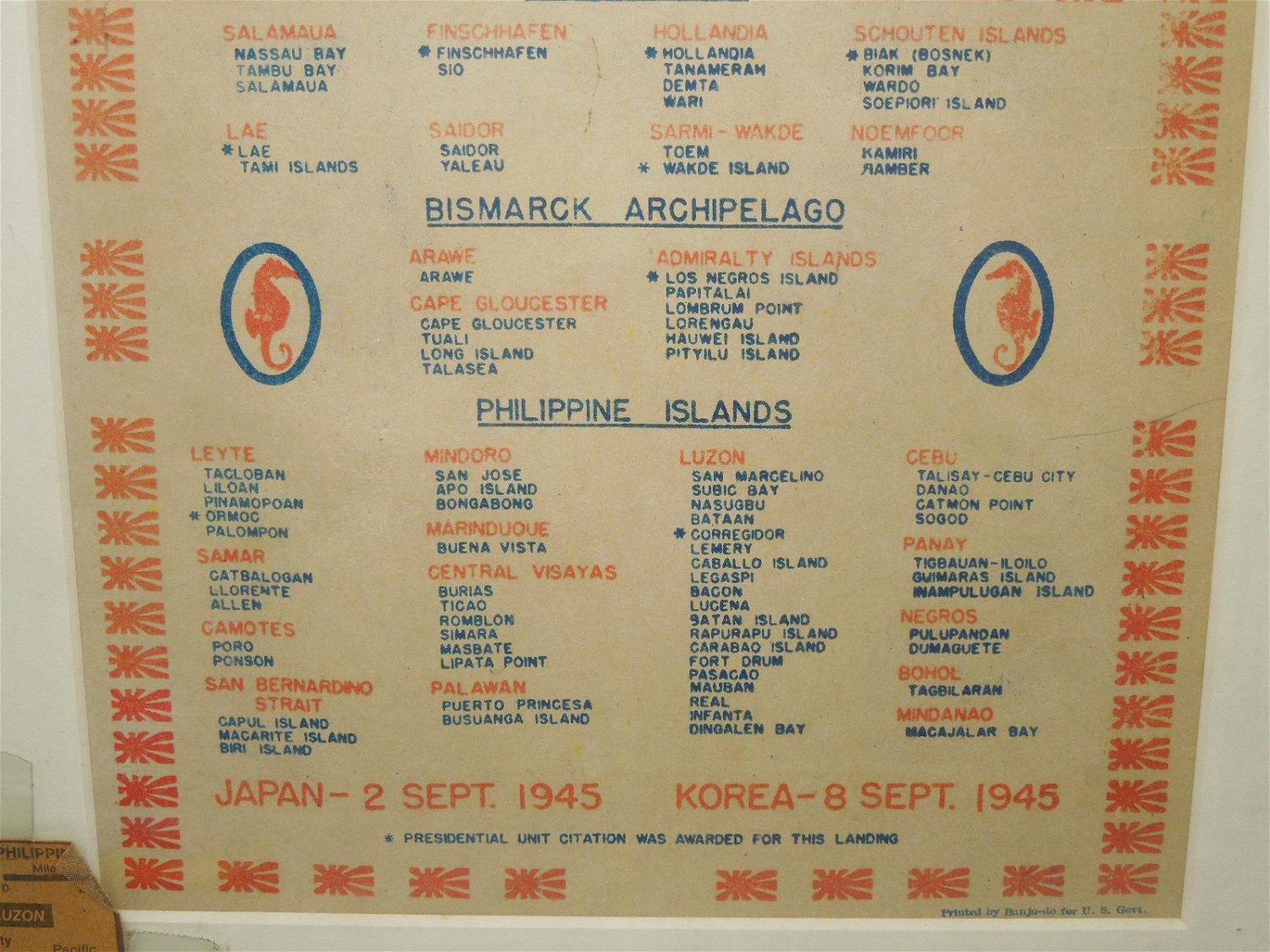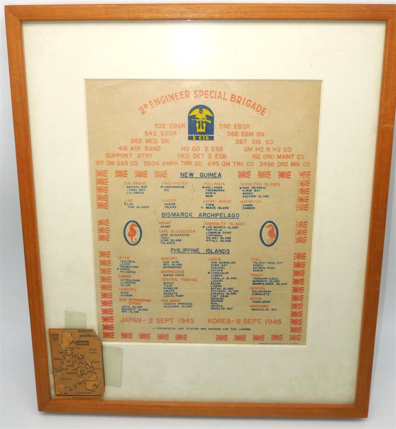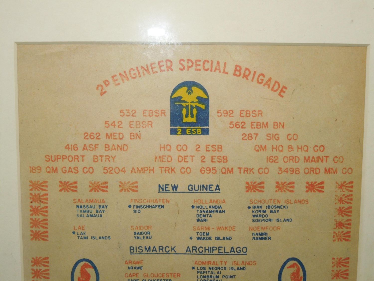 WWII U.S. Army 2nd Engineer Special Brigade Framed Unit History Document. Approximate size is 12.5 x 15 inches. From the internet: The 2nd Engineer Special Brigade trained at Cairns with the Australian 9th Division in June and July 1943. The 532nd Engineer Boat and Shore Regiment then moved to New Guinea, and landed part of the 9th Division at Red Beach near Lae on 4 September. On 22 September, it landed elements of the 9th Division at Scarlet Beach near Finschhafen. On 11 October, four Japanese barges attempted to land on Scarlet Beach. They were defeated by men of the 532nd Engineer Boat and Shore Regiment, including Private Junior Van Noy, who was posthumously awarded the Medal of Honor.Over the next few months, units of the 2nd Engineer Special Brigade participated in the landings at Arawe, Long Island, Saidor, Sio, Los Negros, Talasea, Hollandia, Wakde and Biak. On 20 October 1944 it participated in the amphibious assault on Leyte in the Philippines. Over the following months it participated in a series of amphibious operations to liberate the Philippines. Nine of the 2nd Engineer Special Brigade’s units were awarded Presidential Unit Citations. Very nice framed matted condition. A newspaper clipping is attached to the bottom left corner.