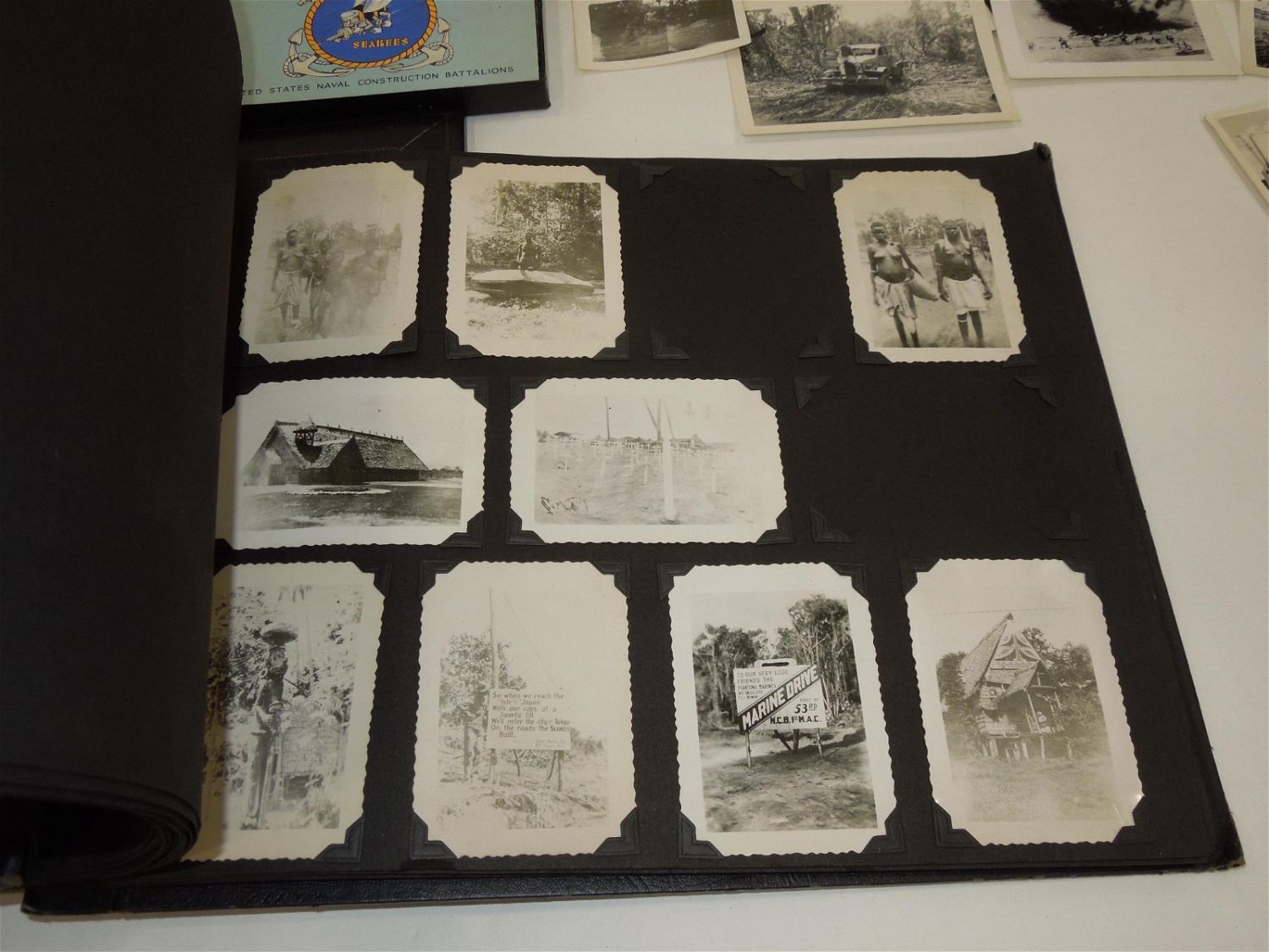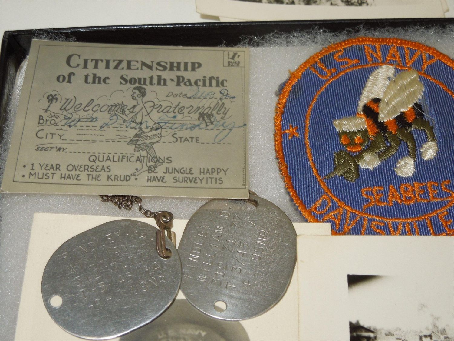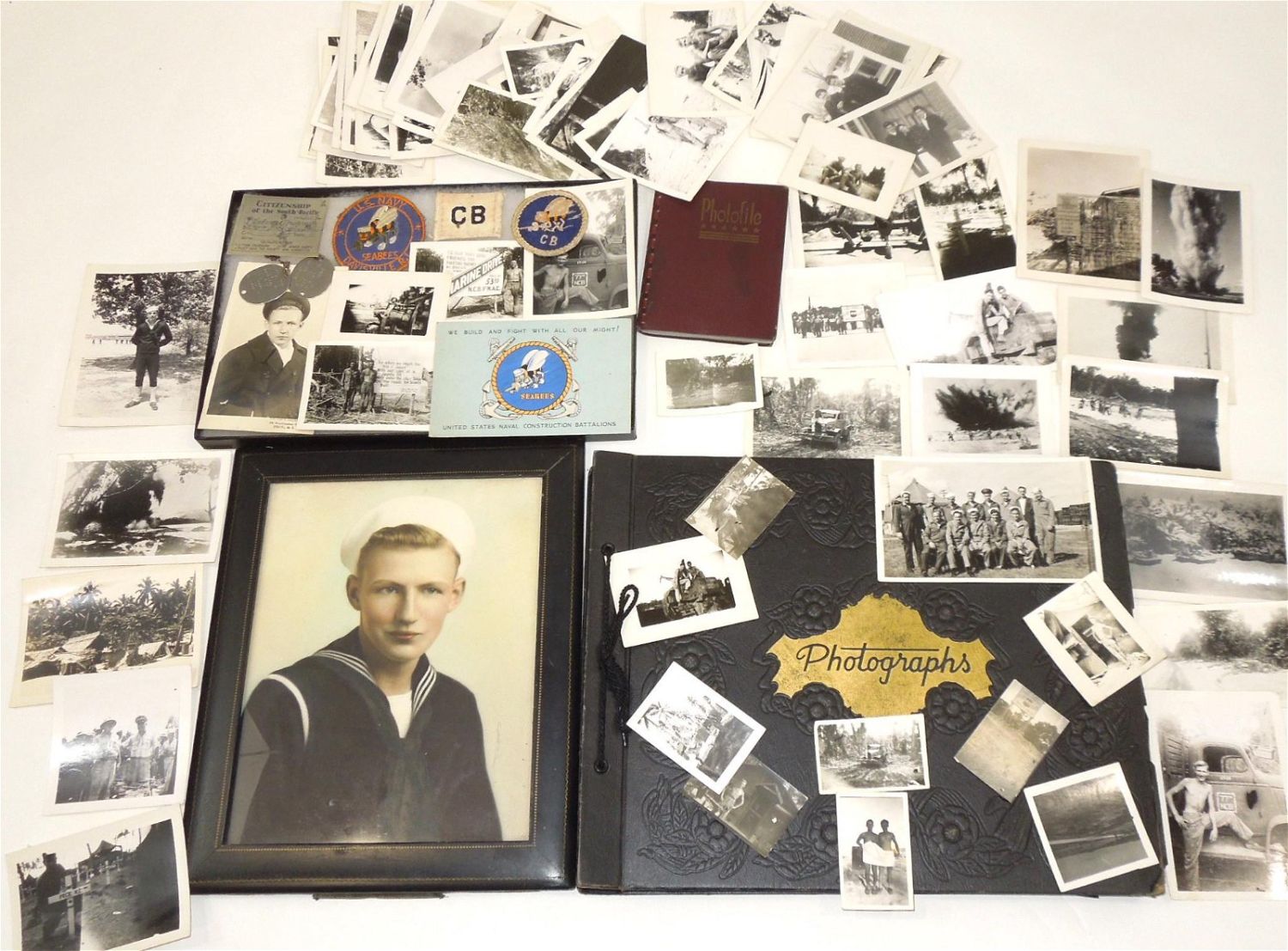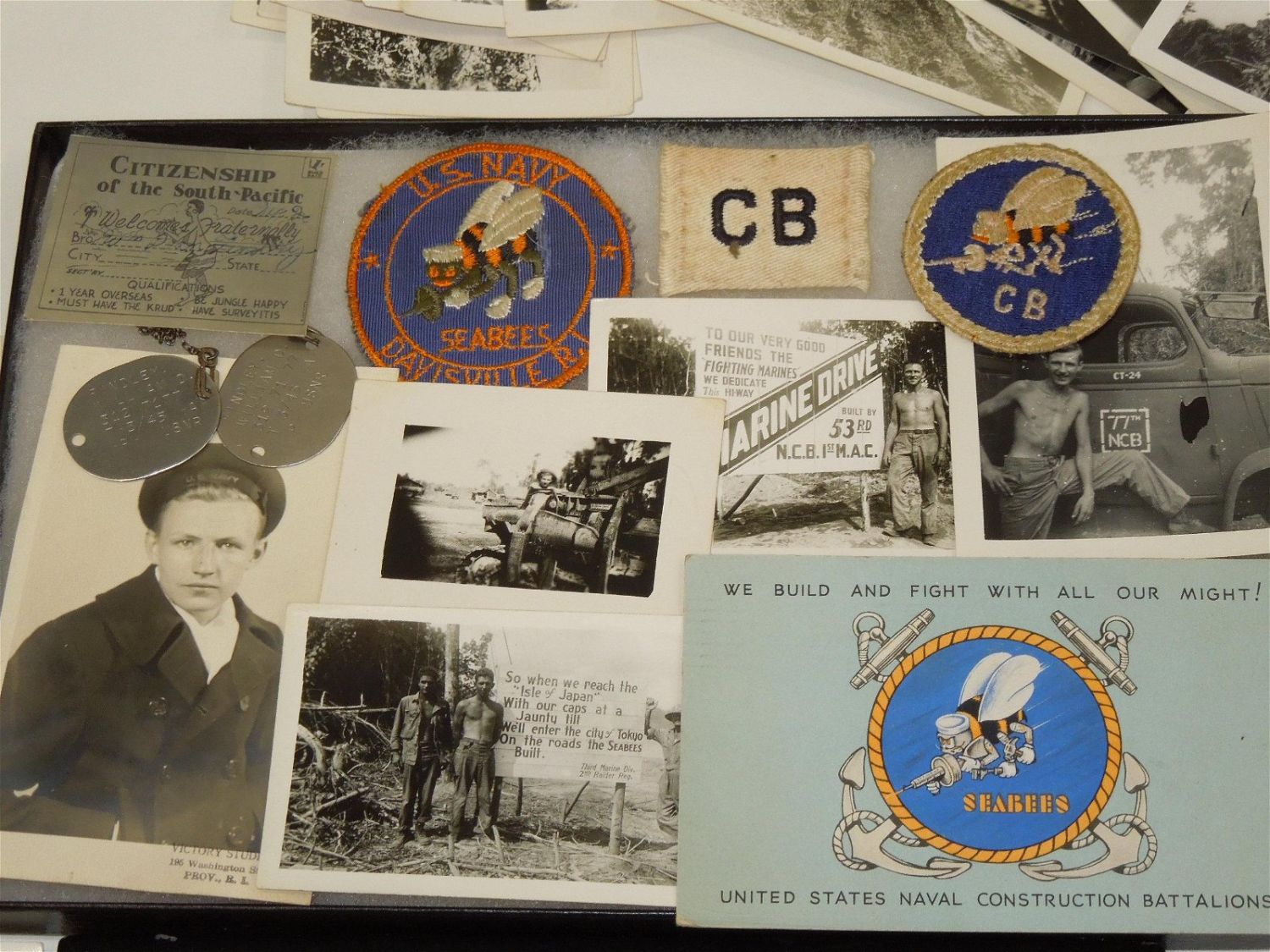 WWII USN Navy Seabees Paper, Patches, Album & Dog Tag Group. Group named to William D. Findley who was attached to the 77th Naval Construction Battalion. History of 77th NCB in WWII: The 77th NCB arrived on 25 September 1943, in the midst of a Japanese bombing attack. During this attack the Seabees manned guns and took over first-aid and evacuation work. In spite of casualties and severe losses of vital equipment, the Seabees immediately set to work clearing jungle, repairing roads and bridges, and constructing gun emplacements and LST landing facilities. Included in this group are a scrapbook, dog tags, photos / negatives, patches, paper and more. Nice condition for its age. The display case does not come with this group.