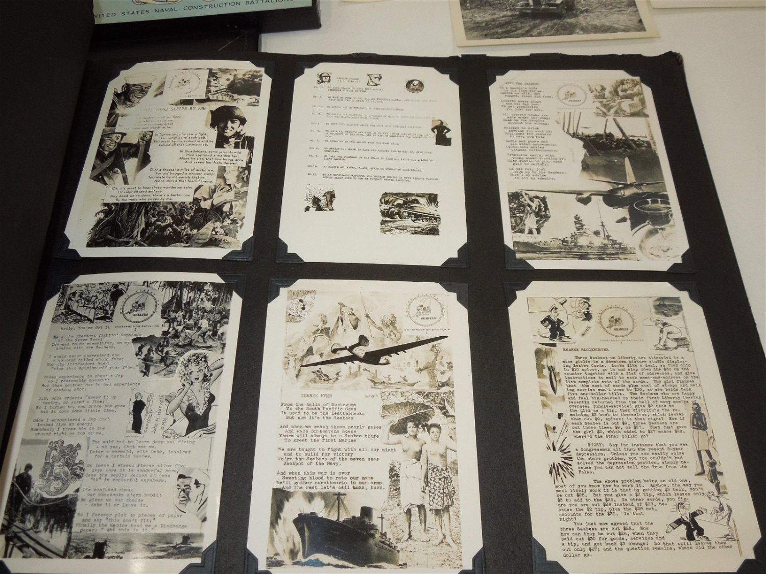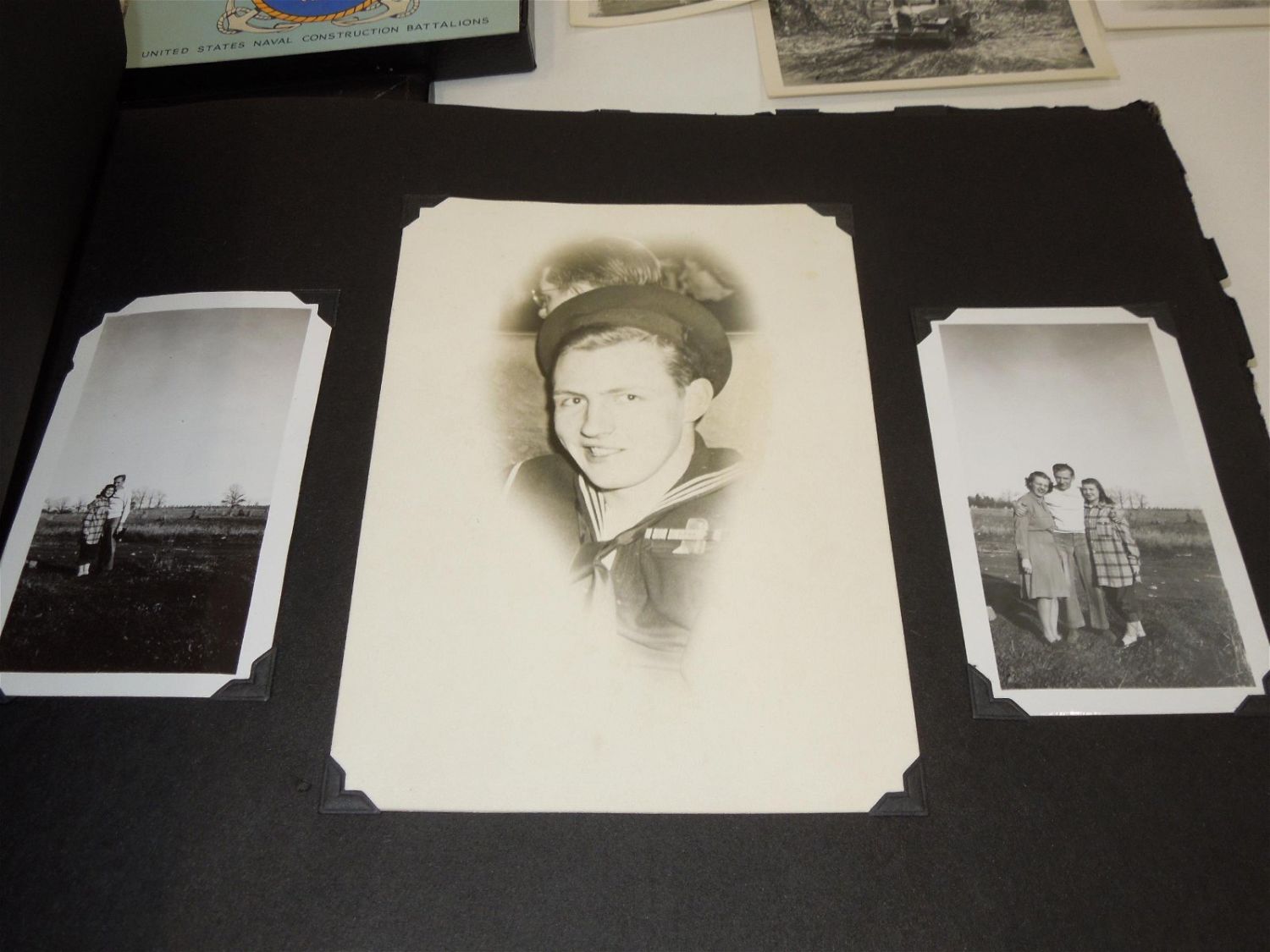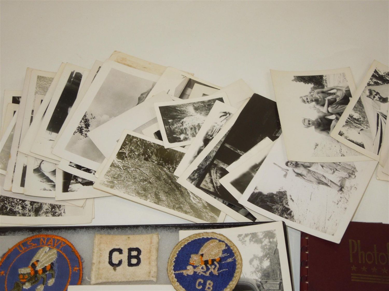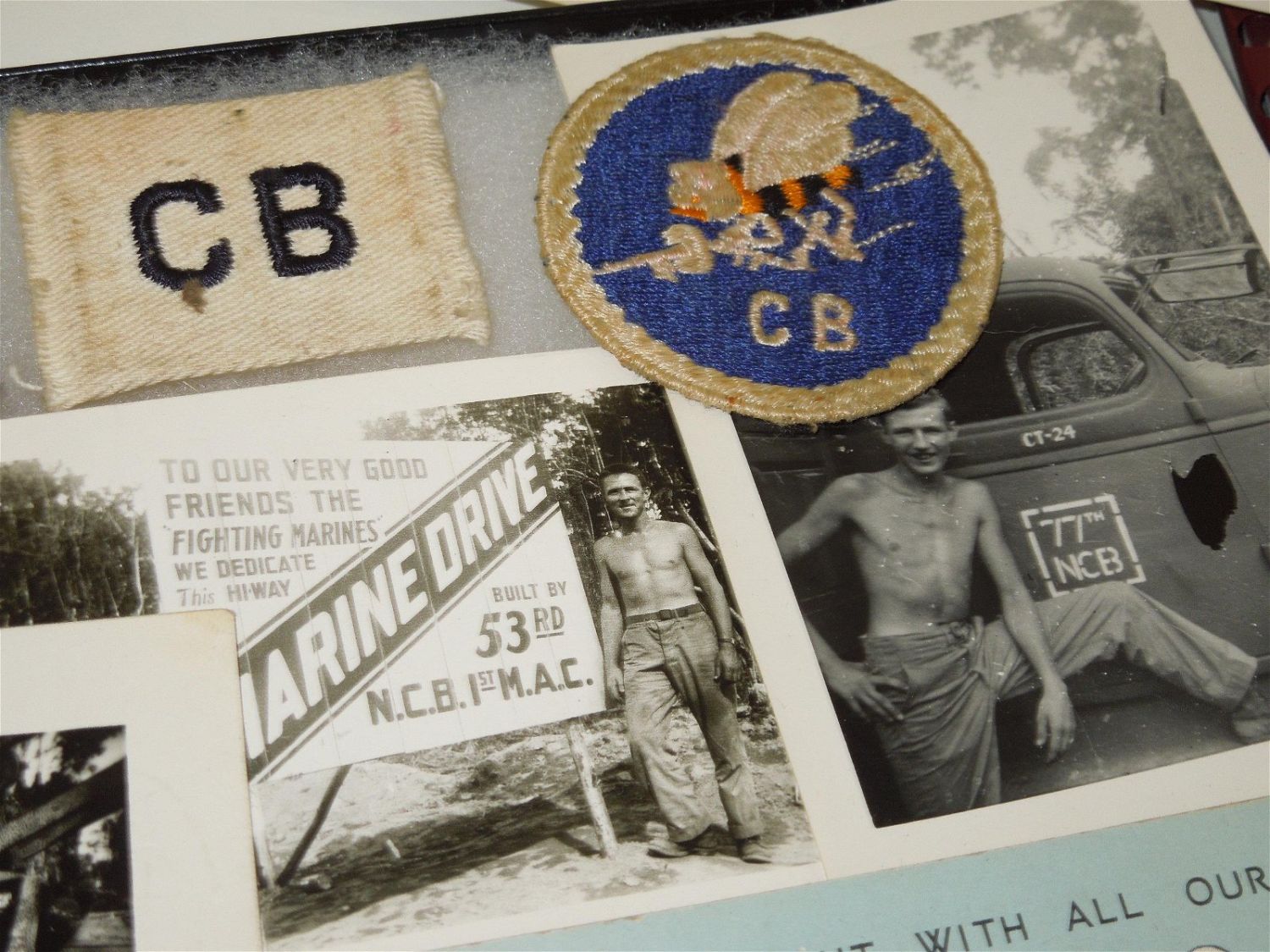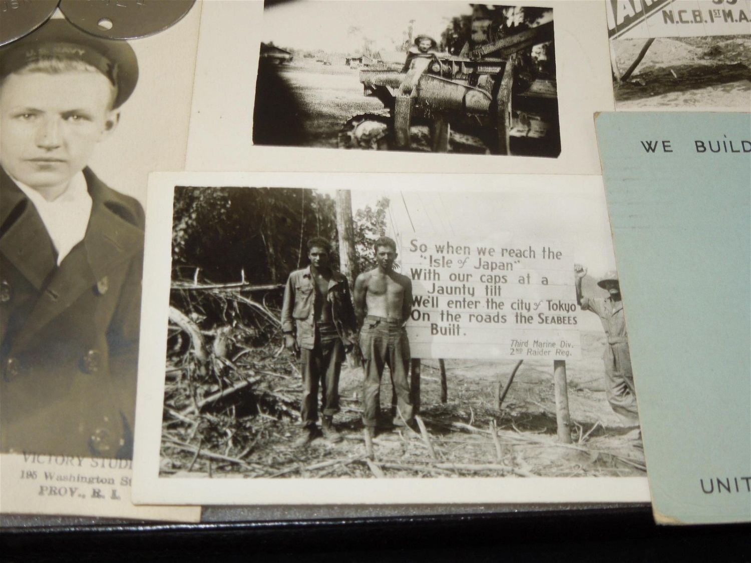 WWII USN Navy Seabees Paper, Patches, Album & Dog Tag Group. Group named to William D. Findley who was attached to the 77th Naval Construction Battalion. History of 77th NCB in WWII: The 77th NCB arrived on 25 September 1943, in the midst of a Japanese bombing attack. During this attack the Seabees manned guns and took over first-aid and evacuation work. In spite of casualties and severe losses of vital equipment, the Seabees immediately set to work clearing jungle, repairing roads and bridges, and constructing gun emplacements and LST landing facilities. Included in this group are a scrapbook, dog tags, photos / negatives, patches, paper and more. Nice condition for its age. The display case does not come with this group.