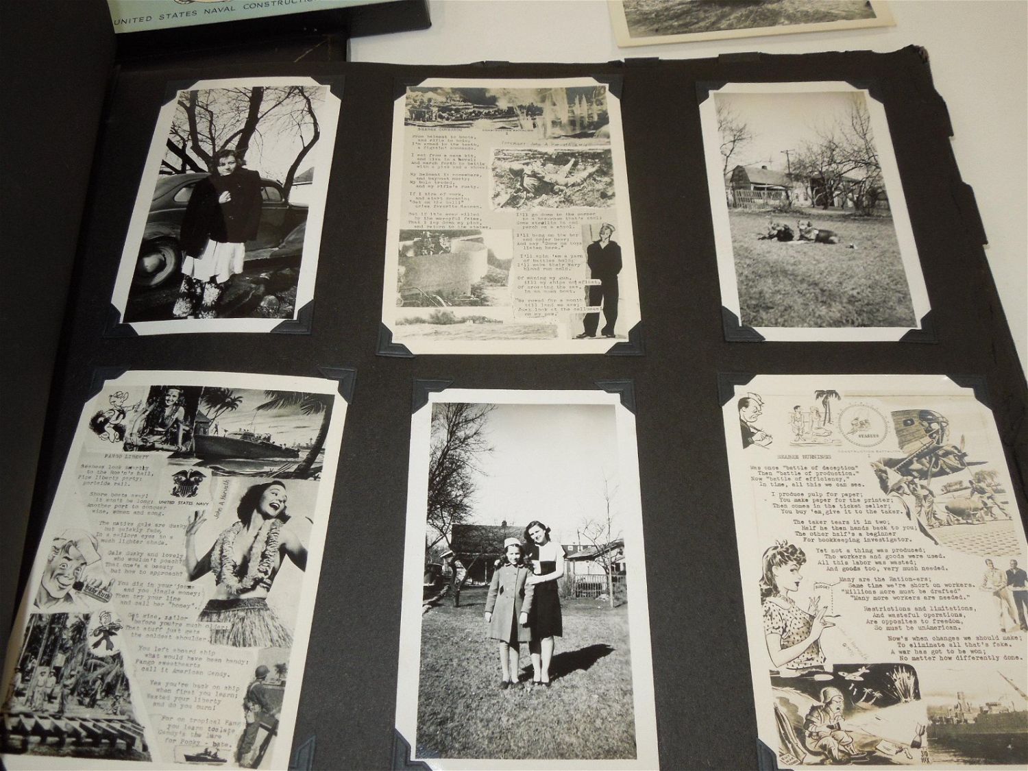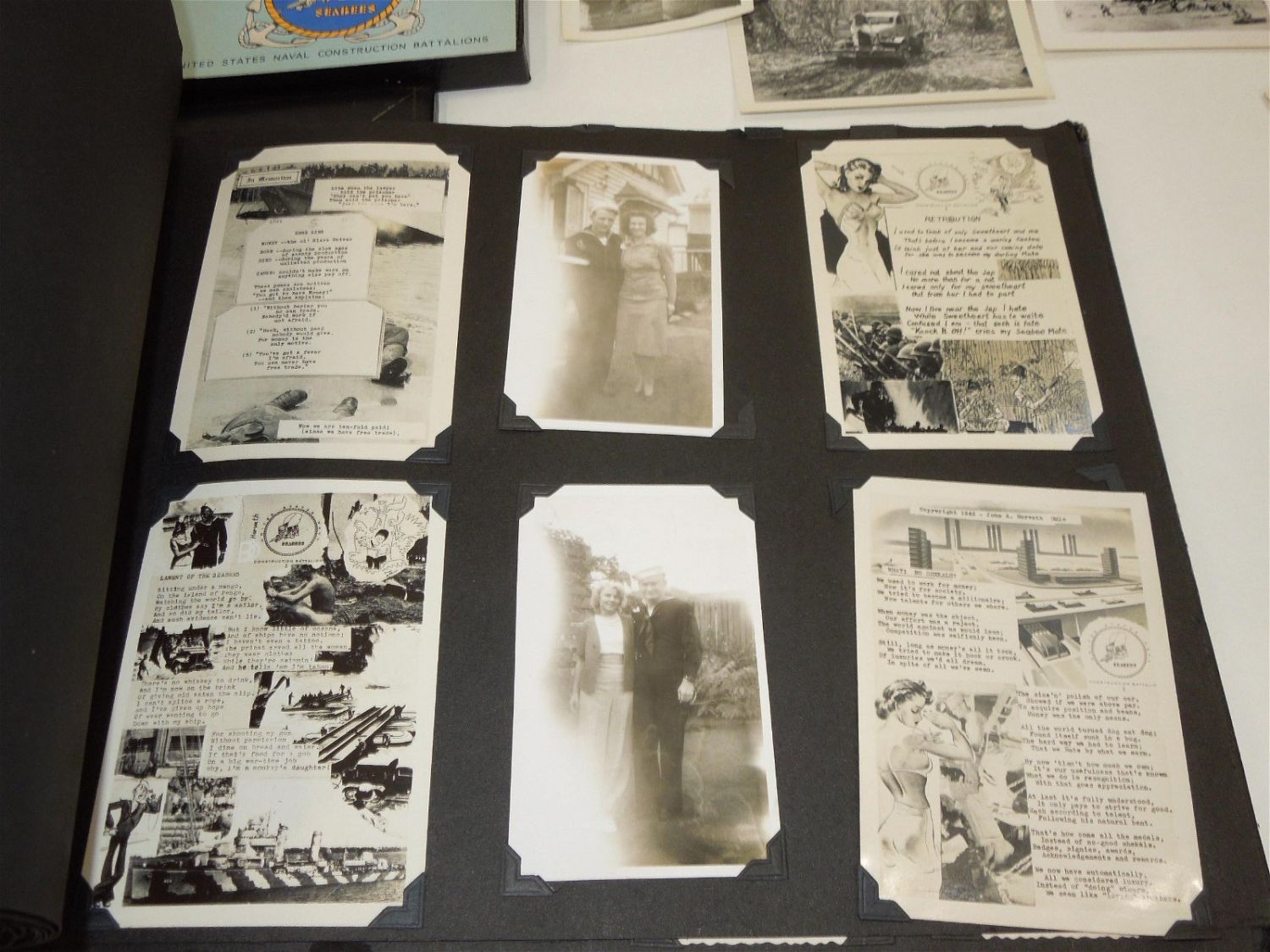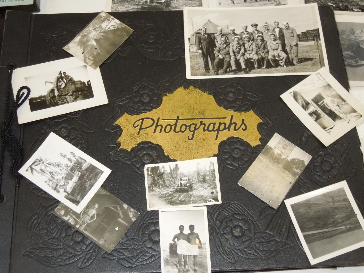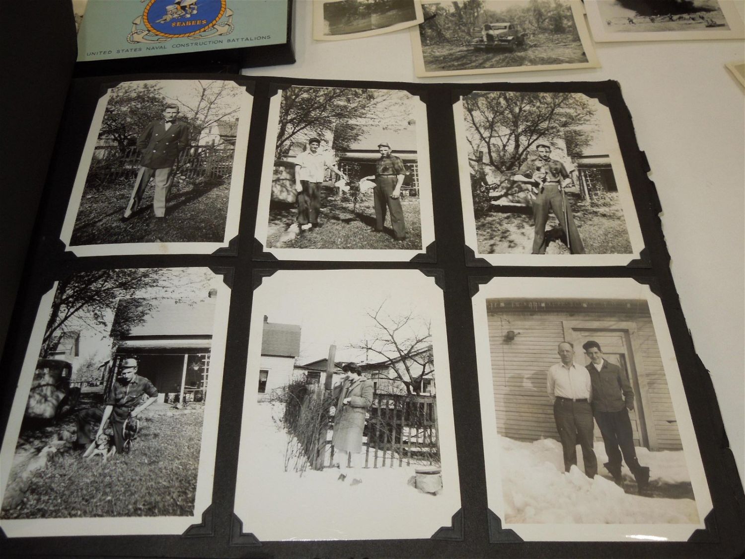 WWII USN Navy Seabees Paper, Patches, Album & Dog Tag Group. Group named to William D. Findley who was attached to the 77th Naval Construction Battalion. History of 77th NCB in WWII: The 77th NCB arrived on 25 September 1943, in the midst of a Japanese bombing attack. During this attack the Seabees manned guns and took over first-aid and evacuation work. In spite of casualties and severe losses of vital equipment, the Seabees immediately set to work clearing jungle, repairing roads and bridges, and constructing gun emplacements and LST landing facilities. Included in this group are a scrapbook, dog tags, photos / negatives, patches, paper and more. Nice condition for its age. The display case does not come with this group.