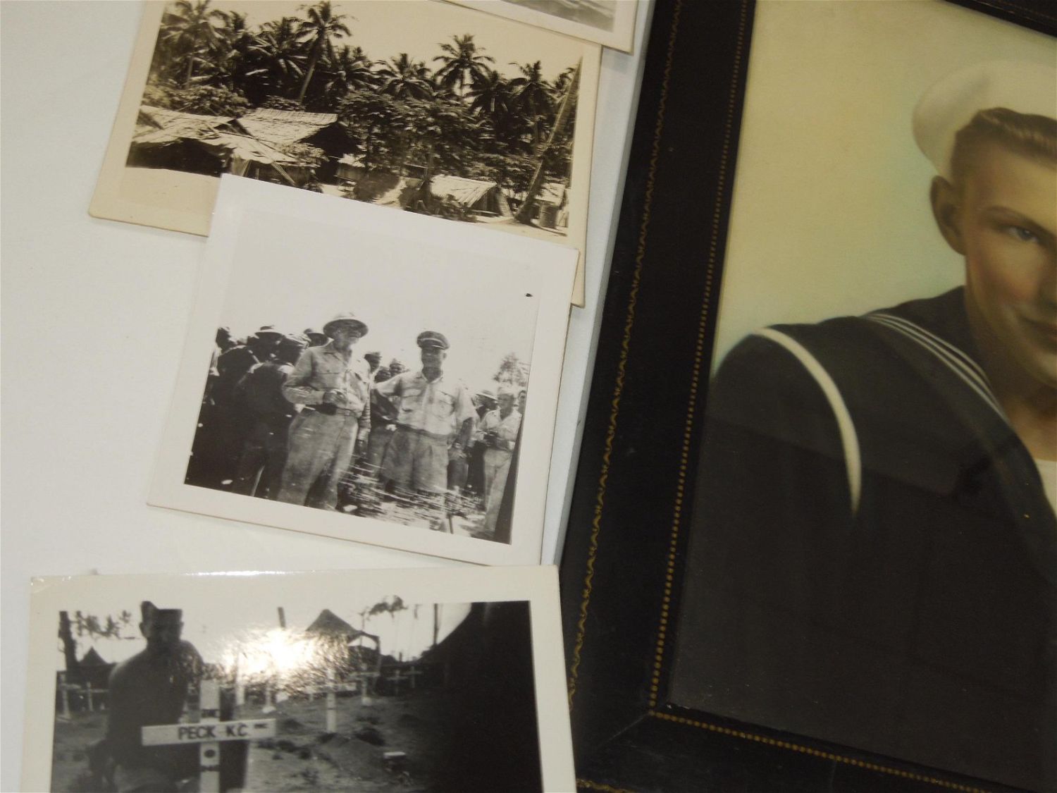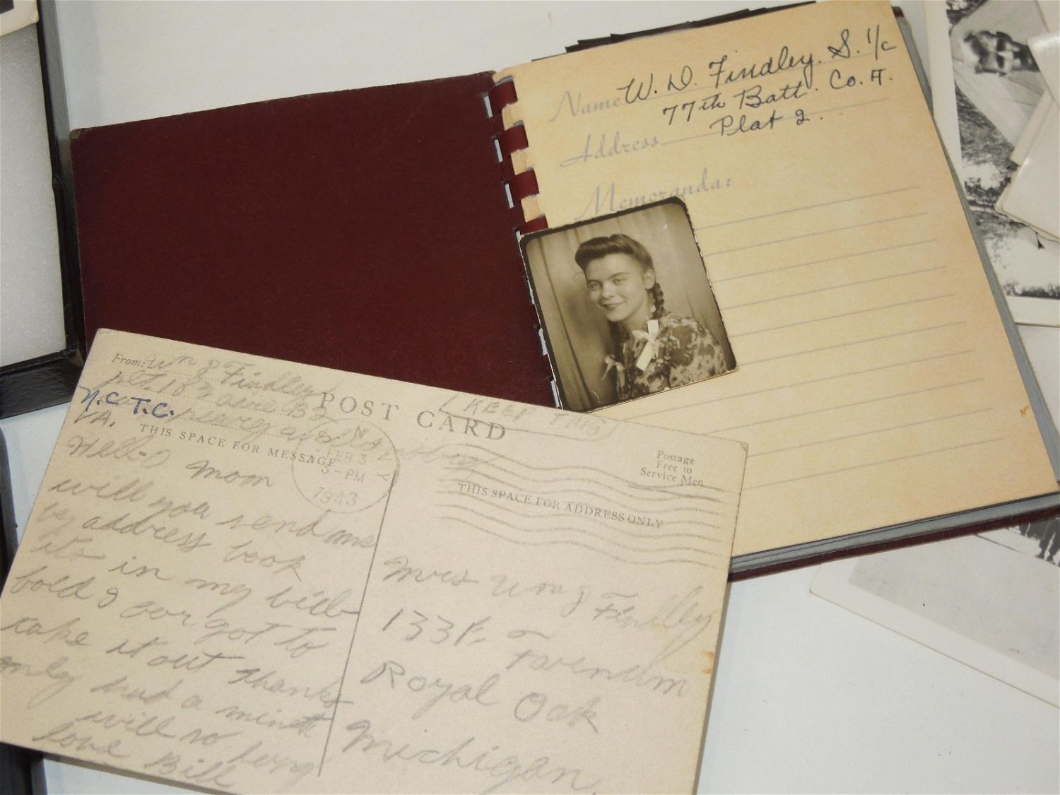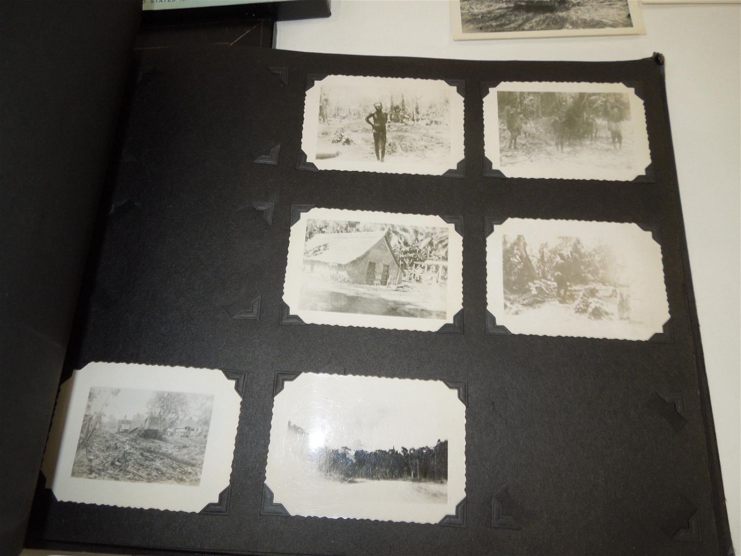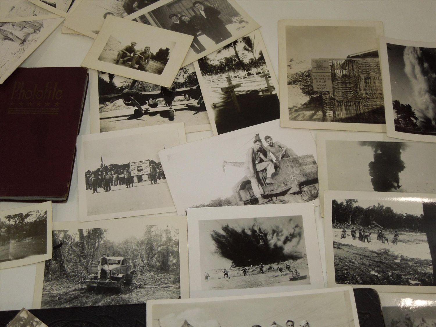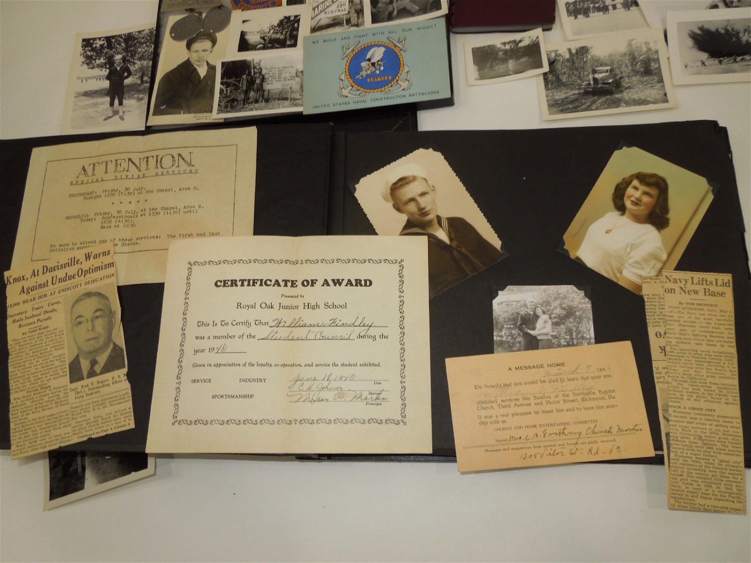 WWII USN Navy Seabees Paper, Patches, Album & Dog Tag Group. Group named to William D. Findley who was attached to the 77th Naval Construction Battalion. History of 77th NCB in WWII: The 77th NCB arrived on 25 September 1943, in the midst of a Japanese bombing attack. During this attack the Seabees manned guns and took over first-aid and evacuation work. In spite of casualties and severe losses of vital equipment, the Seabees immediately set to work clearing jungle, repairing roads and bridges, and constructing gun emplacements and LST landing facilities. Included in this group are a scrapbook, dog tags, photos / negatives, patches, paper and more. Nice condition for its age. The display case does not come with this group.