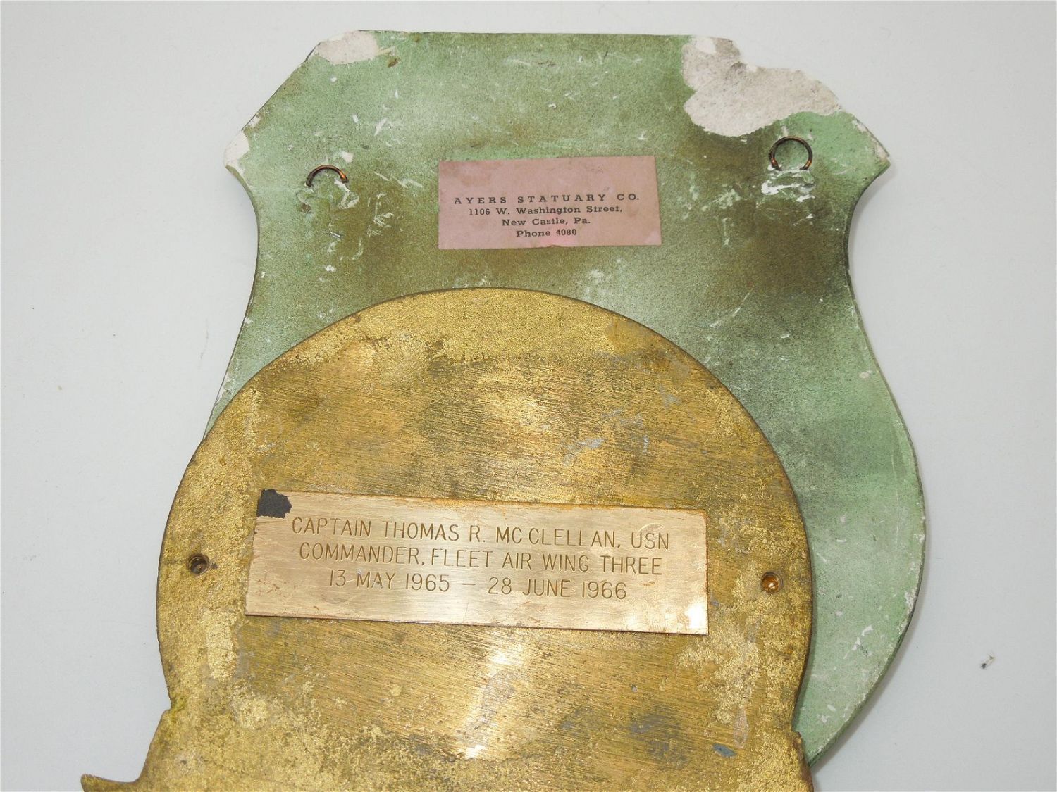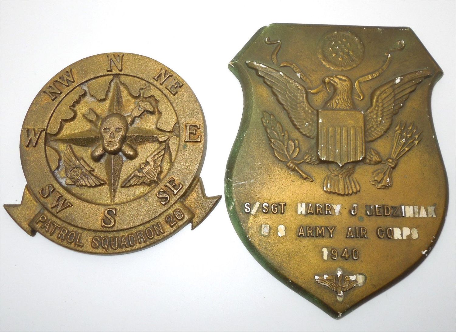 WWII – Vietnam US Army Air Corps & Navy Plaques Lot. The 1940 Army Air Corps plaque is named to S//SGT Harry J. Jedziniak. Made of plaster. This plaque is not perfect. There are raised letters and numbers missing and missing plaster on the reverse. You will also receive a USN Navy Patrol Squadron 26 heavy metal plaque named to Thomas R. McClellan Commander Fleet Air Wing Three. Nice overall condition.