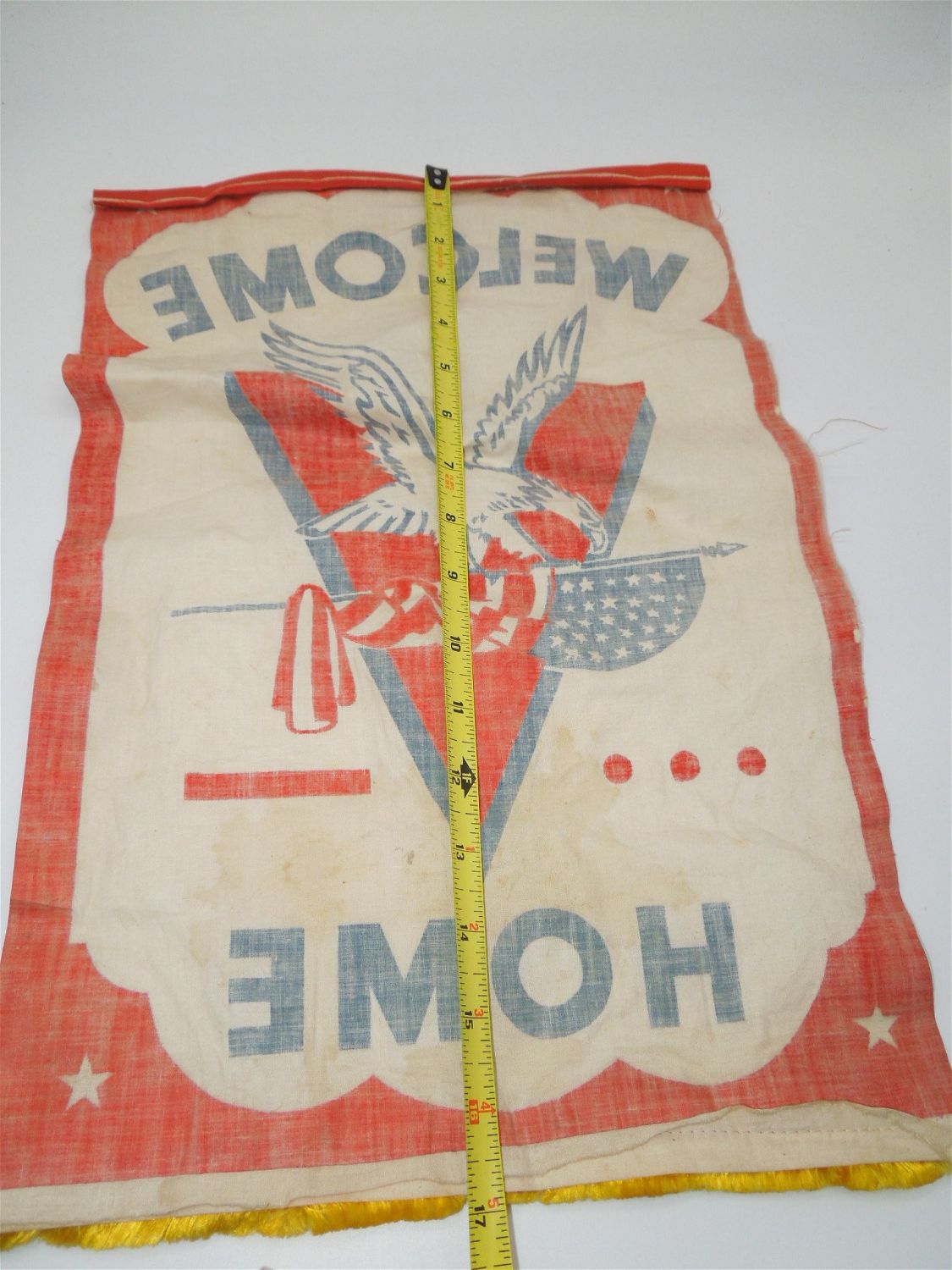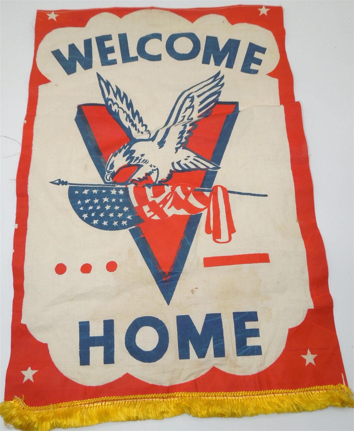 WWII Era Welcome Home V For Victory Home Front Banner. Great looking colors to this banner. The approximate size is 11.75 x 17.75 inches. Condition is very good for the time period. Some marks / foxing from age is displayed on this piece.