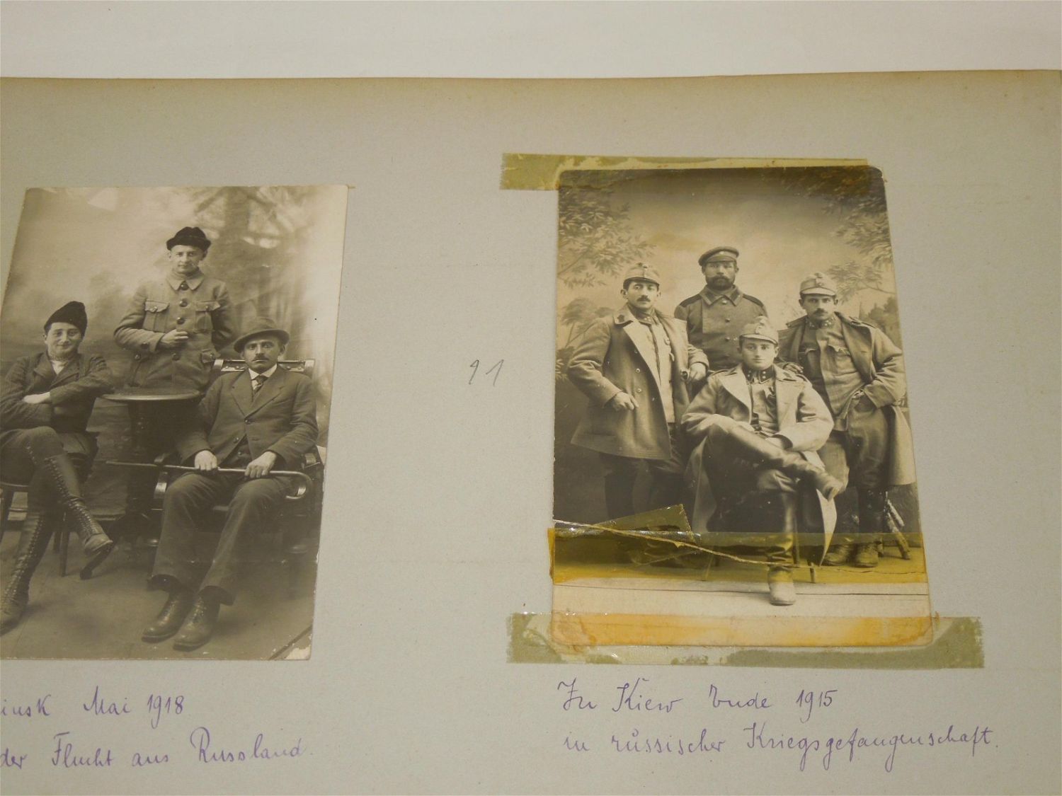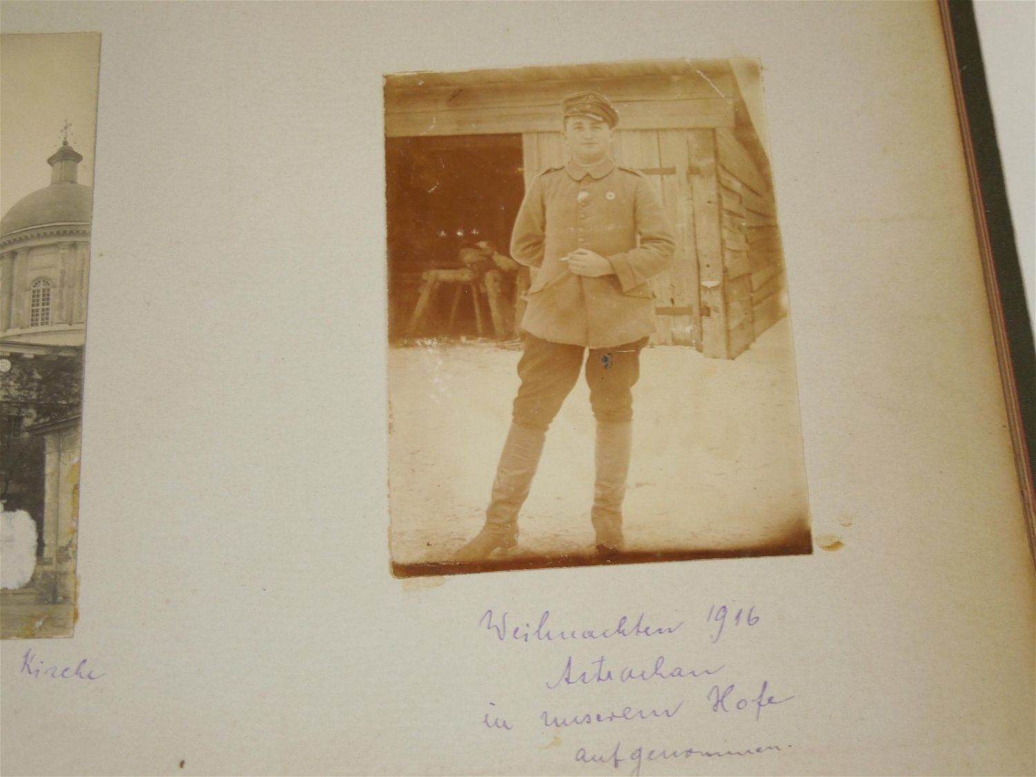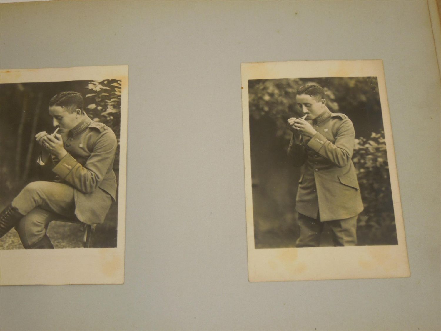 WWI Imperial German Photo Album Scrapbook. Named to Dr. Julius Voehl who was born in Giessen, Germany on 1895 and died in Syracuse, New York in 1986. Included are 45 plus photos and Real Picture Post Cards (RPPC) from 1913 to 1918. Most photos are identified in German. Nice condition for its age. The front cover is partially detached.