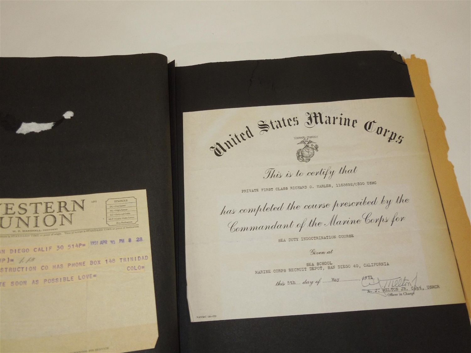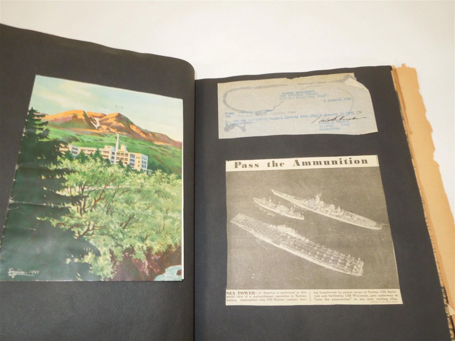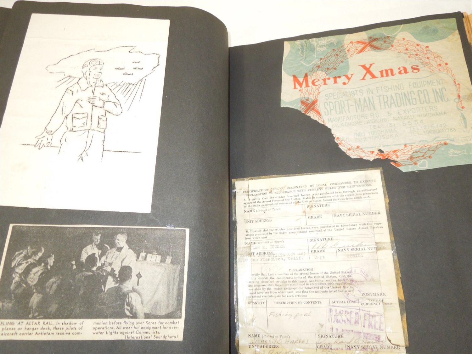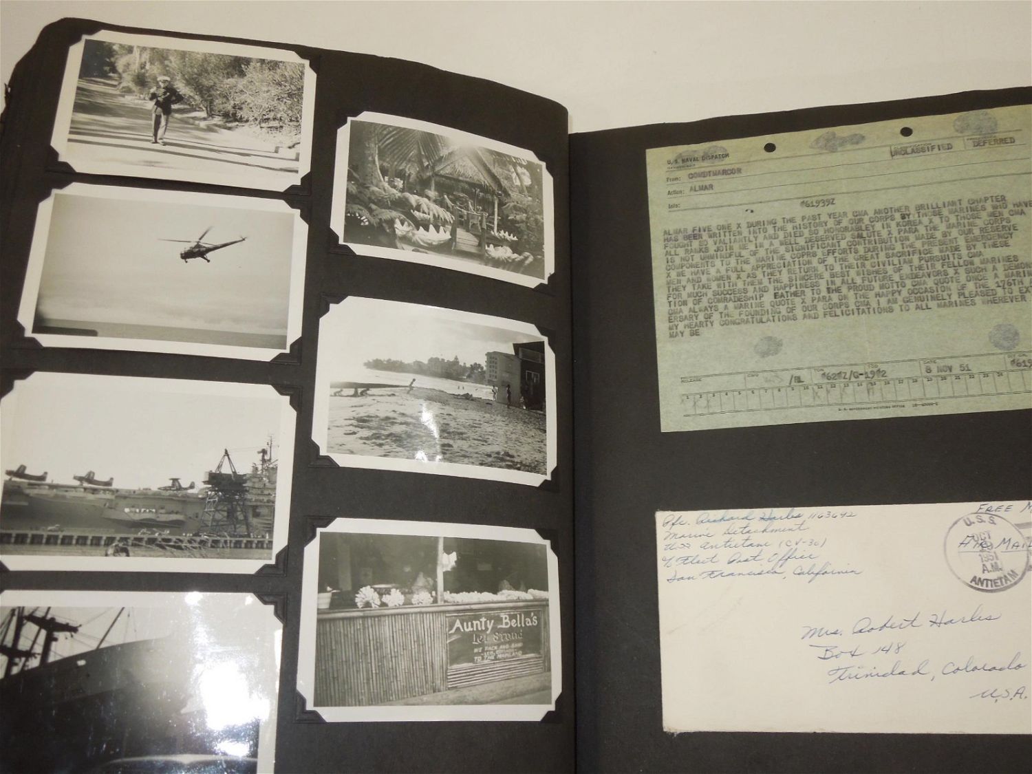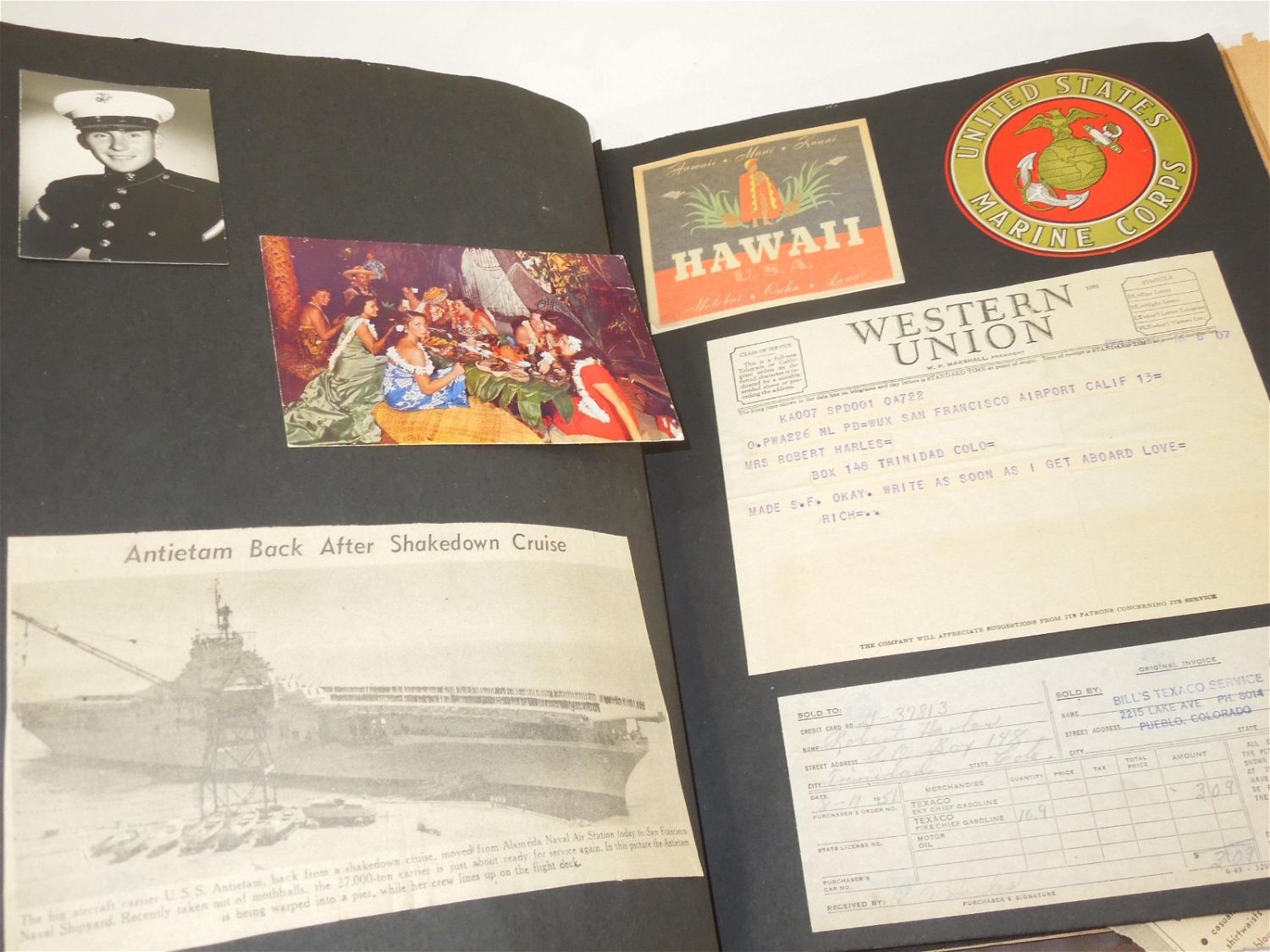 Korean War USMC Marine Corps Scrapbook Album. Named to Marine Corp Richard O. Harles. Harles was stationed aboard the USS Aircraft Carrier Antietam during the Korean War. Included in this Scrapbook / Album are documents, papers, certificates, letters, photos, news clippings, post cards, Marine Corps Pfc stripes, plus more. Good readable condition for its age.