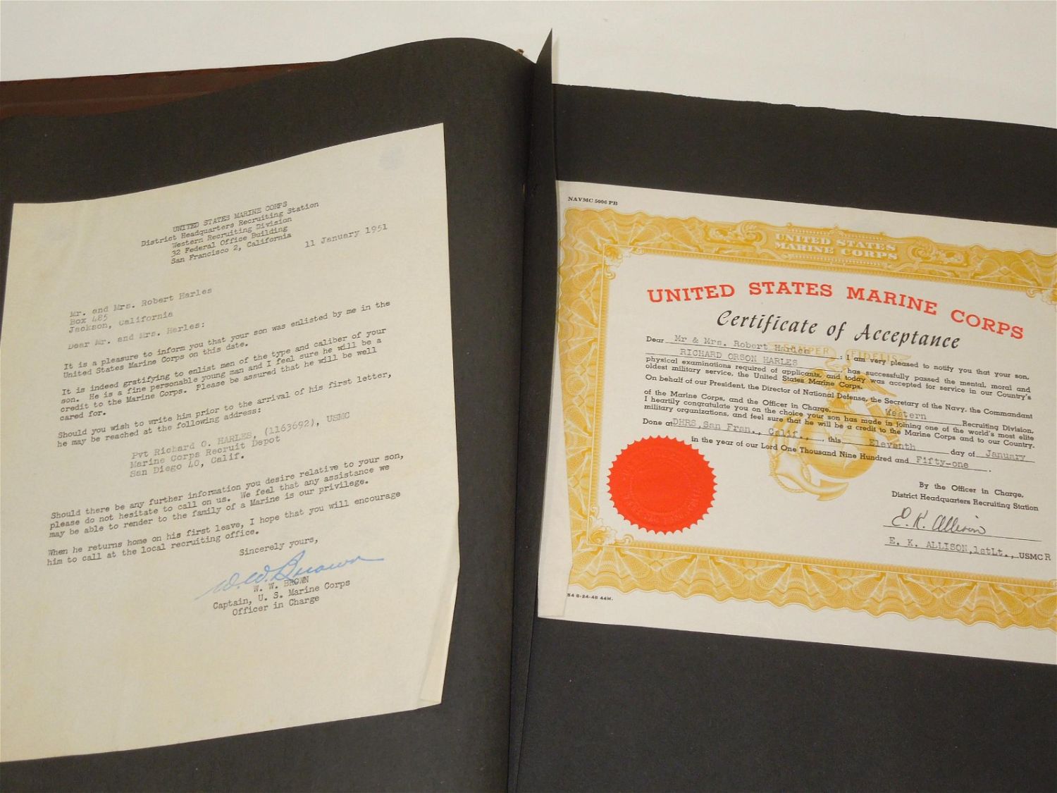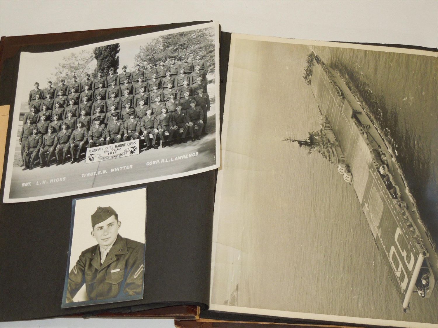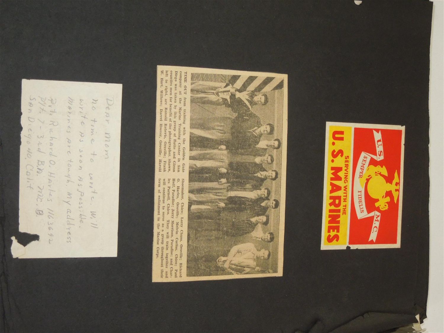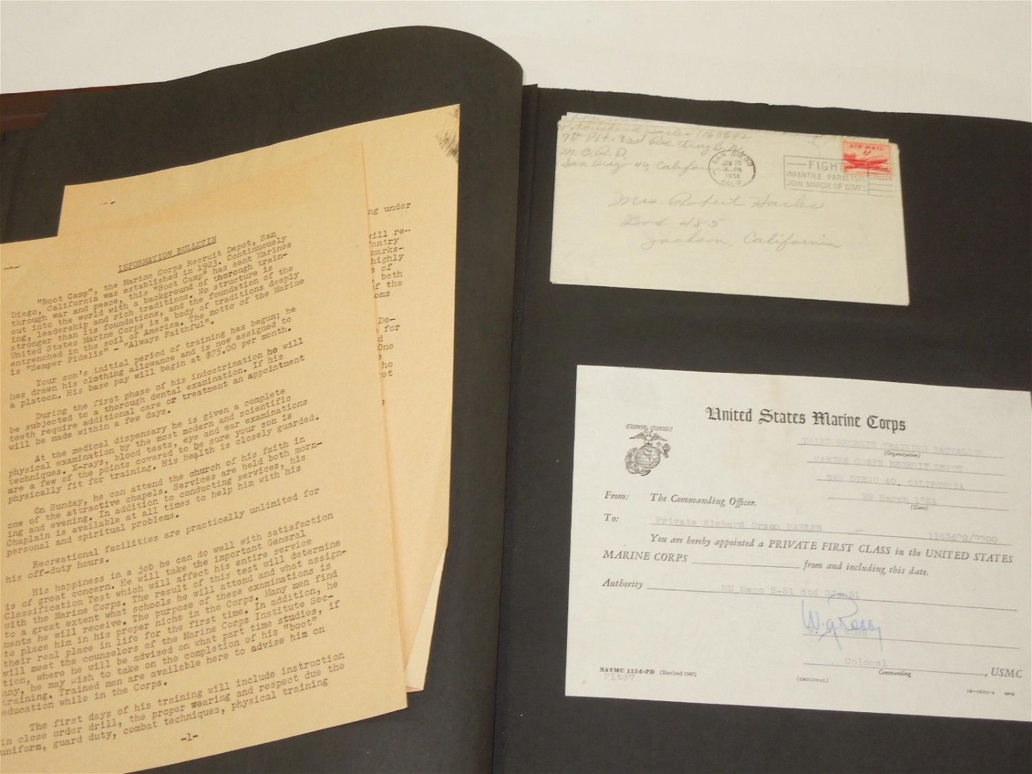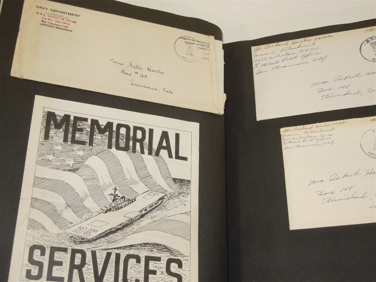 Korean War USMC Marine Corps Scrapbook Album. Named to Marine Corp Richard O. Harles. Harles was stationed aboard the USS Aircraft Carrier Antietam during the Korean War. Included in this Scrapbook / Album are documents, papers, certificates, letters, photos, news clippings, post cards, Marine Corps Pfc stripes, plus more. Good readable condition for its age.