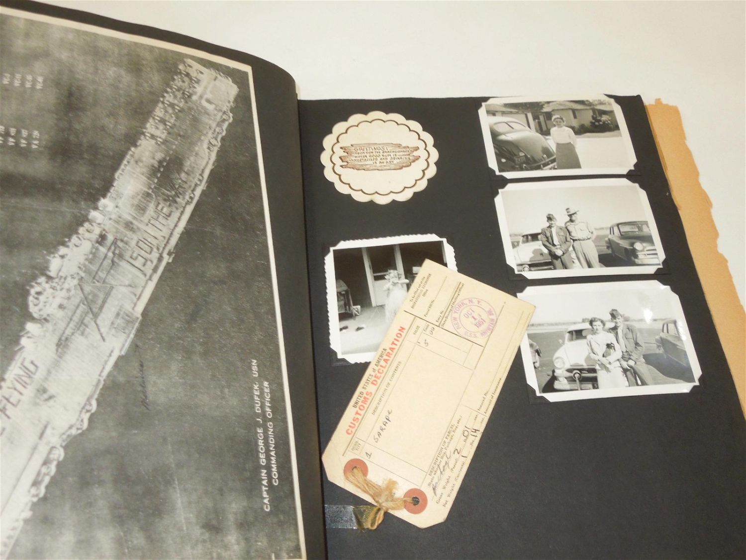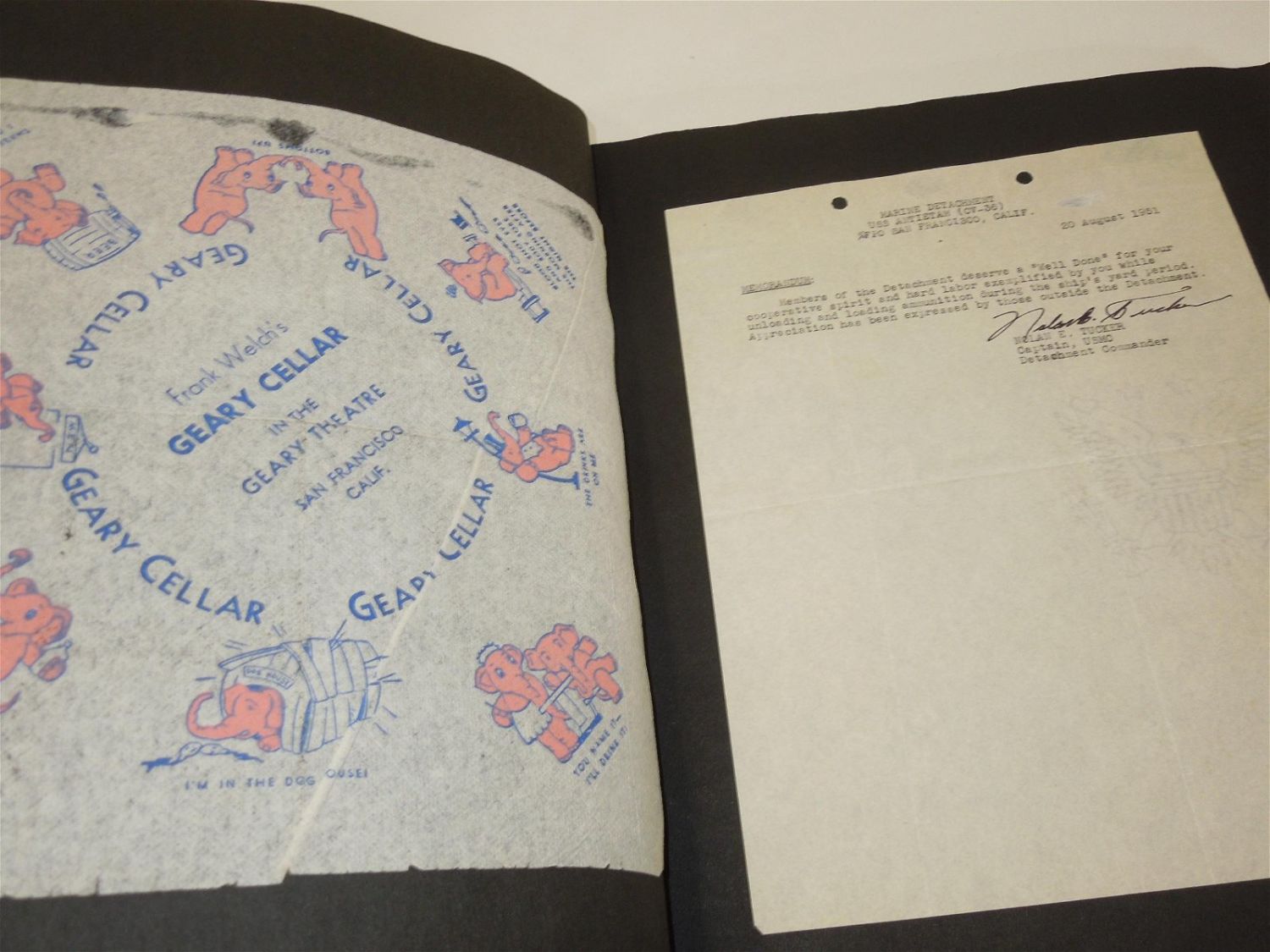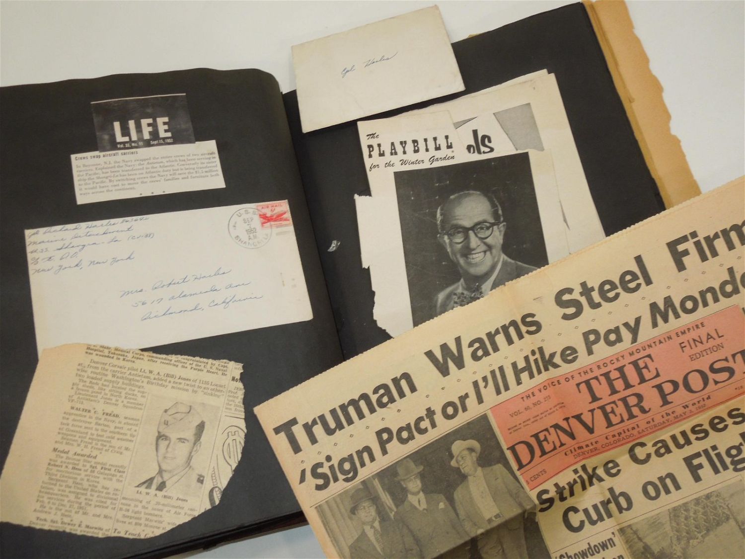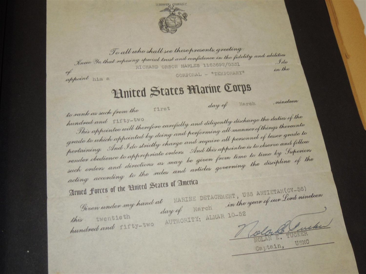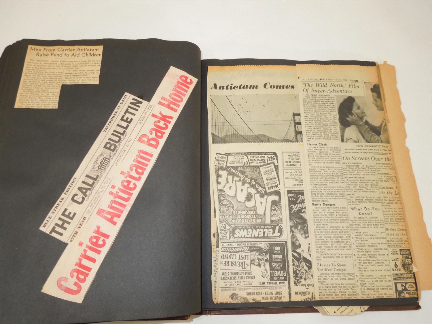 Korean War USMC Marine Corps Scrapbook Album. Named to Marine Corp Richard O. Harles. Harles was stationed aboard the USS Aircraft Carrier Antietam during the Korean War. Included in this Scrapbook / Album are documents, papers, certificates, letters, photos, news clippings, post cards, Marine Corps Pfc stripes, plus more. Good readable condition for its age.