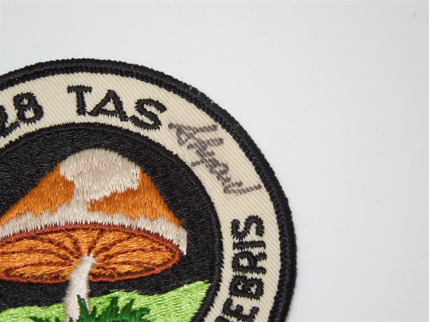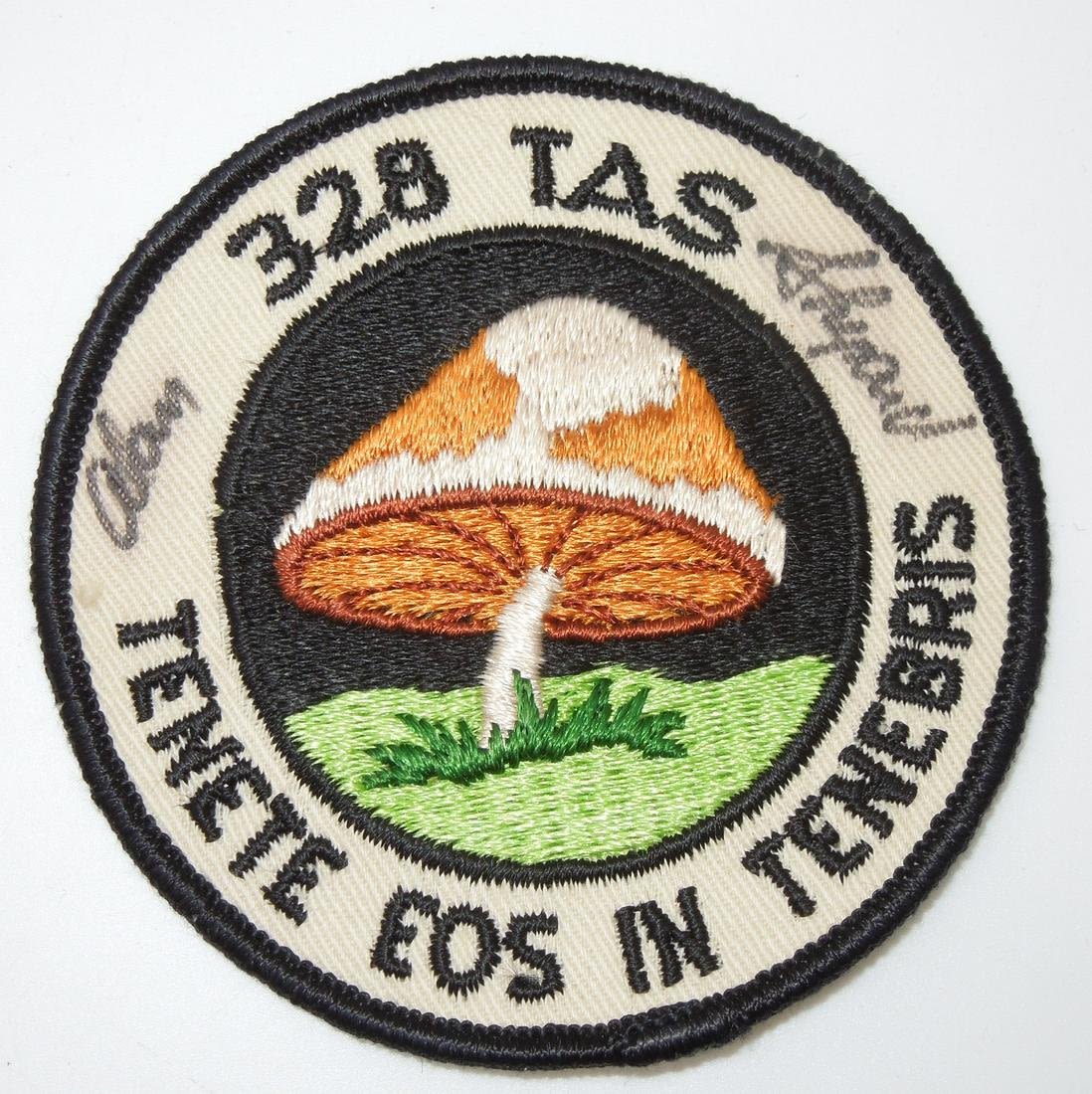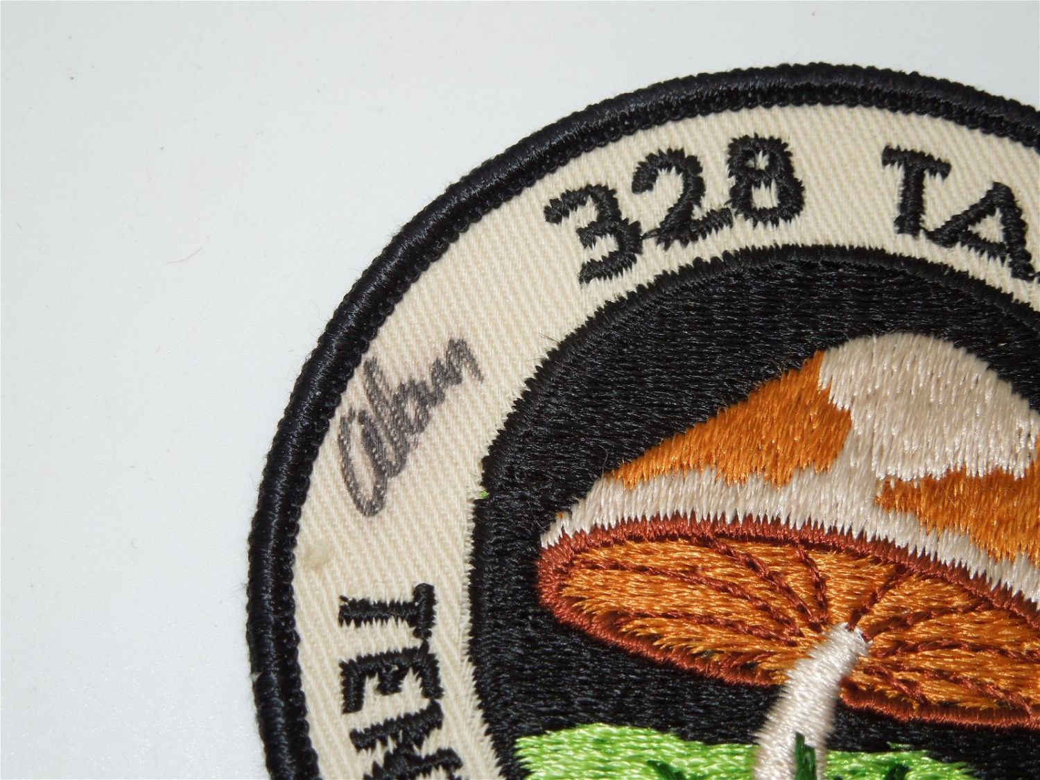 Original 328th TAS patch hand signed by Astronaut, and First American in Space Alan Shepard. The signature is consistent with original autographs of his, and some of the ink has bled into the white.