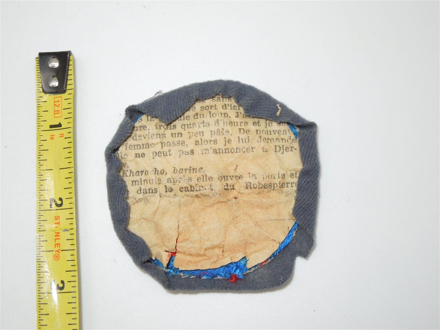 WWI French made US Army patch as shown, with French newspaper type backing. Good condition with minor moth holes.