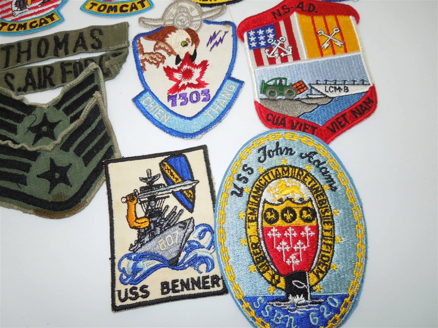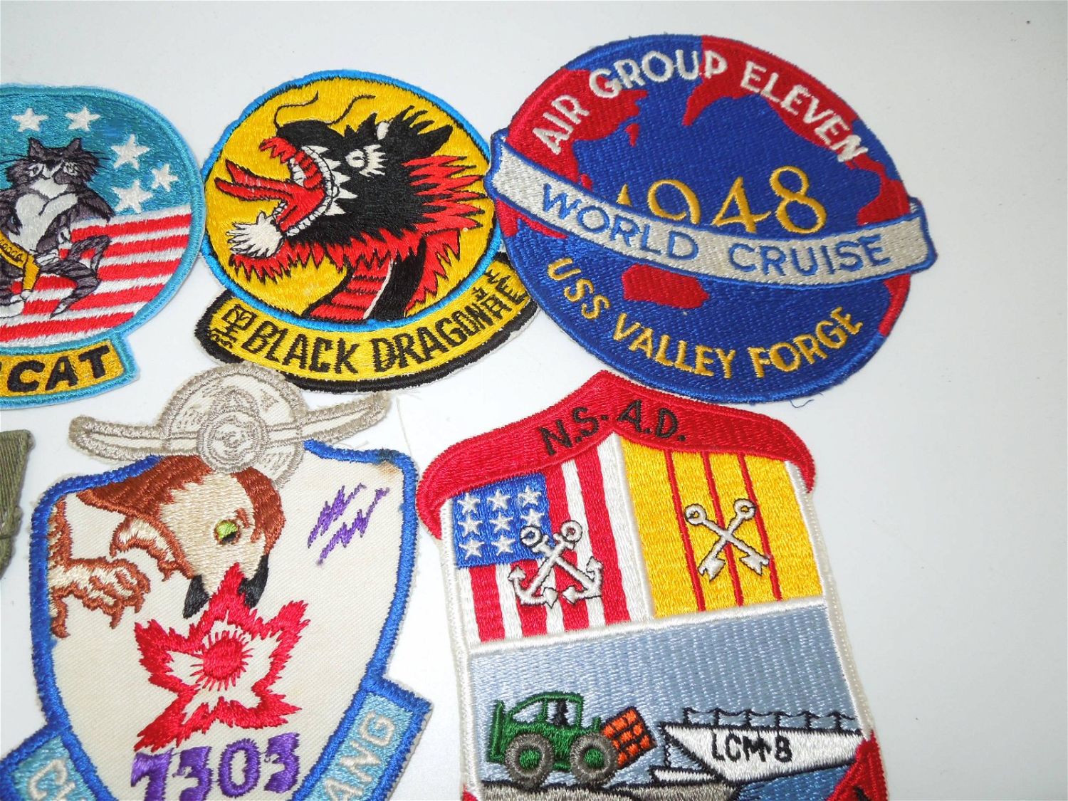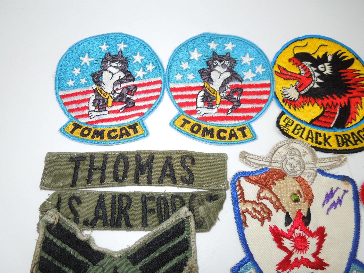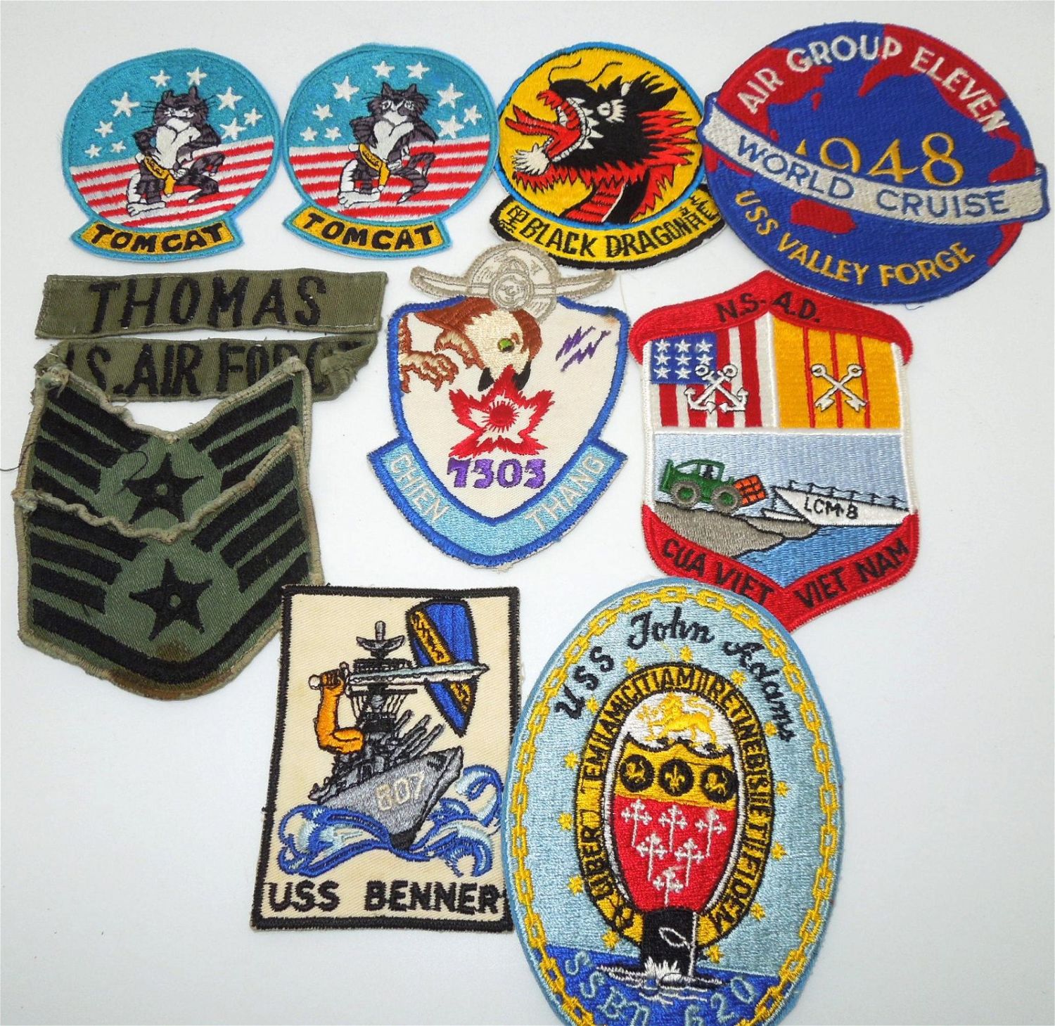 Vintage USAF and US Navy Patch Lot, from the 1950s to 1980s consisting of theater made stripes, Vietnam Patches, Ship Patches, 1948 World Cruise, and theater made Tomcat patches. Good condition with a nice variety!