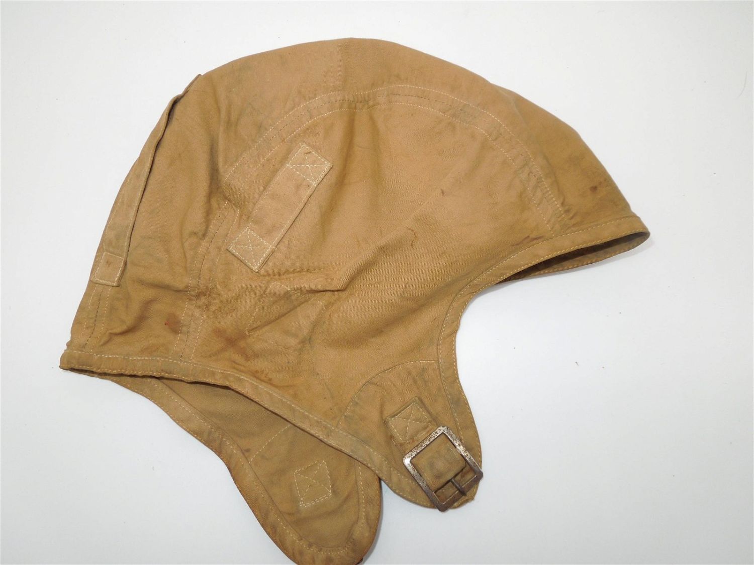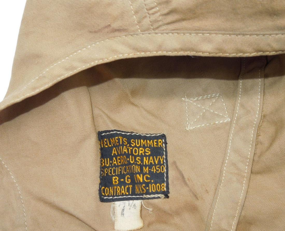 WWII USN Navy Summer Aviators Flying Cloth Flight Helmet. The tag below the right ear reads, BU AERO U.S. Navy Specification M-450 B-G Inc. Contract No. NXS-1008. The size is 7 1/4 inches. Nice condition for its age.