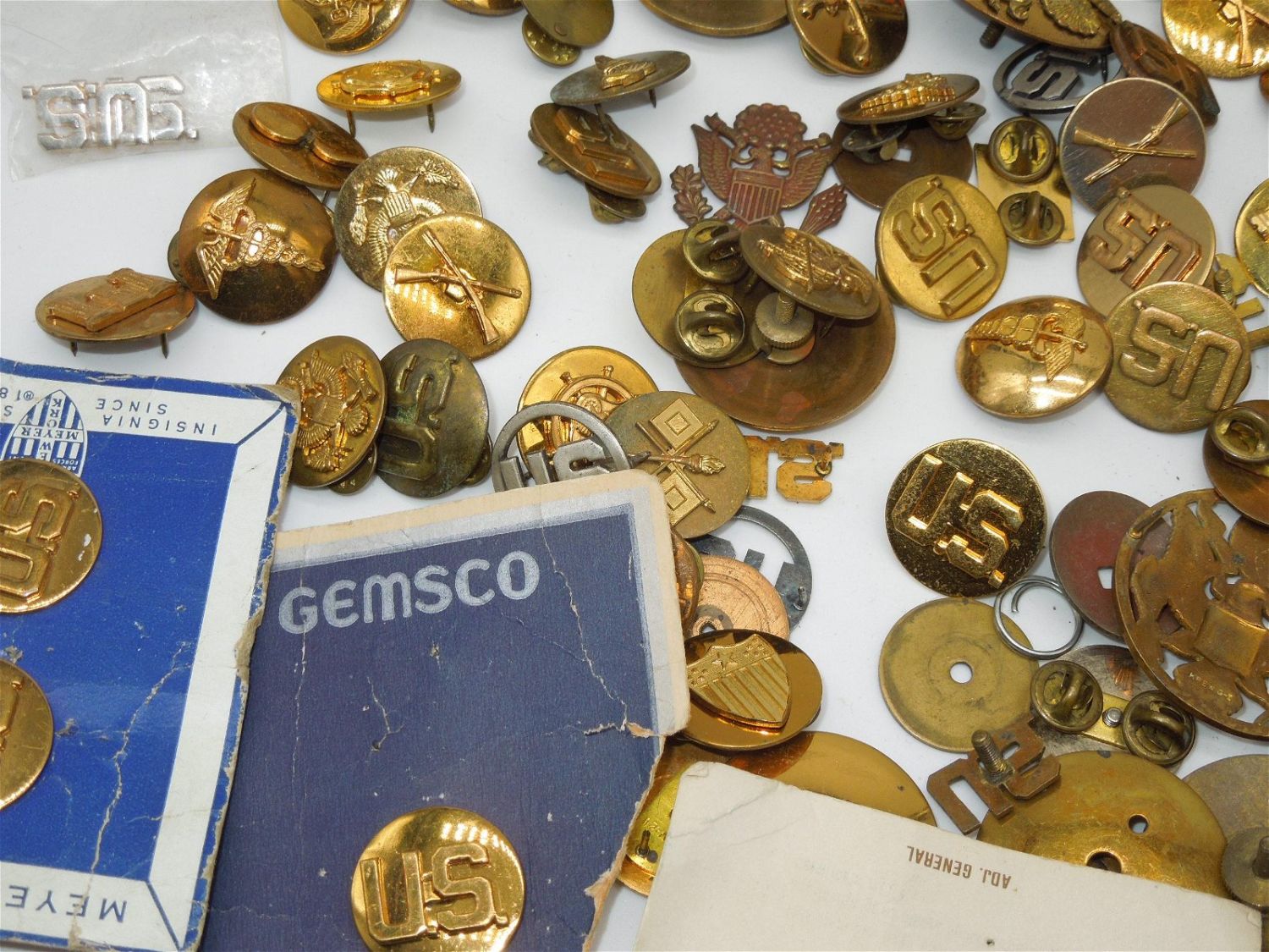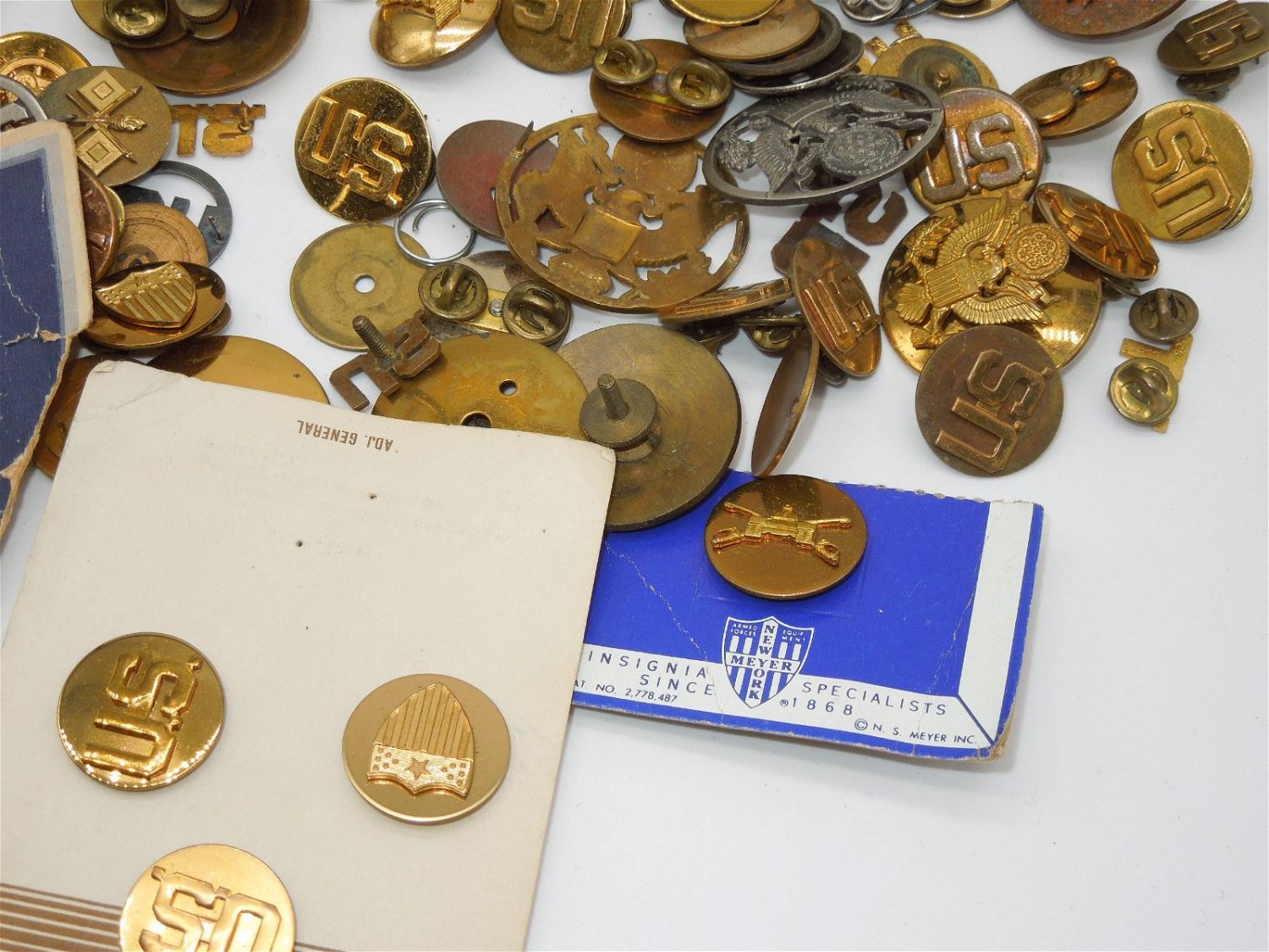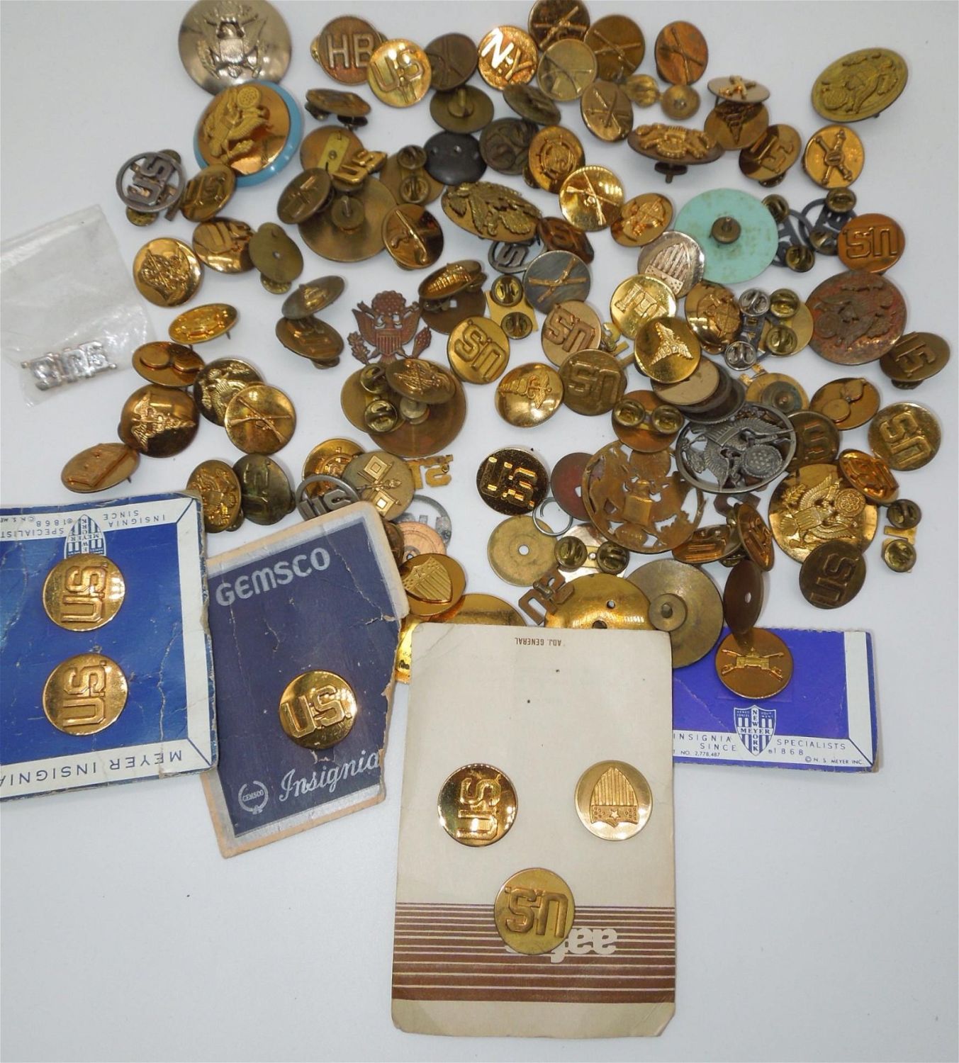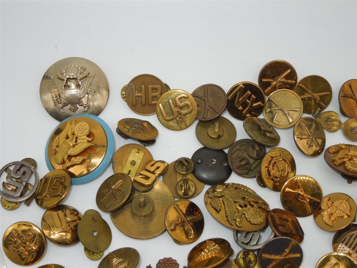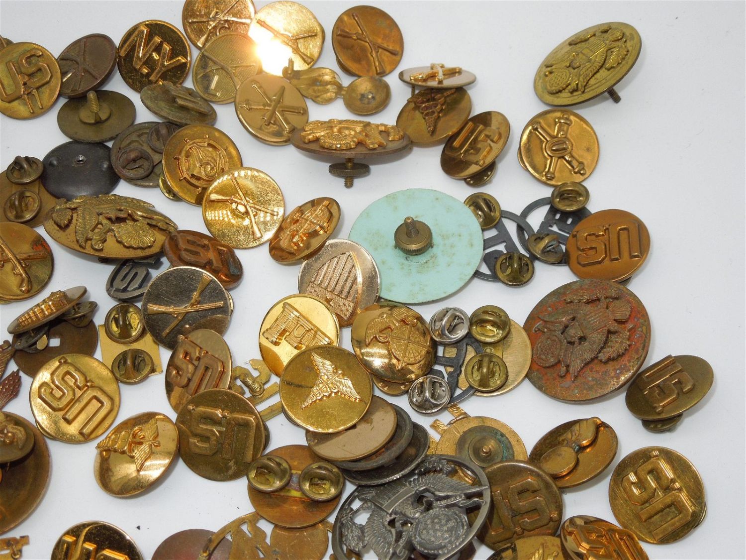 1920s to Modern US Army & USAF Air Force Collar Discs, Pins, Hat Visor Badges, etc. Huge Lot. These pieces include pin back and screw back.There are 110 plus pieces. Good overall condition.