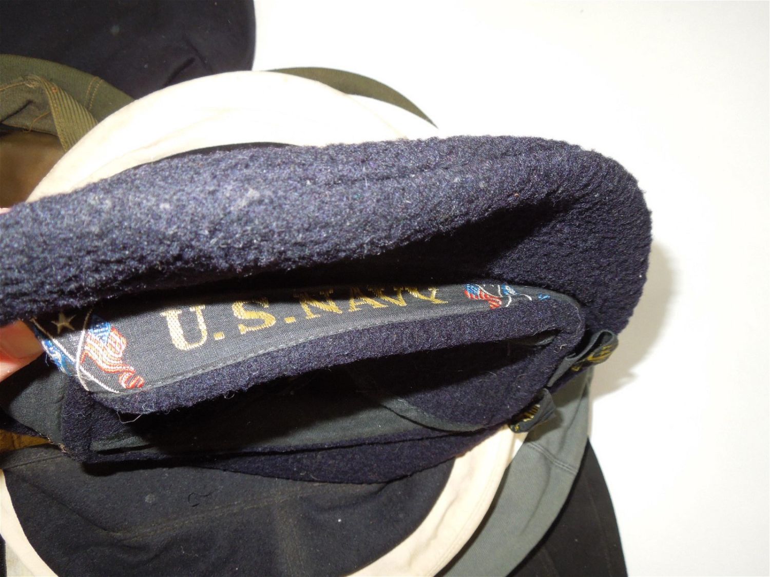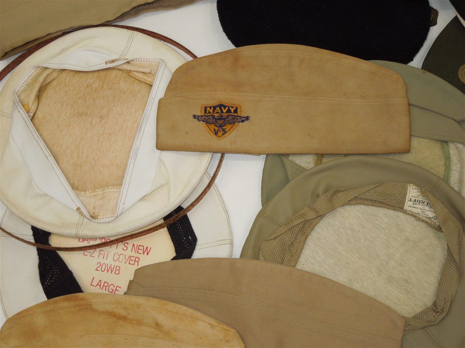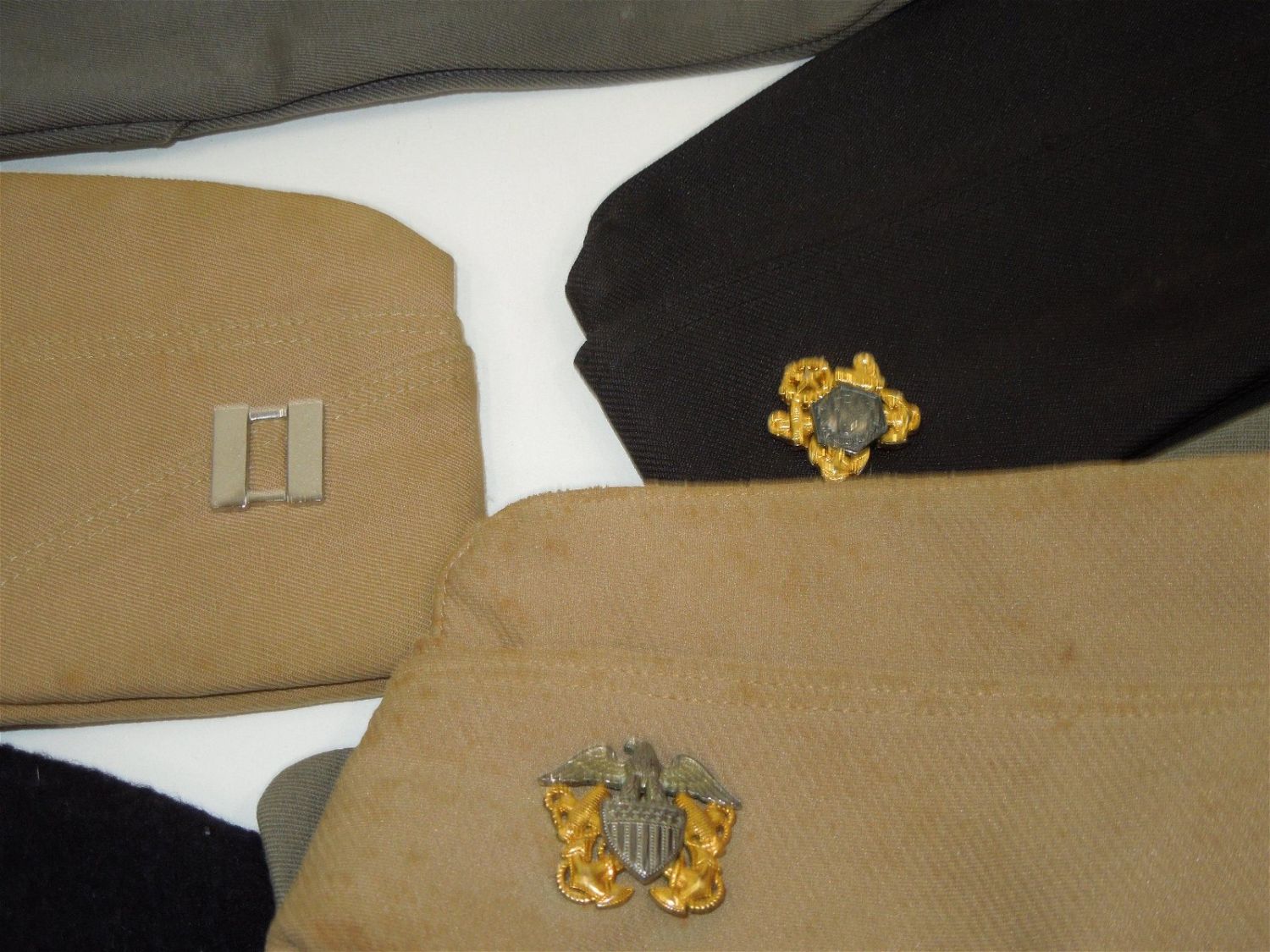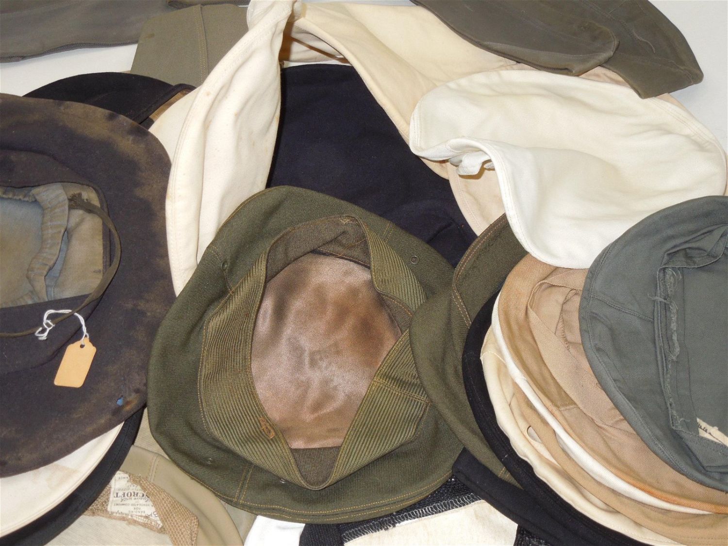 WWII-1970s Army & Navy Garrison Overseas Hats Lot of 18. The lot includes: Navy V-5 Khaki (Aviation Cadet Training Program named to John D. Owens), Navy Officer Khaki overseas cap with Navy device & captain bars, Khaki hat with captain bars and marked Bancroft, (2) tan hats with stamp CDR Taylor, (3) black overseas hat with Insignia named to Haggerty (7 1/2) and marked Bernard. These hats are from the Maine Maritime Academy. This cap has the academys 1941 Insignia. The other two caps are marked Naval Uniform Service (7 1/8) and S. Appel & Co. White hat (dirty & stained) Wolbro (7 1/8), tan hat named to Edward Stanwood (dirty and stained), Bayly marked hat, (2) Olive hats sized 6 7/8, (3) Olive hats size 7, plus more. Conditions vary. Look over photo to see what you will receive.. WWII Era USN Navy Hat Cap Visor Rain Covers. You will receive the following lot of 5 covers. White Bancroft E-Z Fit Cover (20WB Large). Age marks on the top. White cover named on the inside to: Stanwood E K. No size given. Discoloration from age. Bernard marked white cover snap cap. Size medium. Good condition consistent for its age. Bancroft Cover Ban-Vent. No size given. Nice condition. Rain Visor cover. Size is 7 1/4 inches. Used condition. You will also receive a stretch hoop. Diameter is 12 inches. US WWII – Vietnam Military Covers Navy, Army, & Marines large lot of 17. Some of the names, makers and sizes seen include the following: Alfred, John Thomas. Makers: Bernard Cap Company Inc, Chrisfield Cap CO. Khaki, Art Caps, Defense Personnel Support Center. Sizes: 6 3/4, 7 (2), 7 1/8, 7 1/4 (2), 7 3/8 and 7 1/2 inches. Others have no size or makers. Overall, good condition for the time period and different usages. Some pieces have spots and stains.