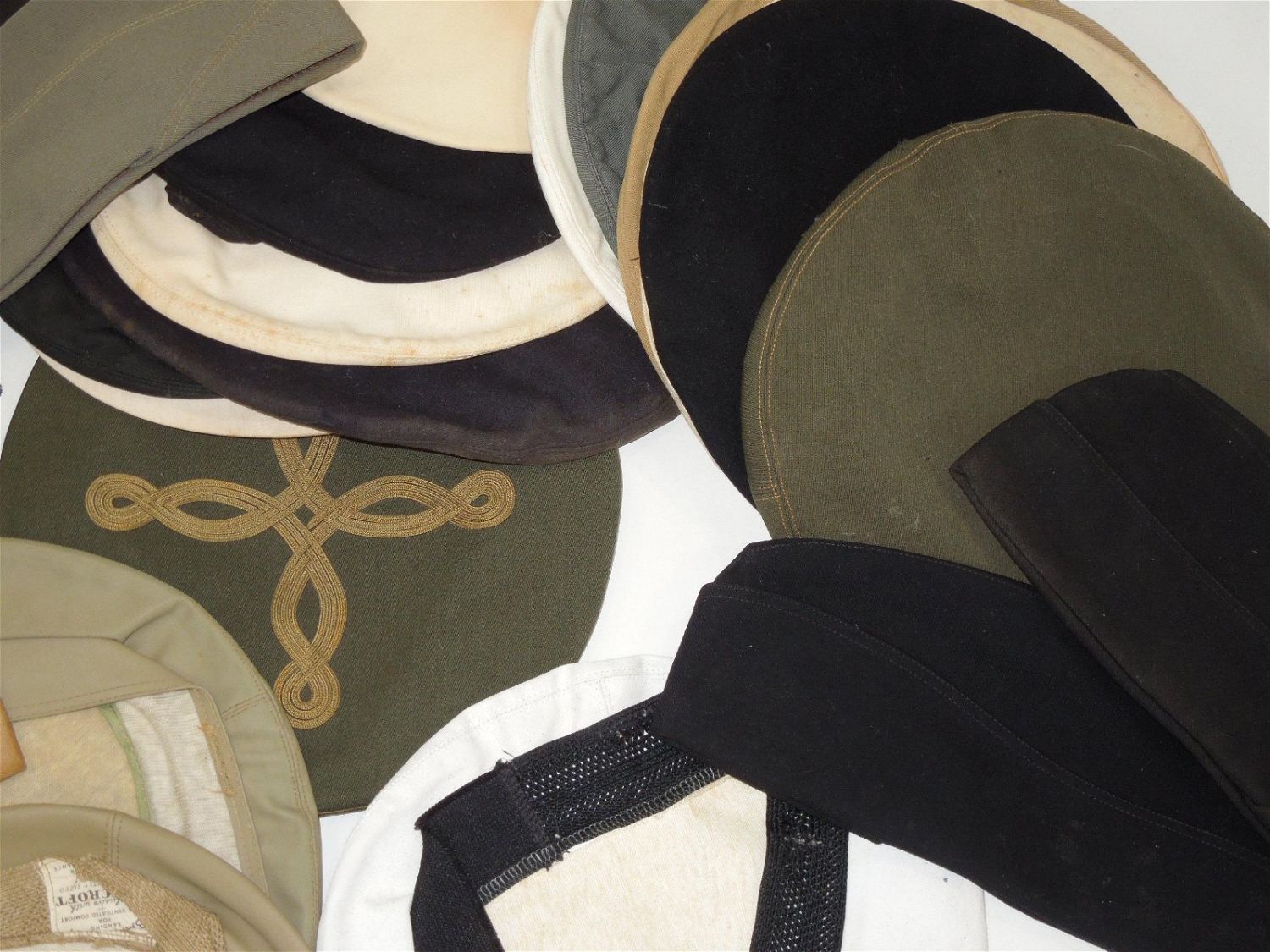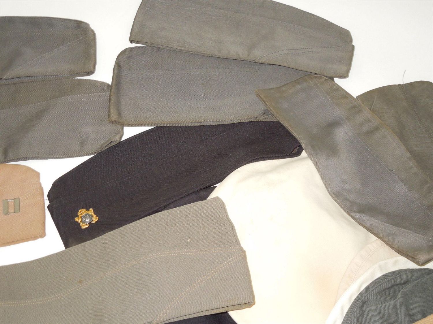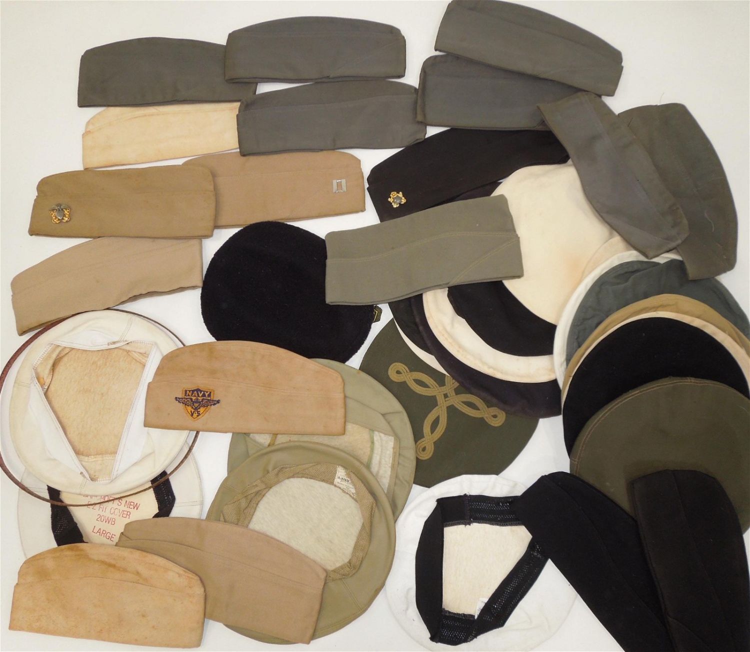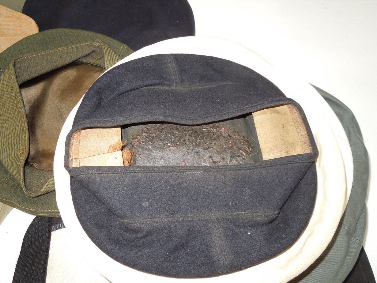 WWII-1970s Army & Navy Garrison Overseas Hats Lot of 18. The lot includes: Navy V-5 Khaki (Aviation Cadet Training Program named to John D. Owens), Navy Officer Khaki overseas cap with Navy device & captain bars, Khaki hat with captain bars and marked Bancroft, (2) tan hats with stamp CDR Taylor, (3) black overseas hat with Insignia named to Haggerty (7 1/2) and marked Bernard. These hats are from the Maine Maritime Academy. This cap has the academys 1941 Insignia. The other two caps are marked Naval Uniform Service (7 1/8) and S. Appel & Co. White hat (dirty & stained) Wolbro (7 1/8), tan hat named to Edward Stanwood (dirty and stained), Bayly marked hat, (2) Olive hats sized 6 7/8, (3) Olive hats size 7, plus more. Conditions vary. Look over photo to see what you will receive.. WWII Era USN Navy Hat Cap Visor Rain Covers. You will receive the following lot of 5 covers. White Bancroft E-Z Fit Cover (20WB Large). Age marks on the top. White cover named on the inside to: Stanwood E K. No size given. Discoloration from age. Bernard marked white cover snap cap. Size medium. Good condition consistent for its age. Bancroft Cover Ban-Vent. No size given. Nice condition. Rain Visor cover. Size is 7 1/4 inches. Used condition. You will also receive a stretch hoop. Diameter is 12 inches. US WWII – Vietnam Military Covers Navy, Army, & Marines large lot of 17. Some of the names, makers and sizes seen include the following: Alfred, John Thomas. Makers: Bernard Cap Company Inc, Chrisfield Cap CO. Khaki, Art Caps, Defense Personnel Support Center. Sizes: 6 3/4, 7 (2), 7 1/8, 7 1/4 (2), 7 3/8 and 7 1/2 inches. Others have no size or makers. Overall, good condition for the time period and different usages. Some pieces have spots and stains.