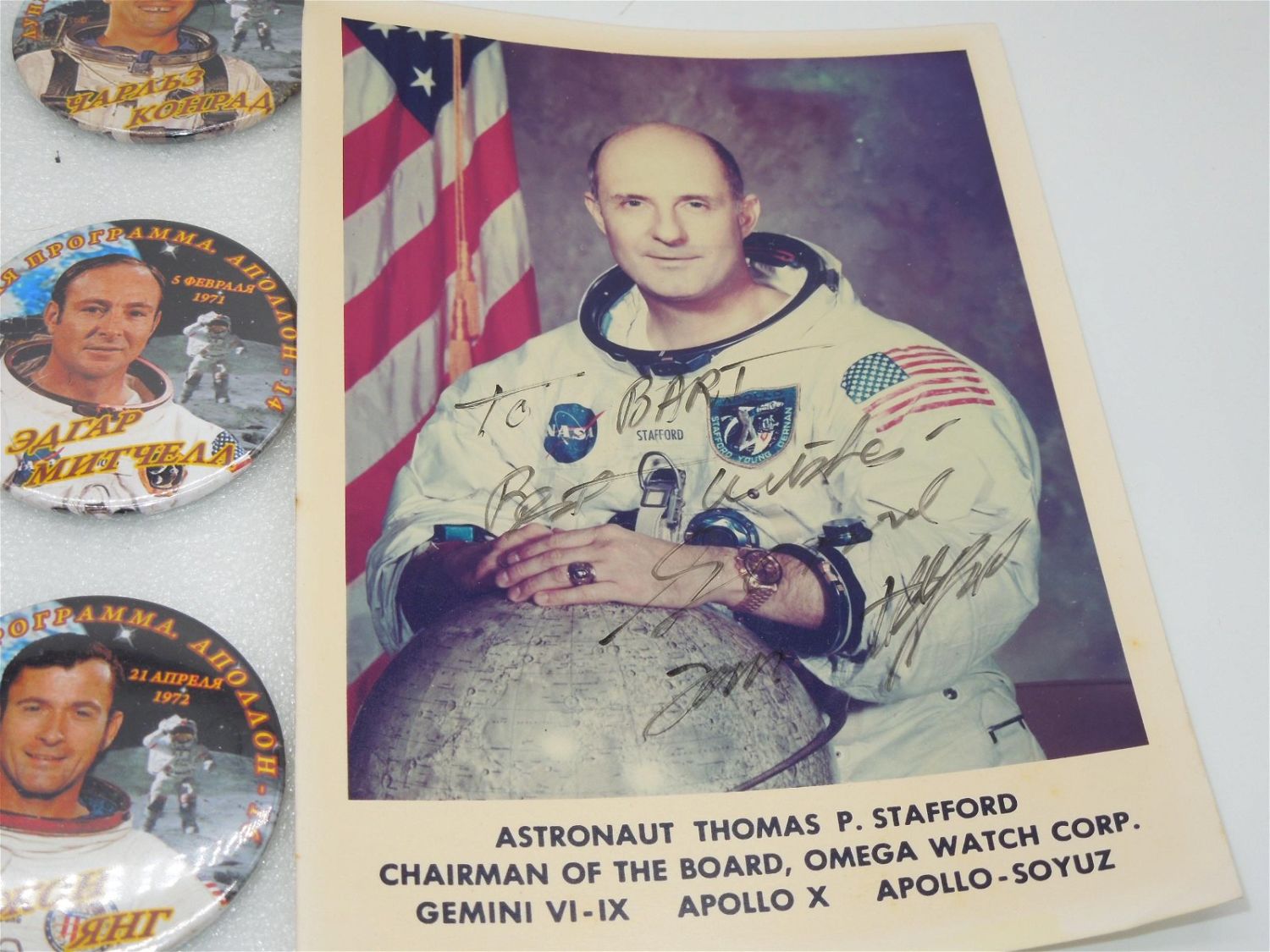 Original 5 x 7 inch photo (curve to it from age) signed by Astronaut Thomas P. Stafford, Chairman of the Board, Omega Watch Corp, and crew member of Gemini VI-IX, Apollo X, and Apollo-Soyuz. Lot of 12 original buttons depicting US NASA astronauts, with Russian writing on them. Good condition.