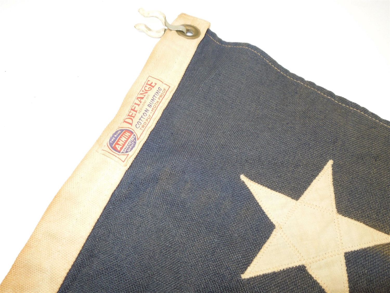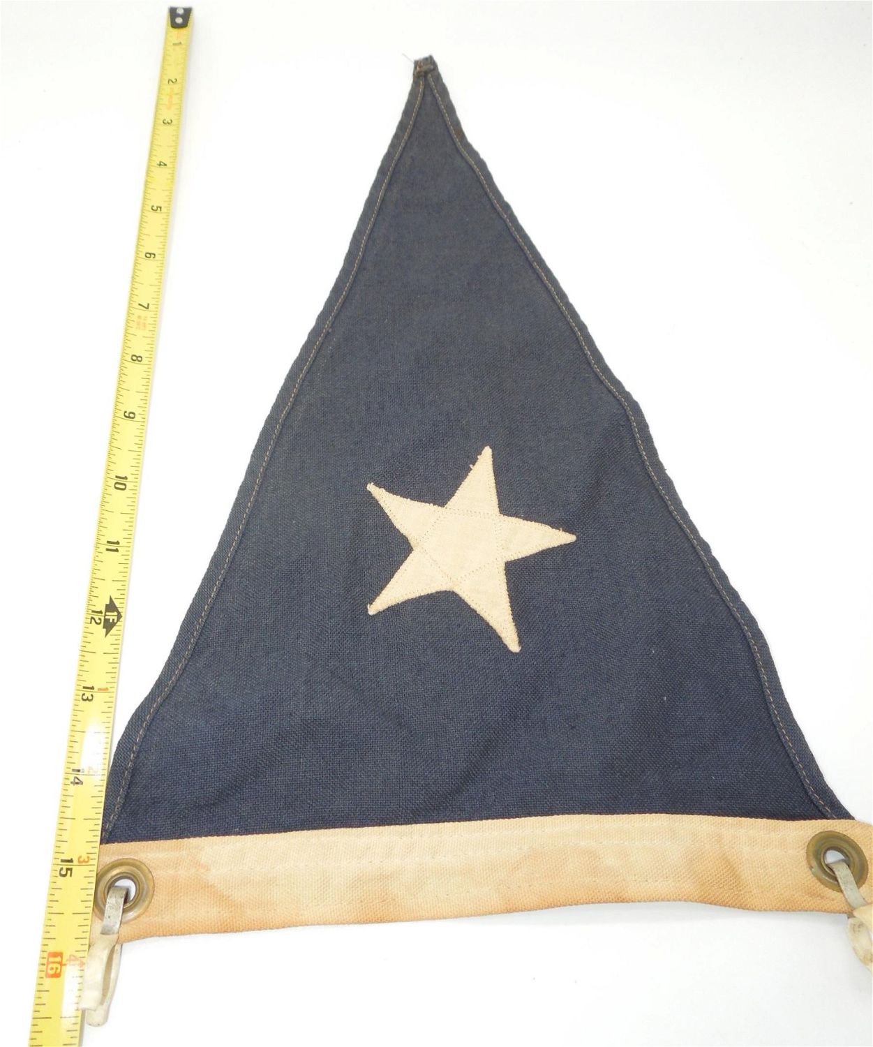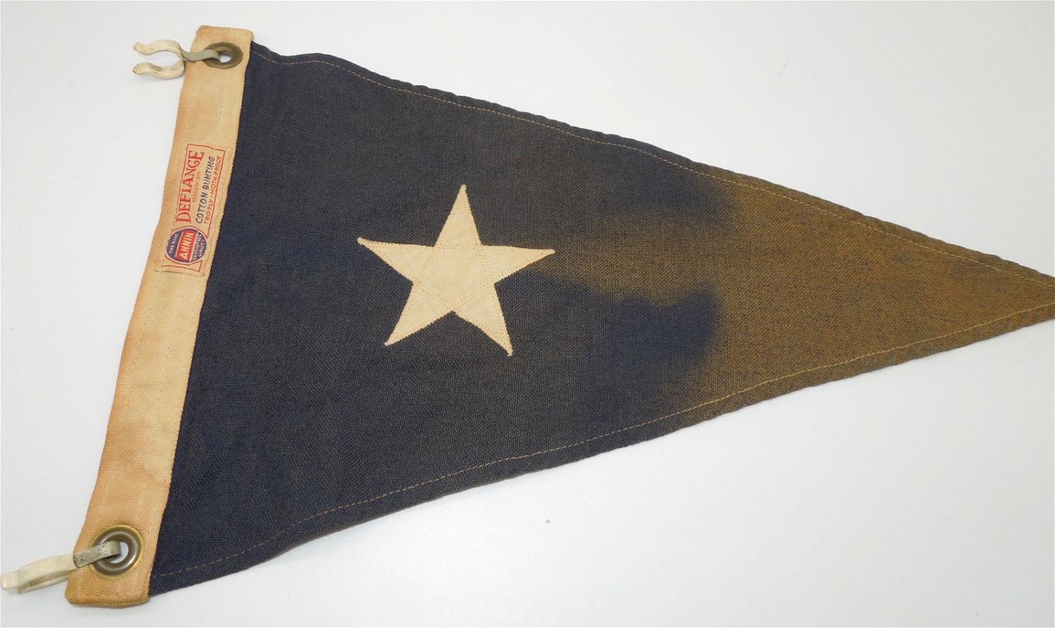 WWII USN Navy one star Admiral Commodore Car pennant. Manufactured by Defiange Cotton Bunting. There is fading on one side. Otherwise, good displayable condition. Approximate size is 9.75 x 15 inches.